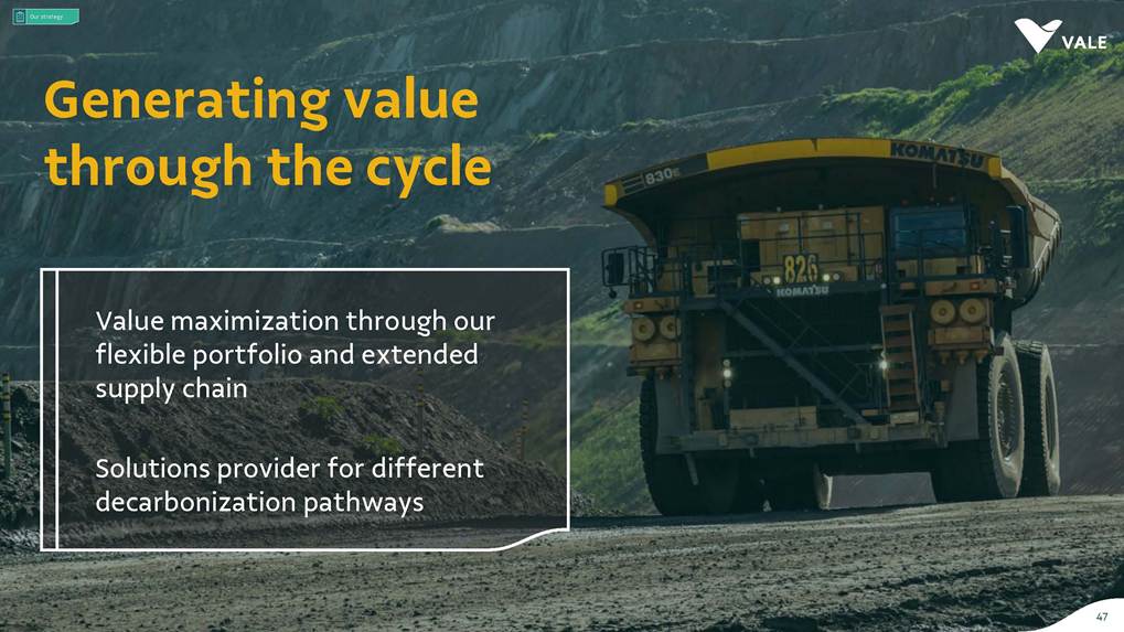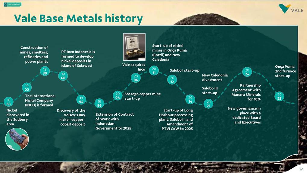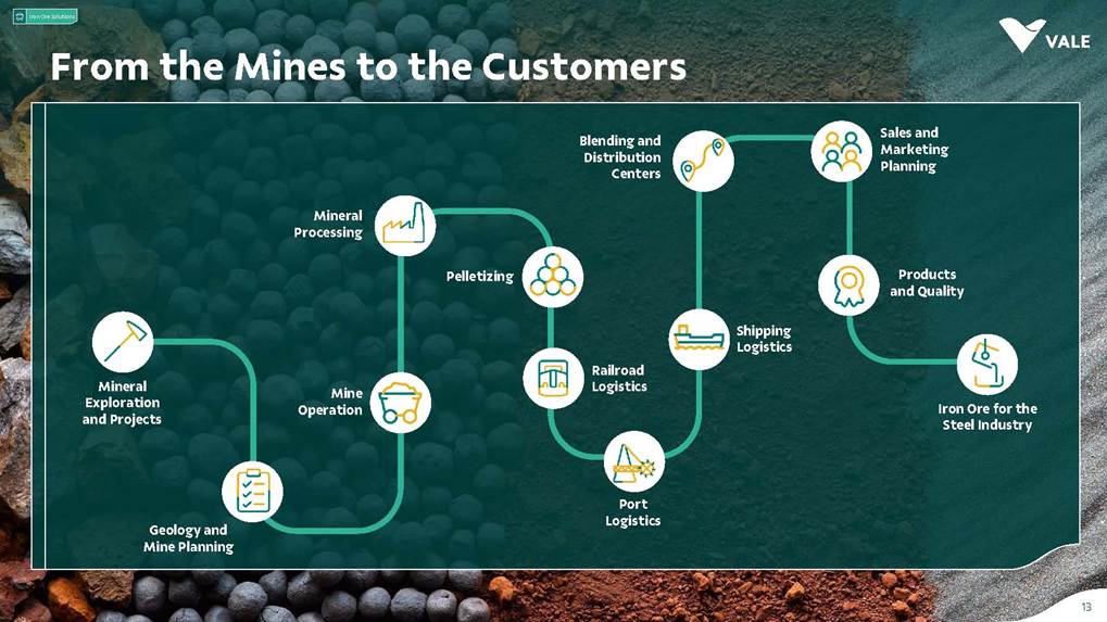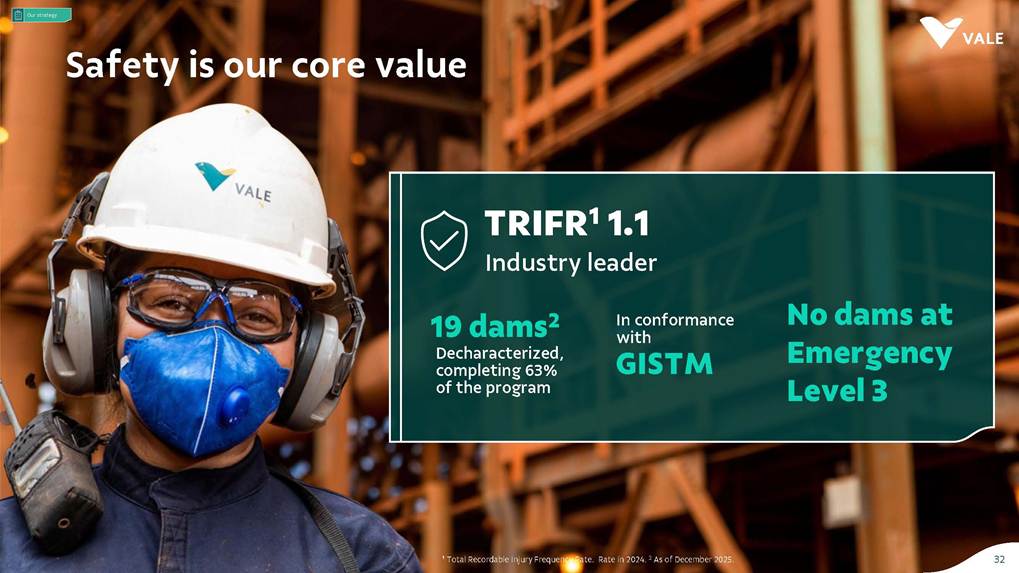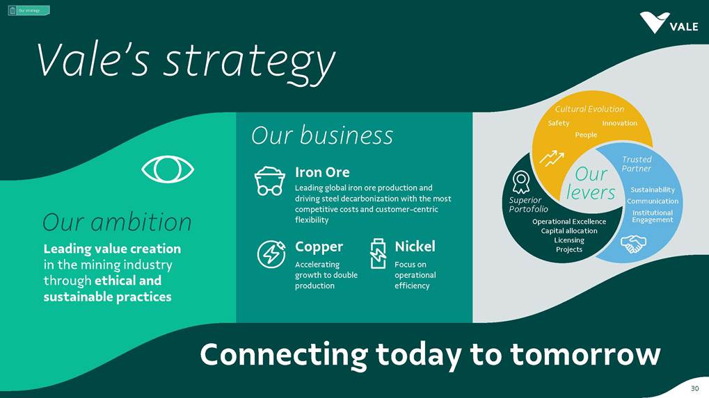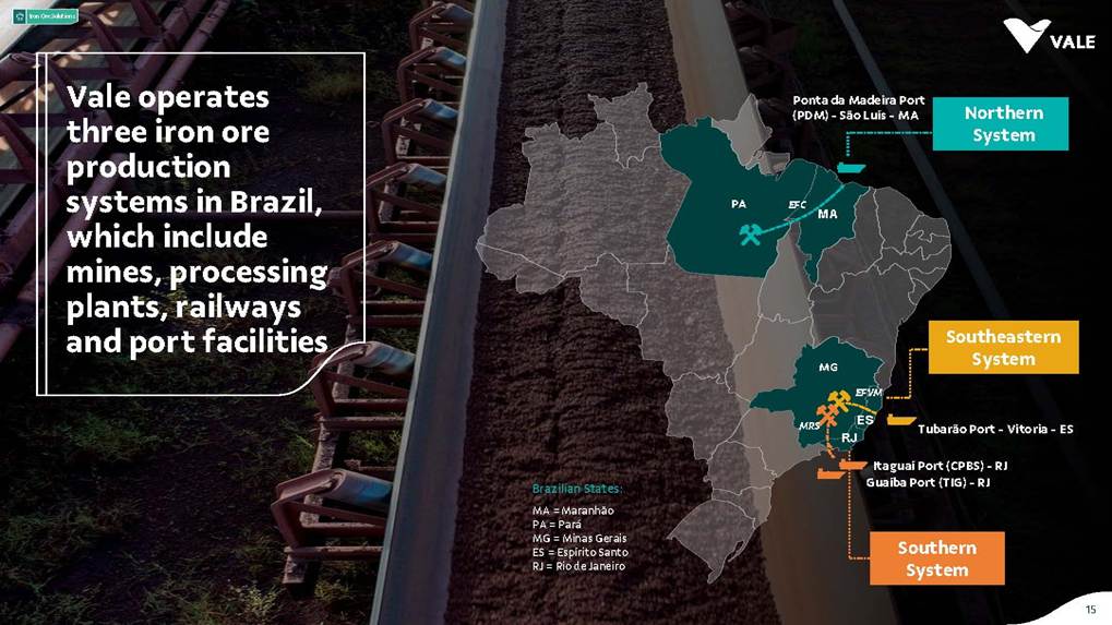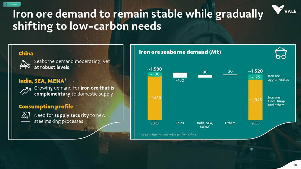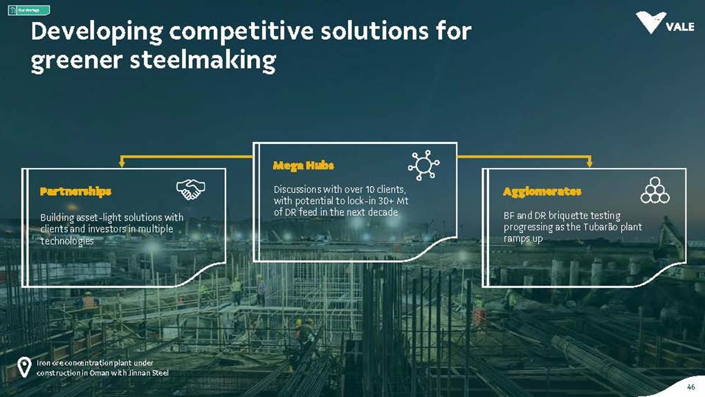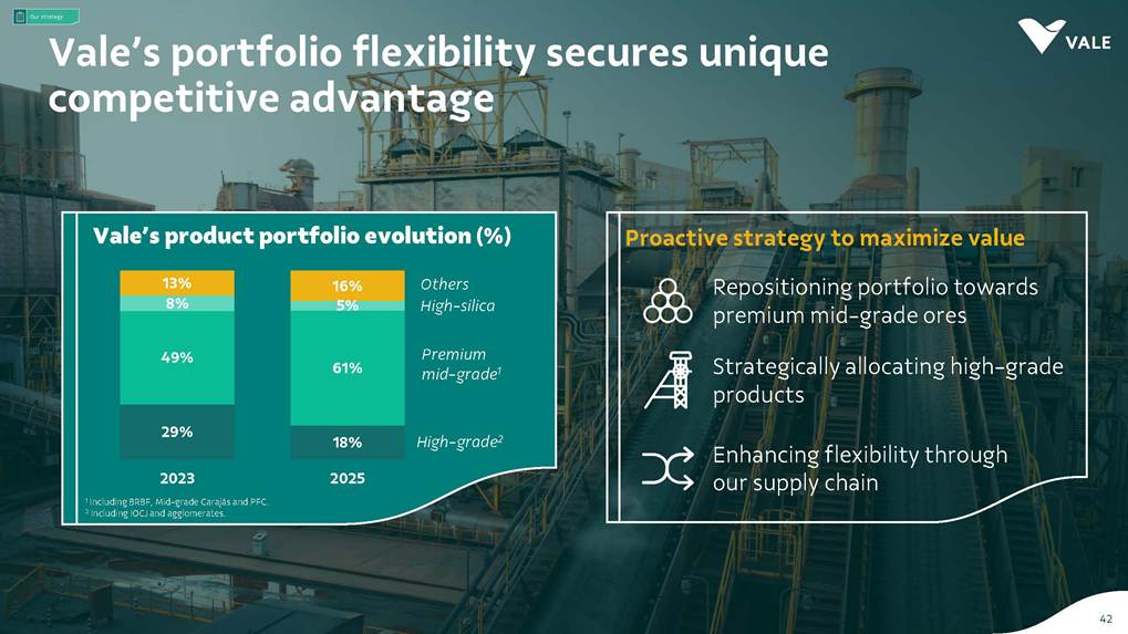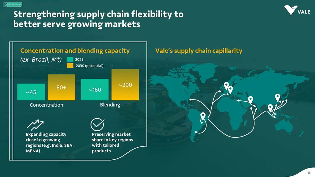 1 Institutional Presentation Investor Relations December 2025 2 AboutVale ESG Iron OreSolutions Vale Base Metals OurStrategy Capital Allocation AboutVale 3 #2 in iron ore production ~20% of seaborne market #6in nickel production Largestiron ore pellet producer #11 in copper reserves ~20 Bt We are one of the leadingIron ore, Nickel and Copper producers globally Note: As of 2024. About Vale 4 Vale at a glance About Vale 328MtIron ore 37MtPellets 348ktCopper 160ktNickel 2024 Production US$ 38.1 bn Net operating revenue in 2024 Expanded net debt of US$ 16.6 bn as of October 31, 2025 100% of electricity consumed in Brazil from renewable sources US$ 15.4 bn Proforma EBITDA in 2024 US$ 6.0 bn CAPEX in 2024 Industry leader in TRIFR (1.1) in 2024 US$ 3.9 bn in dividends & Interest on Capital paid in 2024 19 of 30 dams Decharacterized1 and no dams at Emergency Level 3 US$ 0.4 bn Disbursed on share buybacks in 2024 Key Markets – by revenue (2024) 11% 12% 18% 49% 3% Middle East 3% Rest of the world 4% North America SouthAmerica Europe Asia ex-China China Workforce of 64 thousand direct employees in 2024 5 1 As of Dec 2025. Australia Oman U.A.E. Malaysia India Singapore Japan USA Chile Brazil Argentina¹ Peru Diversified shareholder base and strong governance Note: Previ is a shareholder of Litel Participações S.A. (Litel) and Litela Participações S.A. (Litela), which w r p rt of V ’s form r contro group. B ckrock is r port consi ring Sch u 1 F, fi with th SEC on F b 15, 5, n Br sco’s t b s estimate on December 31, 2024. Treasury: position held by the companies MBR S.A., Vale Holdings B.V. and Vale S.A. The number of shares is presented based on the information contained in the share books of Vale. 6.0% Treasury 8.7% Previ 6.3% Mitsui&Co 6.1% Blackrock 72.9% Others Shareholder structure Novo Mercado B3's highest corporate governance segment. Vale's shareholder composition November 2025 Stock Exchanges B3 (Brazil) - VALE3 NYSE (ADR) - VALE Shareholders with 5% or more of the total capital Others − Majority independent BoD − All BoD members are non-executive directors − Chairman and Vice-Chairman are elected by shareholders − Audit and Risks Committee entirely composed of independent Board members. − Lead Independent Director role − Nominating Committee defines BoD nominees Best governance practices 7 About Vale Corporate Governance About Vale Executive Board Board of Directors1 CEO Gustavo Pimenta Finance & IR EVP Marcelo Bacci IO OperationsEVP Carlos Medeiros Commercial and New Business EVP Rogério Nogueira Technical EVP Rafael Bittar People EVP Samanta Pillar Legal AffairsEVP Sami Arap SustainabilityEVP Grazielle Parenti Click here to cc ss th fu inform tion bout V ’s Bo r of Dir ctors n Ex cuti Bo r . 1 The data takes into account the composition of the Board of Directors on May 7th, 2025. 2.7 years Average Tenure 13 Members 8 (62%) Independent Members 3 Women 4 Racially/ethnically diverse 4 Non Brazilians 8 Our journey Vale doRio Doce was founded Tubarão port inauguration CVRD rebranding to About Vale 9 1942 1956 1967 1969 1985 1997 2006 2009 Carajás discovery First pellet production 1st ore producedat Carajás and inauguration of the Carajás Railway (EFC) CVRD’s privatization INCOacquisition Our journey S11D operations start-up Samarco’s dam collapse 2010 2011 2015 2016 2017 2018 2019 2021 2023 2024 2025 Oman operations start-up Portfolio: divesting the aluminum business Governance: Migration to the Novo Mercado Portfolio: divesting the fertilizer business Portfolio: divesting the manganese business and Brumadinho’s dam collapse Portfolio: divesting the coal business Briquette operations start up and Base Metals Carve-out Vargem Grande and Capanema project start-ups Novo Carajás program About Vale 10 A focused companywith two unique and irreplicable businesses Vale Today About Vale 11 Iron Ore Solutions Vale Base Metals Iron OreSolutions 12 From the Mines to the Customers 13 Iron Ore Solutions Mineral Explorationand Projects Geology and Mine Planning Mine Operation Mineral Processing Pelletizing Railroad Logistics Port Logistics Shipping Logistics Blending and Distribution Centers Sales and Marketing Planning Products and Quality Iron Ore for the Steel Industry Vale’s mai ir re pr ucts Iron Ore Solutions Iron ore fines Carajás fines Brazilian Blend Fines Pellet Feed China (PFC) − 65% Fe − Low contaminants (silica, alumina and others) − Mined from the Northern System − 63% Fe − Low-alumina − Produced from blending Carajás and high-silica fines − ~63% Fe − Low-alumina − Pellet feed concentrated in Chinese facilities Mid-Grade Carajás − ~63% Fe − Low-alumina and Low-phosphorus − Mined from the Northern System Direct Reduction pellets Blast Furnace pellets BriquettesDeveloped by Vale − Agglomerates for direct charge in Direct Reduction Furnaces − Agglomerates for direct charge in Blast Furnaces − Same application as pellets in BF and DR furnaces − Lower CO2 emissions compared to pellet production − Commercial production ramping-up Agglomerates 14 Brazilian States: MA = Maranhão PA = Pará MG = Minas Gerais ES = Espírito Santo RJ = Rio de Janeiro Iron Ore Solutions 15 Vale operates three iron ore production systems in Brazil, which include mines, processing plants, railways and port facilities Southern System PA MG EFC EFVM MRS Ponta da Madeira Port (PDM) - São Luís - MA Tubarão Port - Vitoria - ES Itaguaí Port (CPBS) - RJ Guaíba Port (TIG) - RJ MA RJ ES Northern System Southeastern System Vale operates three iron ore production systems in Brazil Note: EFC is the Carajás Railway and EFVM is the Vitória-Min s R i w . MRS is V ’s r i w subsi i r . Northern System Southeastern System Southern System − 3 mining complexes − EFC - 997 km railway − 5 berths (3 Valemax berths) Serra Norte Serra Sul Serra Leste Carajás National Forest Cauê Belo Horizonte Conceição Alegria Timbopeba Brucutu Água Limpa Fazendão Itabi