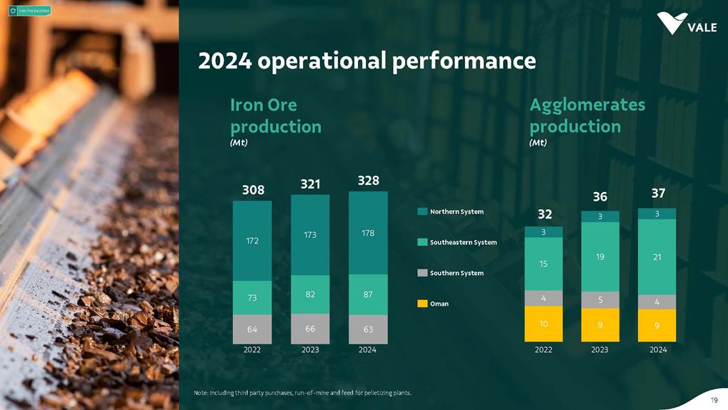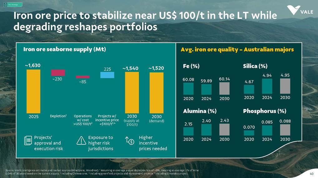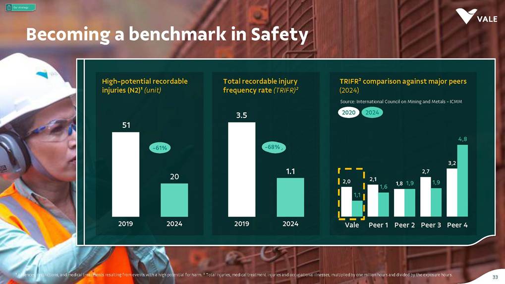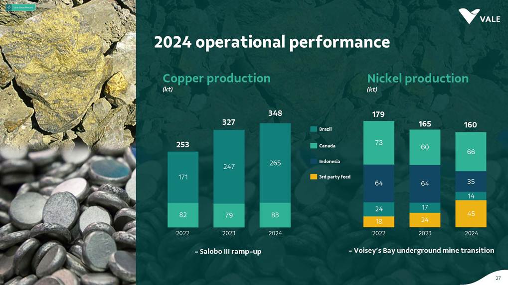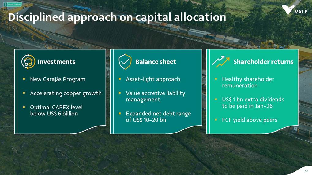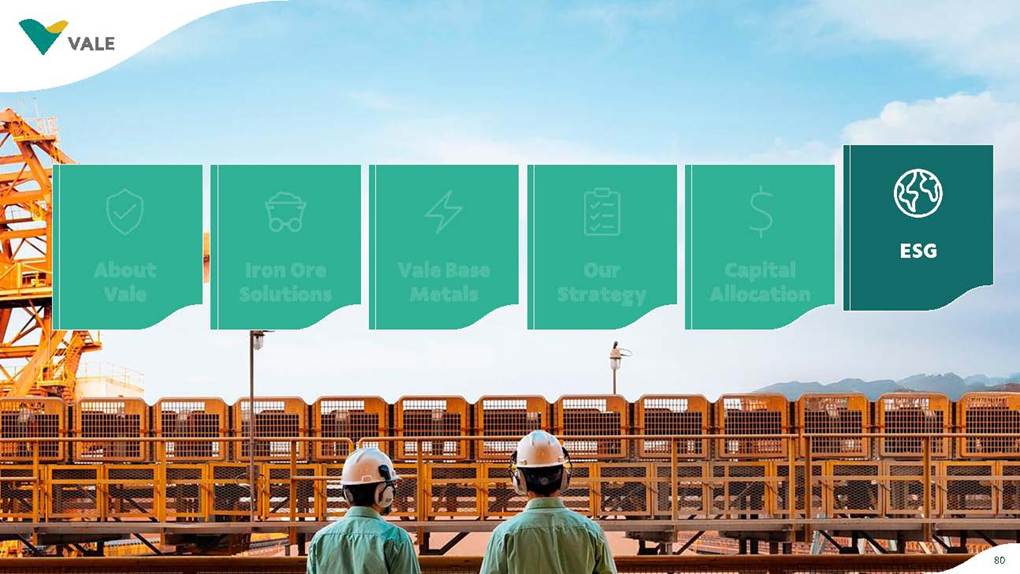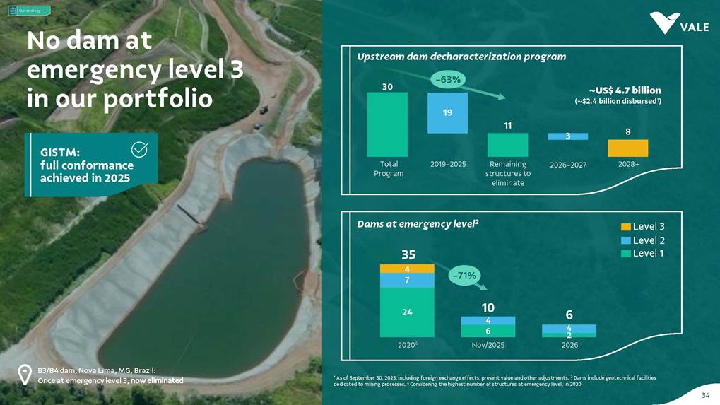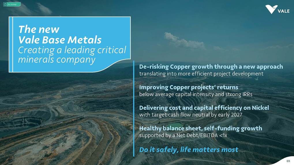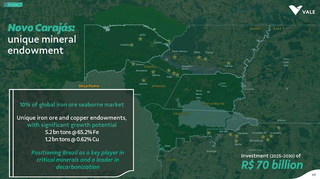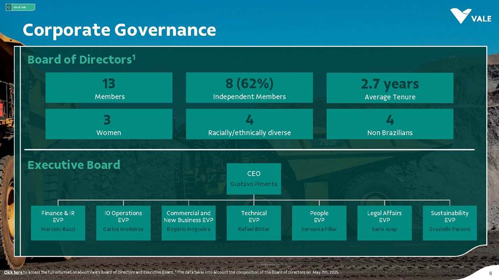 1 Institutional Presentation Investor Relations December 2025 2 AboutVale ESG Iron OreSolutions Vale Base Metals OurStrategy Capital Allocation AboutVale 3 #2 in iron ore production ~20% of seaborne market #6in nickel production Largestiron ore pellet producer #11 in copper reserves ~20 Bt We are one of the leadingIron ore, Nickel and Copper producers globally Note: As of 2024. About Vale 4 Vale at a glance About Vale 328MtIron ore 37MtPellets 348ktCopper 160ktNickel 2024 Production US$ 38.1 bn Net operating revenue in 2024 Expanded net debt of US$ 16.6 bn as of October 31, 2025 100% of electricity consumed in Brazil from renewable sources US$ 15.4 bn Proforma EBITDA in 2024 US$ 6.0 bn CAPEX in 2024 Industry leader in TRIFR (1.1) in 2024 US$ 3.9 bn in dividends & Interest on Capital paid in 2024 19 of 30 dams Decharacterized1 and no dams at Emergency Level 3 US$ 0.4 bn Disbursed on share buybacks in 2024 Key Markets – by revenue (2024) 11% 12% 18% 49% 3% Middle East 3% Rest of the world 4% North America SouthAmerica Europe Asia ex-China China Workforce of 64 thousand direct employees in 2024 5 1 As of Dec 2025. Australia Oman U.A.E. Malaysia India Singapore Japan USA Chile Brazil Argentina¹ Peru Diversified shareholder base and strong governance Note: Previ is a shareholder of Litel Participações S.A. (Litel) and Litela Participações S.A. (Litela), which w r p rt of V ’s form r contro group. B ckrock is r port consi ring Sch u 1 F, fi with th SEC on F b 15, 5, n Br sco’s t b s estimate on December 31, 2024. Treasury: position held by the companies MBR S.A., Vale Holdings B.V. and Vale S.A. The number of shares is presented based on the information contained in the share books of Vale. 6.0% Treasury 8.7% Previ 6.3% Mitsui&Co 6.1% Blackrock 72.9% Others Shareholder structure Novo Mercado B3's highest corporate governance segment. Vale's shareholder composition November 2025 Stock Exchanges B3 (Brazil) - VALE3 NYSE (ADR) - VALE Shareholders with 5% or more of the total capital Others − Majority independent BoD − All BoD members are non-executive directors − Chairman and Vice-Chairman are elected by shareholders − Audit and Risks Committee entirely composed of independent Board members. − Lead Independent Director role − Nominating Committee defines BoD nominees Best governance practices 7 About Vale Corporate Governance About Vale Executive Board Board of Directors1 CEO Gustavo Pimenta Finance & IR EVP Marcelo Bacci IO OperationsEVP Carlos Medeiros Commercial and New Business EVP Rogério Nogueira Technical EVP Rafael Bittar People EVP Samanta Pillar Legal AffairsEVP Sami Arap SustainabilityEVP Grazielle Parenti Click here to cc ss th fu inform tion bout V ’s Bo r of Dir ctors n Ex cuti Bo r . 1 The data takes into account the composition of the Board of Directors on May 7th, 2025. 2.7 years Average Tenure 13 Members 8 (62%) Independent Members 3 Women 4 Racially/ethnically diverse 4 Non Brazilians 8 Our journey Vale doRio Doce was founded Tubarão port inauguration CVRD rebranding to About Vale 9 1942 1956 1967 1969 1985 1997 2006 2009 Carajás discovery First pellet production 1st ore producedat Carajás and inauguration of the Carajás Railway (EFC) CVRD’s privatization INCOacquisition Our journey S11D operations start-up Samarco’s dam collapse 2010 2011 2015 2016 2017 2018 2019 2021 2023 2024 2025 Oman operations start-up Portfolio: divesting the aluminum business Governance: Migration to the Novo Mercado Portfolio: divesting the fertilizer business Portfolio: divesting the manganese business and Brumadinho’s dam collapse Portfolio: divesting the coal business Briquette operations start up and Base Metals Carve-out Vargem Grande and Capanema project start-ups Novo Carajás program About Vale 10 A focused companywith two unique and irreplicable businesses Vale Today About Vale 11 Iron Ore Solutions Vale Base Metals Iron OreSolutions 12 From the Mines to the Customers 13 Iron Ore Solutions Mineral Explorationand Projects Geology and Mine Planning Mine Operation Mineral Processing Pelletizing Railroad Logistics Port Logistics Shipping Logistics Blending and Distribution Centers Sales and Marketing Planning Products and Quality Iron Ore for the Steel Industry Vale’s mai ir re pr ucts Iron Ore Solutions Iron ore fines Carajás fines Brazilian Blend Fines Pellet Feed China (PFC) − 65% Fe − Low contaminants (silica, alumina and others) − Mined from the Northern System − 63% Fe − Low-alumina − Produced from blending Carajás and high-silica fines − ~63% Fe − Low-alumina − Pellet feed concentrated in Chinese facilities Mid-Grade Carajás − ~63% Fe − Low-alumina and Low-phosphorus − Mined from the Northern System Direct Reduction pellets Blast Furnace pellets BriquettesDeveloped by Vale − Agglomerates for direct charge in Direct Reduction Furnaces − Agglomerates for direct charge in Blast Furnaces − Same application as pellets in BF and DR furnaces − Lower CO2 emissions compared to pellet production − Commercial production ramping-up Agglomerates 14 Brazilian States: MA = Maranhão PA = Pará MG = Minas Gerais ES = Espírito Santo RJ = Rio de Janeiro Iron Ore Solutions 15 Vale operates three iron ore production systems in Brazil, which include mines, processing plants, railways and port facilities Southern System PA MG EFC EFVM MRS Ponta da Madeira Port (PDM) - São Luís - MA Tubarão Port - Vitoria - ES Itaguaí Port (CPBS) - RJ Guaíba Port (TIG) - RJ MA RJ ES Northern System Southeastern System Vale operates three iron ore production systems in Brazil Note: EFC is the Carajás Railway and EFVM is the Vitória-Min s R i w . MRS is V ’s r i w subsi i r . Northern System Southeastern System Southern System − 3 mining complexes − EFC - 997 km railway − 5 berths (3 Valemax berths) Serra Norte Serra Sul Serra Leste Carajás National Forest Cauê Belo Horizonte Conceição Alegria Timbopeba Brucutu Água Limpa Fazendão Itabi