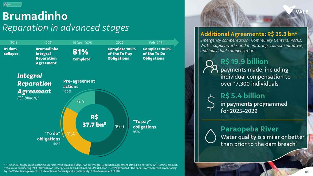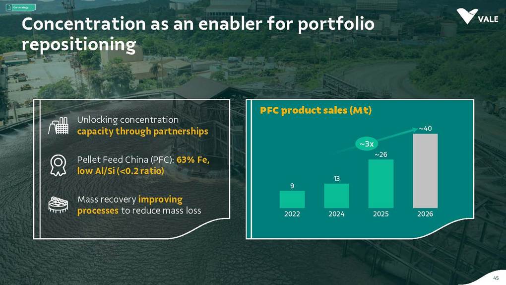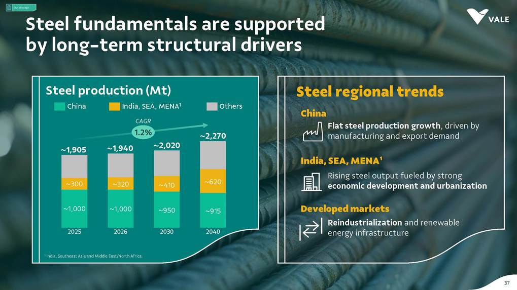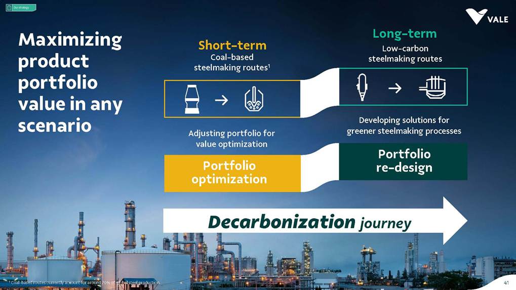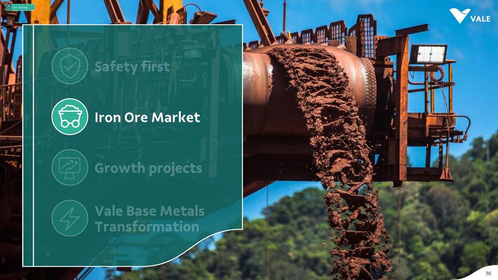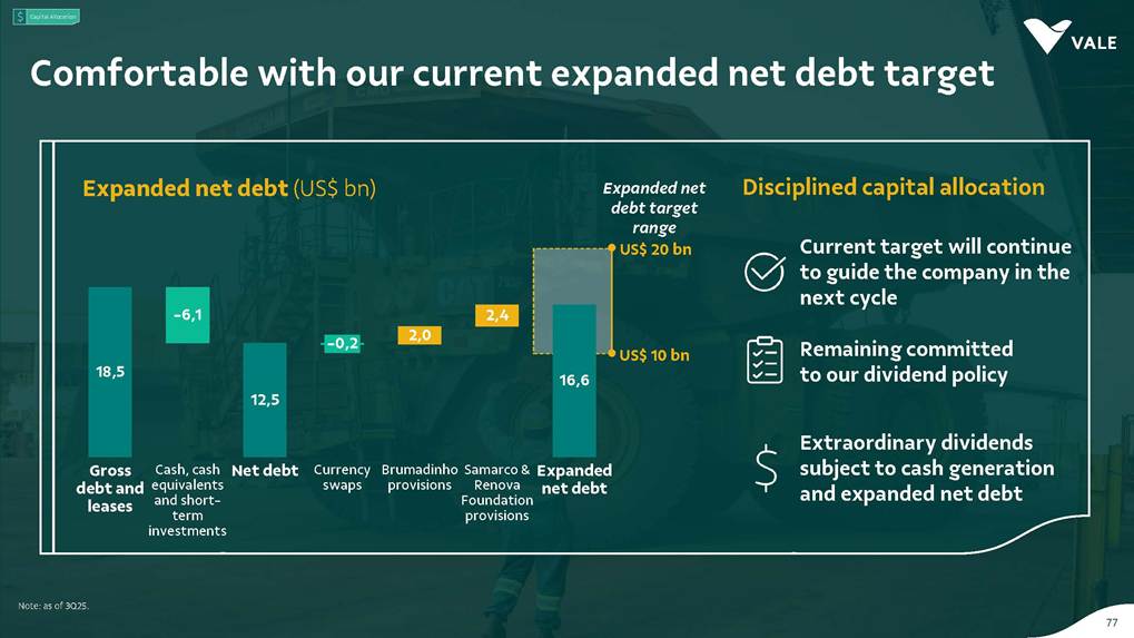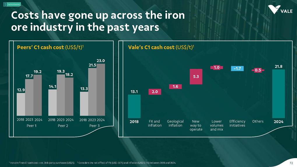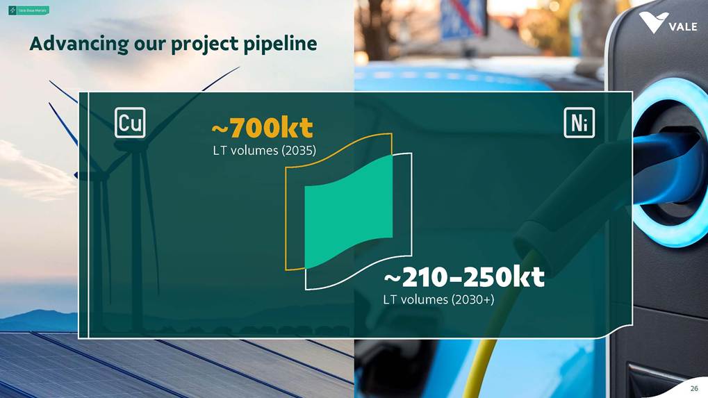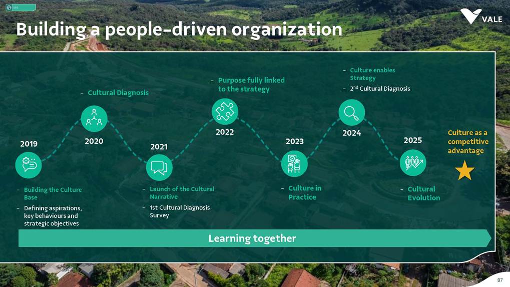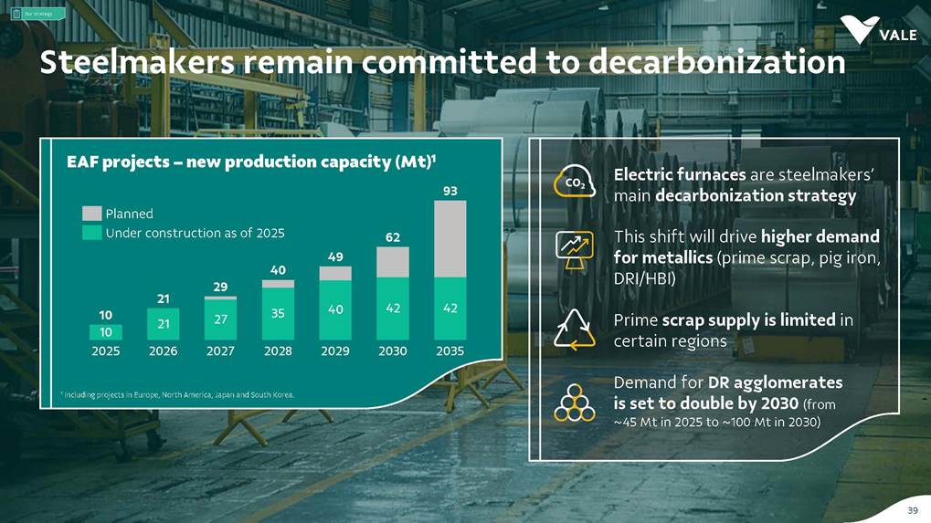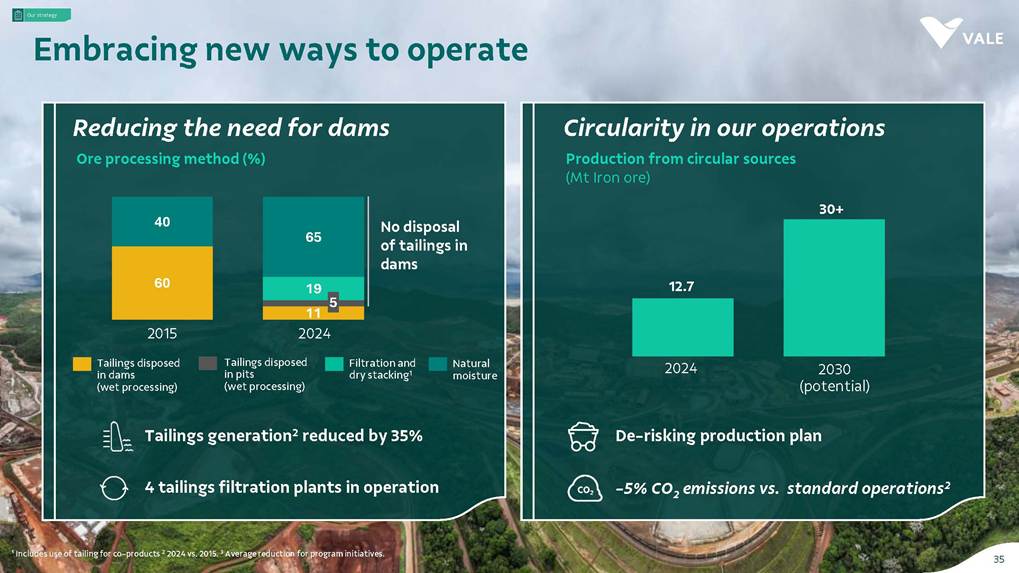 1 Institutional Presentation Investor Relations December 2025 2 AboutVale ESG Iron OreSolutions Vale Base Metals OurStrategy Capital Allocation AboutVale 3 #2 in iron ore production ~20% of seaborne market #6in nickel production Largestiron ore pellet producer #11 in copper reserves ~20 Bt We are one of the leadingIron ore, Nickel and Copper producers globally Note: As of 2024. About Vale 4 Vale at a glance About Vale 328MtIron ore 37MtPellets 348ktCopper 160ktNickel 2024 Production US$ 38.1 bn Net operating revenue in 2024 Expanded net debt of US$ 16.6 bn as of October 31, 2025 100% of electricity consumed in Brazil from renewable sources US$ 15.4 bn Proforma EBITDA in 2024 US$ 6.0 bn CAPEX in 2024 Industry leader in TRIFR (1.1) in 2024 US$ 3.9 bn in dividends & Interest on Capital paid in 2024 19 of 30 dams Decharacterized1 and no dams at Emergency Level 3 US$ 0.4 bn Disbursed on share buybacks in 2024 Key Markets – by revenue (2024) 11% 12% 18% 49% 3% Middle East 3% Rest of the world 4% North America SouthAmerica Europe Asia ex-China China Workforce of 64 thousand direct employees in 2024 5 1 As of Dec 2025. Australia Oman U.A.E. Malaysia India Singapore Japan USA Chile Brazil Argentina¹ Peru Diversified shareholder base and strong governance Note: Previ is a shareholder of Litel Participações S.A. (Litel) and Litela Participações S.A. (Litela), which w r p rt of V ’s form r contro group. B ckrock is r port consi ring Sch u 1 F, fi with th SEC on F b 15, 5, n Br sco’s t b s estimate on December 31, 2024. Treasury: position held by the companies MBR S.A., Vale Holdings B.V. and Vale S.A. The number of shares is presented based on the information contained in the share books of Vale. 6.0% Treasury 8.7% Previ 6.3% Mitsui&Co 6.1% Blackrock 72.9% Others Shareholder structure Novo Mercado B3's highest corporate governance segment. Vale's shareholder composition November 2025 Stock Exchanges B3 (Brazil) - VALE3 NYSE (ADR) - VALE Shareholders with 5% or more of the total capital Others − Majority independent BoD − All BoD members are non-executive directors − Chairman and Vice-Chairman are elected by shareholders − Audit and Risks Committee entirely composed of independent Board members. − Lead Independent Director role − Nominating Committee defines BoD nominees Best governance practices 7 About Vale Corporate Governance About Vale Executive Board Board of Directors1 CEO Gustavo Pimenta Finance & IR EVP Marcelo Bacci IO OperationsEVP Carlos Medeiros Commercial and New Business EVP Rogério Nogueira Technical EVP Rafael Bittar People EVP Samanta Pillar Legal AffairsEVP Sami Arap SustainabilityEVP Grazielle Parenti Click here to cc ss th fu inform tion bout V ’s Bo r of Dir ctors n Ex cuti Bo r . 1 The data takes into account the composition of the Board of Directors on May 7th, 2025. 2.7 years Average Tenure 13 Members 8 (62%) Independent Members 3 Women 4 Racially/ethnically diverse 4 Non Brazilians 8 Our journey Vale doRio Doce was founded Tubarão port inauguration CVRD rebranding to About Vale 9 1942 1956 1967 1969 1985 1997 2006 2009 Carajás discovery First pellet production 1st ore producedat Carajás and inauguration of the Carajás Railway (EFC) CVRD’s privatization INCOacquisition Our journey S11D operations start-up Samarco’s dam collapse 2010 2011 2015 2016 2017 2018 2019 2021 2023 2024 2025 Oman operations start-up Portfolio: divesting the aluminum business Governance: Migration to the Novo Mercado Portfolio: divesting the fertilizer business Portfolio: divesting the manganese business and Brumadinho’s dam collapse Portfolio: divesting the coal business Briquette operations start up and Base Metals Carve-out Vargem Grande and Capanema project start-ups Novo Carajás program About Vale 10 A focused companywith two unique and irreplicable businesses Vale Today About Vale 11 Iron Ore Solutions Vale Base Metals Iron OreSolutions 12 From the Mines to the Customers 13 Iron Ore Solutions Mineral Explorationand Projects Geology and Mine Planning Mine Operation Mineral Processing Pelletizing Railroad Logistics Port Logistics Shipping Logistics Blending and Distribution Centers Sales and Marketing Planning Products and Quality Iron Ore for the Steel Industry Vale’s mai ir re pr ucts Iron Ore Solutions Iron ore fines Carajás fines Brazilian Blend Fines Pellet Feed China (PFC) − 65% Fe − Low contaminants (silica, alumina and others) − Mined from the Northern System − 63% Fe − Low-alumina − Produced from blending Carajás and high-silica fines − ~63% Fe − Low-alumina − Pellet feed concentrated in Chinese facilities Mid-Grade Carajás − ~63% Fe − Low-alumina and Low-phosphorus − Mined from the Northern System Direct Reduction pellets Blast Furnace pellets BriquettesDeveloped by Vale − Agglomerates for direct charge in Direct Reduction Furnaces − Agglomerates for direct charge in Blast Furnaces − Same application as pellets in BF and DR furnaces − Lower CO2 emissions compared to pellet production − Commercial production ramping-up Agglomerates 14 Brazilian States: MA = Maranhão PA = Pará MG = Minas Gerais ES = Espírito Santo RJ = Rio de Janeiro Iron Ore Solutions 15 Vale operates three iron ore production systems in Brazil, which include mines, processing plants, railways and port facilities Southern System PA MG EFC EFVM MRS Ponta da Madeira Port (PDM) - São Luís - MA Tubarão Port - Vitoria - ES Itaguaí Port (CPBS) - RJ Guaíba Port (TIG) - RJ MA RJ ES Northern System Southeastern System Vale operates three iron ore production systems in Brazil Note: EFC is the Carajás Railway and EFVM is the Vitória-Min s R i w . MRS is V ’s r i w subsi i r . Northern System Southeastern System Southern System − 3 mining complexes − EFC - 997 km railway − 5 berths (3 Valemax berths) Serra Norte Serra Sul Serra Leste Carajás National Forest Cauê Belo Horizonte Conceição Alegria Timbopeba Brucutu Água Limpa Fazendão Itabi