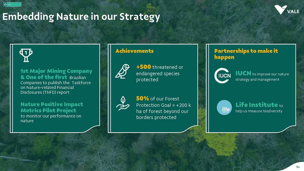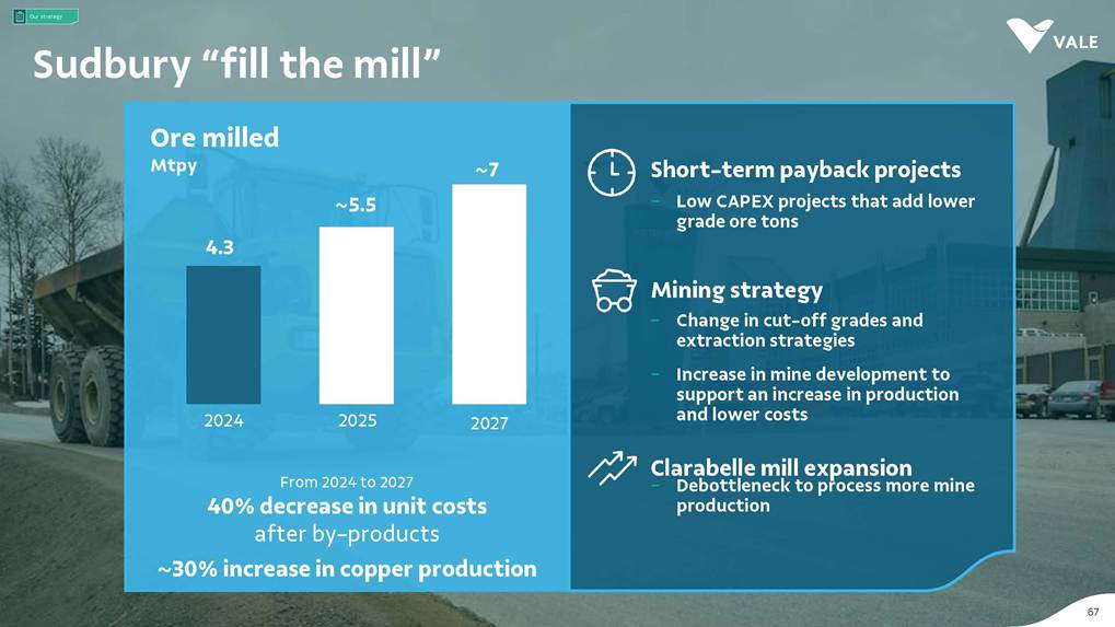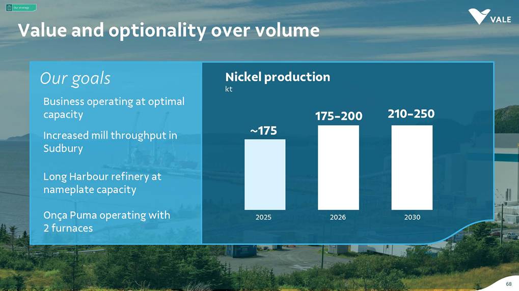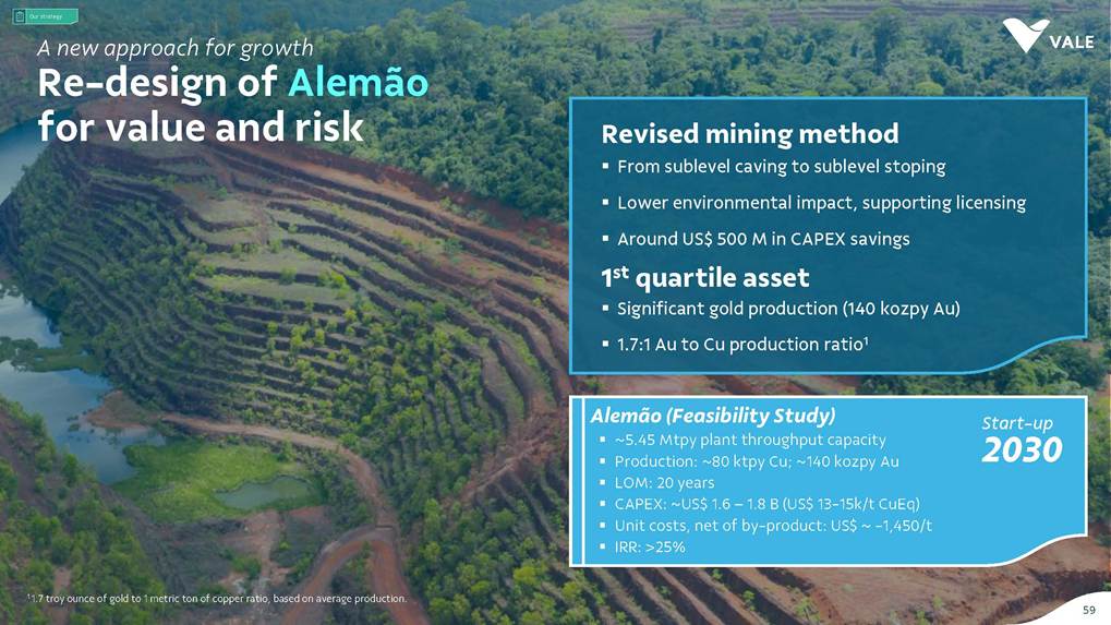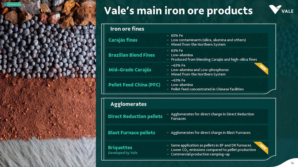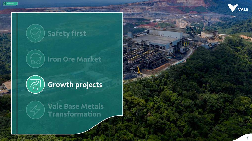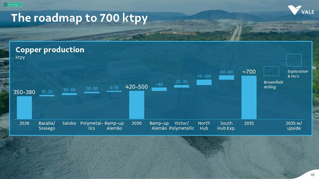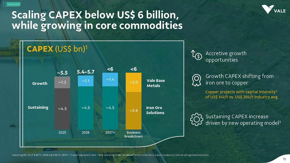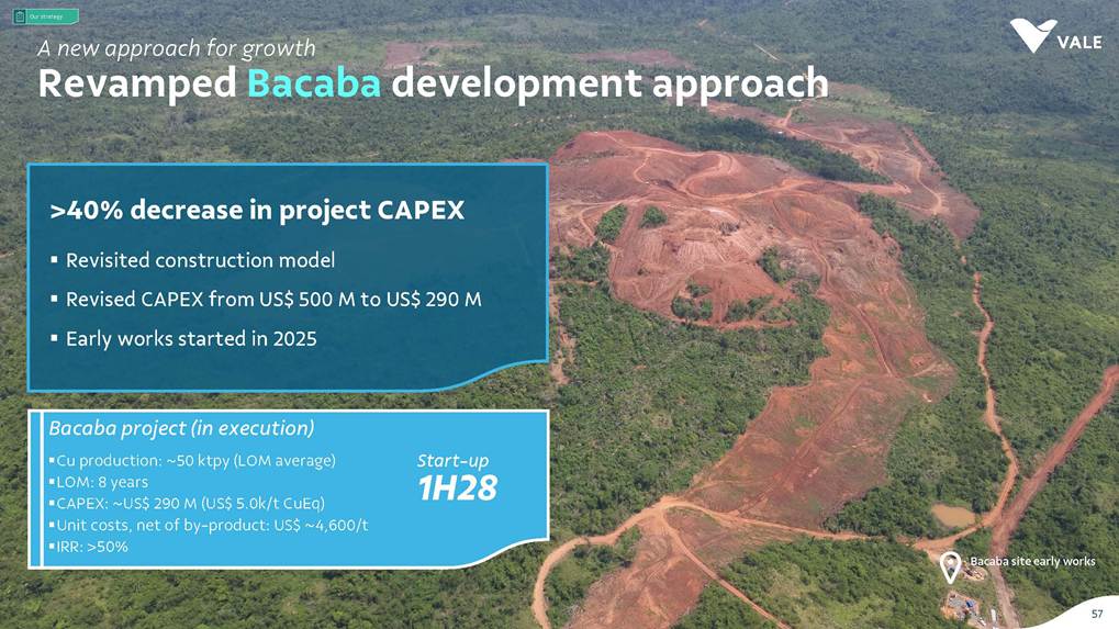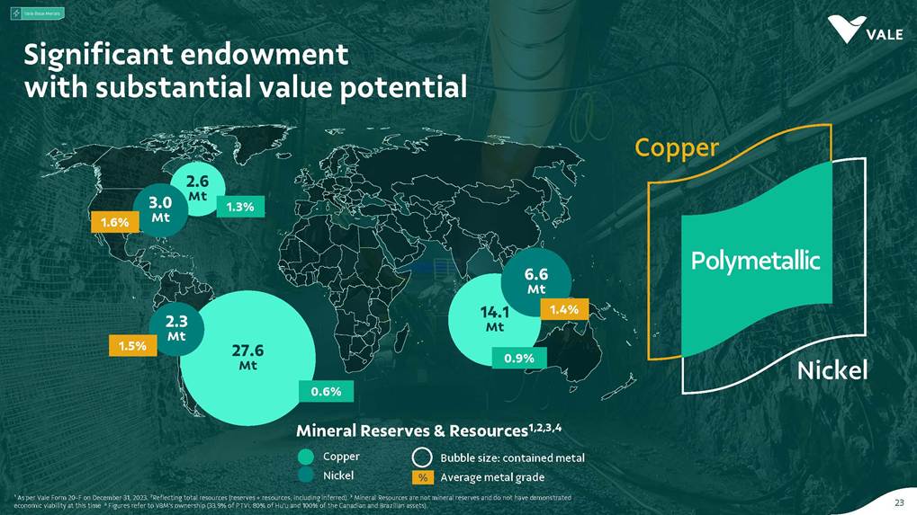 1 Institutional Presentation Investor Relations December 2025 2 AboutVale ESG Iron OreSolutions Vale Base Metals OurStrategy Capital Allocation AboutVale 3 #2 in iron ore production ~20% of seaborne market #6in nickel production Largestiron ore pellet producer #11 in copper reserves ~20 Bt We are one of the leadingIron ore, Nickel and Copper producers globally Note: As of 2024. About Vale 4 Vale at a glance About Vale 328MtIron ore 37MtPellets 348ktCopper 160ktNickel 2024 Production US$ 38.1 bn Net operating revenue in 2024 Expanded net debt of US$ 16.6 bn as of October 31, 2025 100% of electricity consumed in Brazil from renewable sources US$ 15.4 bn Proforma EBITDA in 2024 US$ 6.0 bn CAPEX in 2024 Industry leader in TRIFR (1.1) in 2024 US$ 3.9 bn in dividends & Interest on Capital paid in 2024 19 of 30 dams Decharacterized1 and no dams at Emergency Level 3 US$ 0.4 bn Disbursed on share buybacks in 2024 Key Markets – by revenue (2024) 11% 12% 18% 49% 3% Middle East 3% Rest of the world 4% North America SouthAmerica Europe Asia ex-China China Workforce of 64 thousand direct employees in 2024 5 1 As of Dec 2025. Australia Oman U.A.E. Malaysia India Singapore Japan USA Chile Brazil Argentina¹ Peru Diversified shareholder base and strong governance Note: Previ is a shareholder of Litel Participações S.A. (Litel) and Litela Participações S.A. (Litela), which w r p rt of V ’s form r contro group. B ckrock is r port consi ring Sch u 1 F, fi with th SEC on F b 15, 5, n Br sco’s t b s estimate on December 31, 2024. Treasury: position held by the companies MBR S.A., Vale Holdings B.V. and Vale S.A. The number of shares is presented based on the information contained in the share books of Vale. 6.0% Treasury 8.7% Previ 6.3% Mitsui&Co 6.1% Blackrock 72.9% Others Shareholder structure Novo Mercado B3's highest corporate governance segment. Vale's shareholder composition November 2025 Stock Exchanges B3 (Brazil) - VALE3 NYSE (ADR) - VALE Shareholders with 5% or more of the total capital Others − Majority independent BoD − All BoD members are non-executive directors − Chairman and Vice-Chairman are elected by shareholders − Audit and Risks Committee entirely composed of independent Board members. − Lead Independent Director role − Nominating Committee defines BoD nominees Best governance practices 7 About Vale Corporate Governance About Vale Executive Board Board of Directors1 CEO Gustavo Pimenta Finance & IR EVP Marcelo Bacci IO OperationsEVP Carlos Medeiros Commercial and New Business EVP Rogério Nogueira Technical EVP Rafael Bittar People EVP Samanta Pillar Legal AffairsEVP Sami Arap SustainabilityEVP Grazielle Parenti Click here to cc ss th fu inform tion bout V ’s Bo r of Dir ctors n Ex cuti Bo r . 1 The data takes into account the composition of the Board of Directors on May 7th, 2025. 2.7 years Average Tenure 13 Members 8 (62%) Independent Members 3 Women 4 Racially/ethnically diverse 4 Non Brazilians 8 Our journey Vale doRio Doce was founded Tubarão port inauguration CVRD rebranding to About Vale 9 1942 1956 1967 1969 1985 1997 2006 2009 Carajás discovery First pellet production 1st ore producedat Carajás and inauguration of the Carajás Railway (EFC) CVRD’s privatization INCOacquisition Our journey S11D operations start-up Samarco’s dam collapse 2010 2011 2015 2016 2017 2018 2019 2021 2023 2024 2025 Oman operations start-up Portfolio: divesting the aluminum business Governance: Migration to the Novo Mercado Portfolio: divesting the fertilizer business Portfolio: divesting the manganese business and Brumadinho’s dam collapse Portfolio: divesting the coal business Briquette operations start up and Base Metals Carve-out Vargem Grande and Capanema project start-ups Novo Carajás program About Vale 10 A focused companywith two unique and irreplicable businesses Vale Today About Vale 11 Iron Ore Solutions Vale Base Metals Iron OreSolutions 12 From the Mines to the Customers 13 Iron Ore Solutions Mineral Explorationand Projects Geology and Mine Planning Mine Operation Mineral Processing Pelletizing Railroad Logistics Port Logistics Shipping Logistics Blending and Distribution Centers Sales and Marketing Planning Products and Quality Iron Ore for the Steel Industry Vale’s mai ir re pr ucts Iron Ore Solutions Iron ore fines Carajás fines Brazilian Blend Fines Pellet Feed China (PFC) − 65% Fe − Low contaminants (silica, alumina and others) − Mined from the Northern System − 63% Fe − Low-alumina − Produced from blending Carajás and high-silica fines − ~63% Fe − Low-alumina − Pellet feed concentrated in Chinese facilities Mid-Grade Carajás − ~63% Fe − Low-alumina and Low-phosphorus − Mined from the Northern System Direct Reduction pellets Blast Furnace pellets BriquettesDeveloped by Vale − Agglomerates for direct charge in Direct Reduction Furnaces − Agglomerates for direct charge in Blast Furnaces − Same application as pellets in BF and DR furnaces − Lower CO2 emissions compared to pellet production − Commercial production ramping-up Agglomerates 14 Brazilian States: MA = Maranhão PA = Pará MG = Minas Gerais ES = Espírito Santo RJ = Rio de Janeiro Iron Ore Solutions 15 Vale operates three iron ore production systems in Brazil, which include mines, processing plants, railways and port facilities Southern System PA MG EFC EFVM MRS Ponta da Madeira Port (PDM) - São Luís - MA Tubarão Port - Vitoria - ES Itaguaí Port (CPBS) - RJ Guaíba Port (TIG) - RJ MA RJ ES Northern System Southeastern System Vale operates three iron ore production systems in Brazil Note: EFC is the Carajás Railway and EFVM is the Vitória-Min s R i w . MRS is V ’s r i w subsi i r . Northern System Southeastern System Southern System − 3 mining complexes − EFC - 997 km railway − 5 berths (3 Valemax berths) Serra Norte Serra Sul Serra Leste Carajás National Forest Cauê Belo Horizonte Conceição Alegria Timbopeba Brucutu Água Limpa Fazendão Itabi