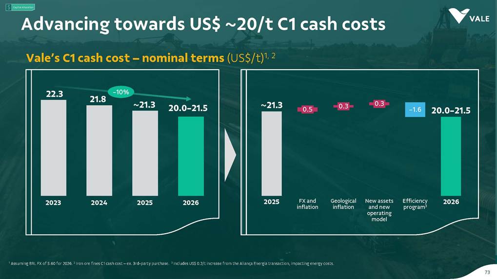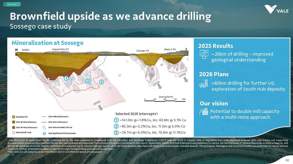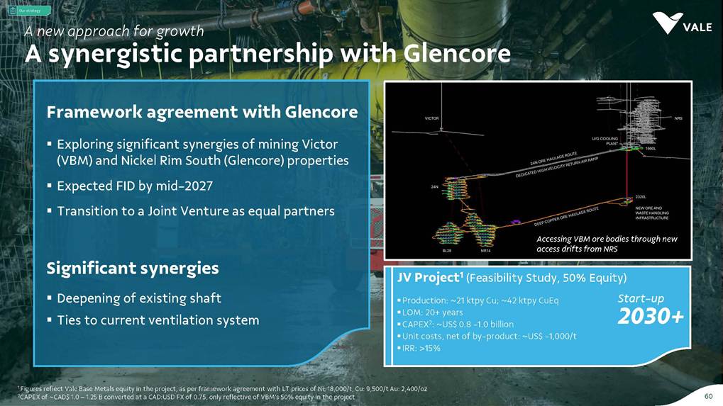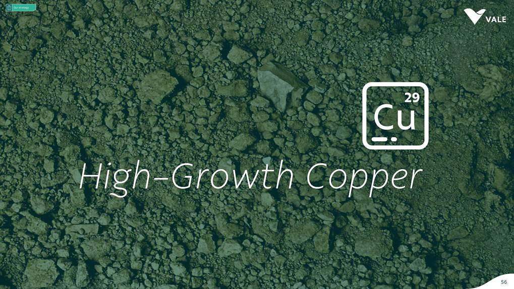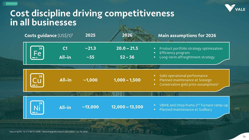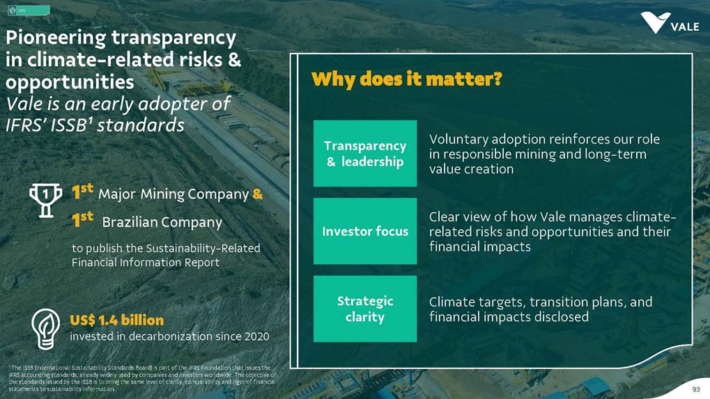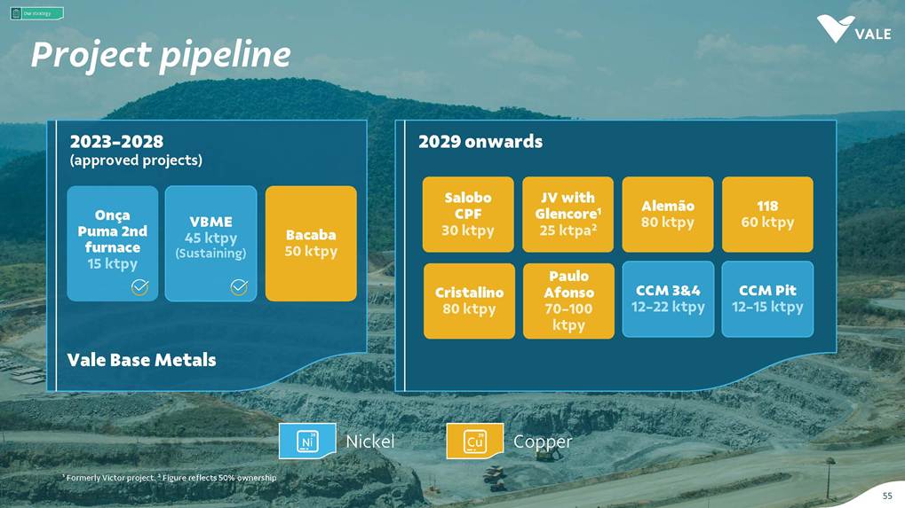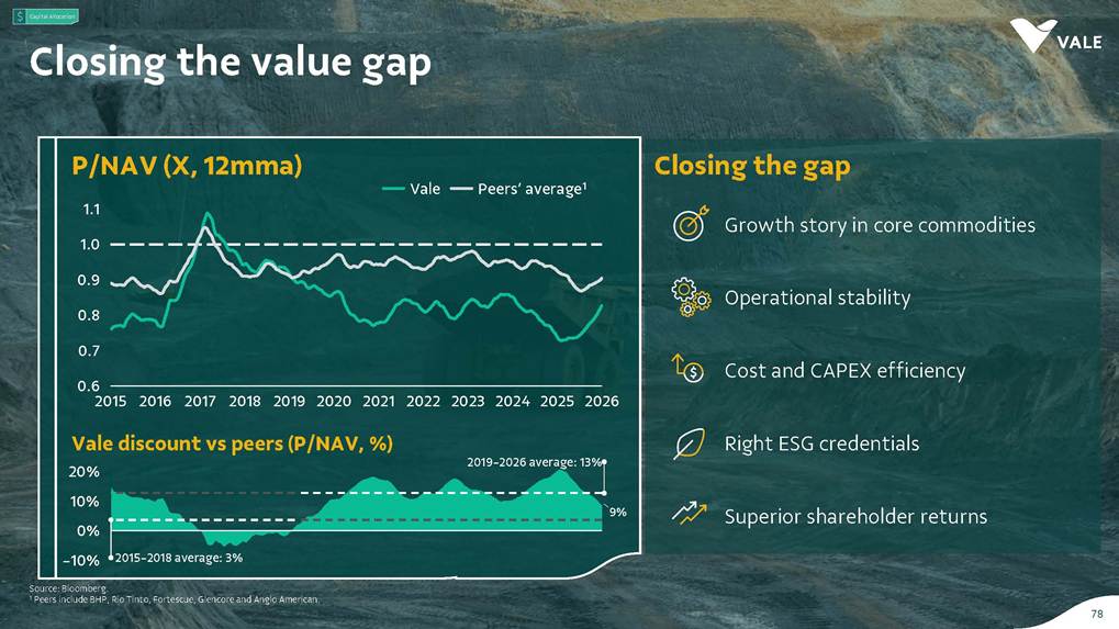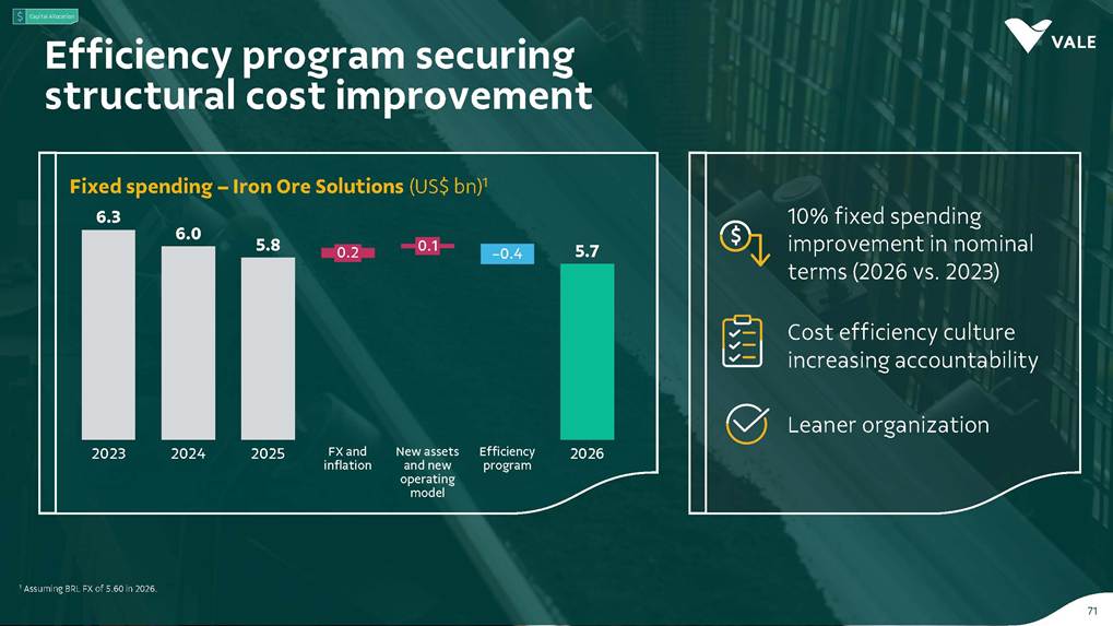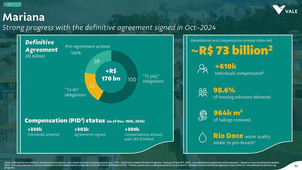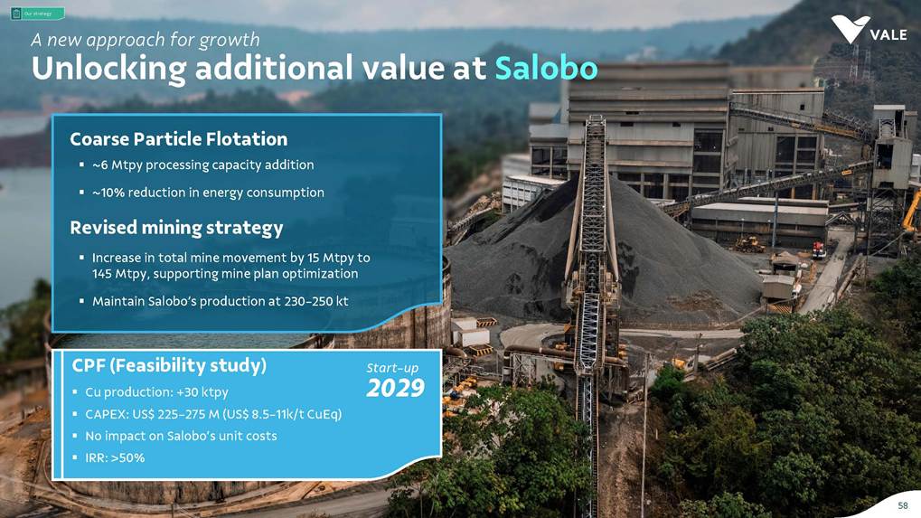 1 Institutional Presentation Investor Relations December 2025 2 AboutVale ESG Iron OreSolutions Vale Base Metals OurStrategy Capital Allocation AboutVale 3 #2 in iron ore production ~20% of seaborne market #6in nickel production Largestiron ore pellet producer #11 in copper reserves ~20 Bt We are one of the leadingIron ore, Nickel and Copper producers globally Note: As of 2024. About Vale 4 Vale at a glance About Vale 328MtIron ore 37MtPellets 348ktCopper 160ktNickel 2024 Production US$ 38.1 bn Net operating revenue in 2024 Expanded net debt of US$ 16.6 bn as of October 31, 2025 100% of electricity consumed in Brazil from renewable sources US$ 15.4 bn Proforma EBITDA in 2024 US$ 6.0 bn CAPEX in 2024 Industry leader in TRIFR (1.1) in 2024 US$ 3.9 bn in dividends & Interest on Capital paid in 2024 19 of 30 dams Decharacterized1 and no dams at Emergency Level 3 US$ 0.4 bn Disbursed on share buybacks in 2024 Key Markets – by revenue (2024) 11% 12% 18% 49% 3% Middle East 3% Rest of the world 4% North America SouthAmerica Europe Asia ex-China China Workforce of 64 thousand direct employees in 2024 5 1 As of Dec 2025. Australia Oman U.A.E. Malaysia India Singapore Japan USA Chile Brazil Argentina¹ Peru Diversified shareholder base and strong governance Note: Previ is a shareholder of Litel Participações S.A. (Litel) and Litela Participações S.A. (Litela), which w r p rt of V ’s form r contro group. B ckrock is r port consi ring Sch u 1 F, fi with th SEC on F b 15, 5, n Br sco’s t b s estimate on December 31, 2024. Treasury: position held by the companies MBR S.A., Vale Holdings B.V. and Vale S.A. The number of shares is presented based on the information contained in the share books of Vale. 6.0% Treasury 8.7% Previ 6.3% Mitsui&Co 6.1% Blackrock 72.9% Others Shareholder structure Novo Mercado B3's highest corporate governance segment. Vale's shareholder composition November 2025 Stock Exchanges B3 (Brazil) - VALE3 NYSE (ADR) - VALE Shareholders with 5% or more of the total capital Others − Majority independent BoD − All BoD members are non-executive directors − Chairman and Vice-Chairman are elected by shareholders − Audit and Risks Committee entirely composed of independent Board members. − Lead Independent Director role − Nominating Committee defines BoD nominees Best governance practices 7 About Vale Corporate Governance About Vale Executive Board Board of Directors1 CEO Gustavo Pimenta Finance & IR EVP Marcelo Bacci IO OperationsEVP Carlos Medeiros Commercial and New Business EVP Rogério Nogueira Technical EVP Rafael Bittar People EVP Samanta Pillar Legal AffairsEVP Sami Arap SustainabilityEVP Grazielle Parenti Click here to cc ss th fu inform tion bout V ’s Bo r of Dir ctors n Ex cuti Bo r . 1 The data takes into account the composition of the Board of Directors on May 7th, 2025. 2.7 years Average Tenure 13 Members 8 (62%) Independent Members 3 Women 4 Racially/ethnically diverse 4 Non Brazilians 8 Our journey Vale doRio Doce was founded Tubarão port inauguration CVRD rebranding to About Vale 9 1942 1956 1967 1969 1985 1997 2006 2009 Carajás discovery First pellet production 1st ore producedat Carajás and inauguration of the Carajás Railway (EFC) CVRD’s privatization INCOacquisition Our journey S11D operations start-up Samarco’s dam collapse 2010 2011 2015 2016 2017 2018 2019 2021 2023 2024 2025 Oman operations start-up Portfolio: divesting the aluminum business Governance: Migration to the Novo Mercado Portfolio: divesting the fertilizer business Portfolio: divesting the manganese business and Brumadinho’s dam collapse Portfolio: divesting the coal business Briquette operations start up and Base Metals Carve-out Vargem Grande and Capanema project start-ups Novo Carajás program About Vale 10 A focused companywith two unique and irreplicable businesses Vale Today About Vale 11 Iron Ore Solutions Vale Base Metals Iron OreSolutions 12 From the Mines to the Customers 13 Iron Ore Solutions Mineral Explorationand Projects Geology and Mine Planning Mine Operation Mineral Processing Pelletizing Railroad Logistics Port Logistics Shipping Logistics Blending and Distribution Centers Sales and Marketing Planning Products and Quality Iron Ore for the Steel Industry Vale’s mai ir re pr ucts Iron Ore Solutions Iron ore fines Carajás fines Brazilian Blend Fines Pellet Feed China (PFC) − 65% Fe − Low contaminants (silica, alumina and others) − Mined from the Northern System − 63% Fe − Low-alumina − Produced from blending Carajás and high-silica fines − ~63% Fe − Low-alumina − Pellet feed concentrated in Chinese facilities Mid-Grade Carajás − ~63% Fe − Low-alumina and Low-phosphorus − Mined from the Northern System Direct Reduction pellets Blast Furnace pellets BriquettesDeveloped by Vale − Agglomerates for direct charge in Direct Reduction Furnaces − Agglomerates for direct charge in Blast Furnaces − Same application as pellets in BF and DR furnaces − Lower CO2 emissions compared to pellet production − Commercial production ramping-up Agglomerates 14 Brazilian States: MA = Maranhão PA = Pará MG = Minas Gerais ES = Espírito Santo RJ = Rio de Janeiro Iron Ore Solutions 15 Vale operates three iron ore production systems in Brazil, which include mines, processing plants, railways and port facilities Southern System PA MG EFC EFVM MRS Ponta da Madeira Port (PDM) - São Luís - MA Tubarão Port - Vitoria - ES Itaguaí Port (CPBS) - RJ Guaíba Port (TIG) - RJ MA RJ ES Northern System Southeastern System Vale operates three iron ore production systems in Brazil Note: EFC is the Carajás Railway and EFVM is the Vitória-Min s R i w . MRS is V ’s r i w subsi i r . Northern System Southeastern System Southern System − 3 mining complexes − EFC - 997 km railway − 5 berths (3 Valemax berths) Serra Norte Serra Sul Serra Leste Carajás National Forest Cauê Belo Horizonte Conceição Alegria Timbopeba Brucutu Água Limpa Fazendão Itabi
