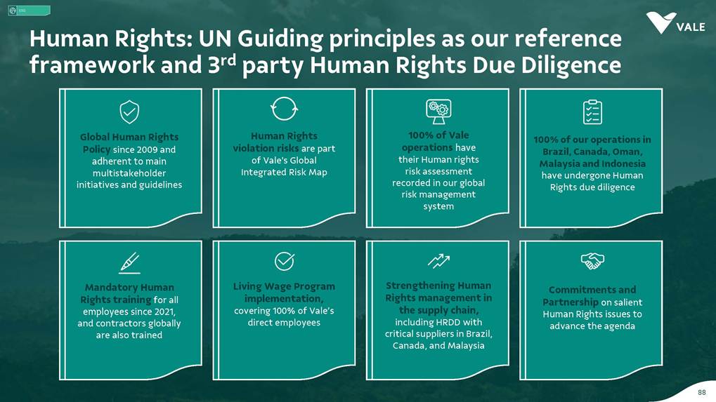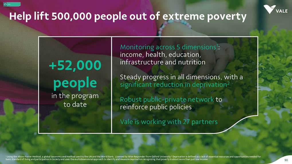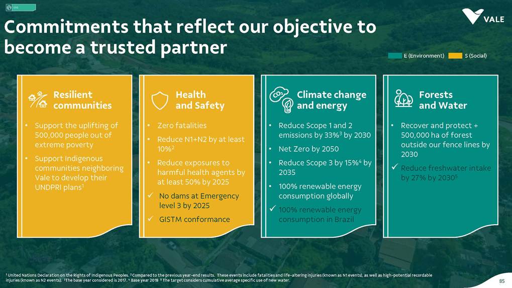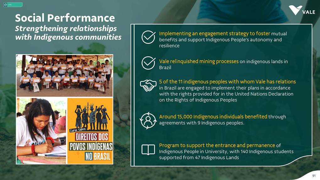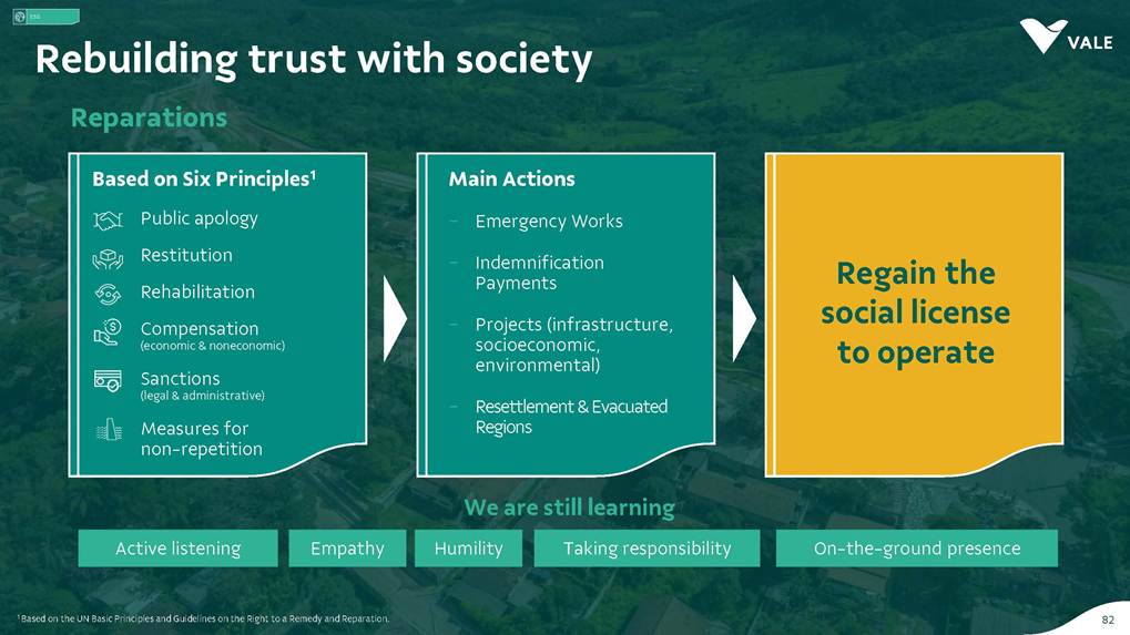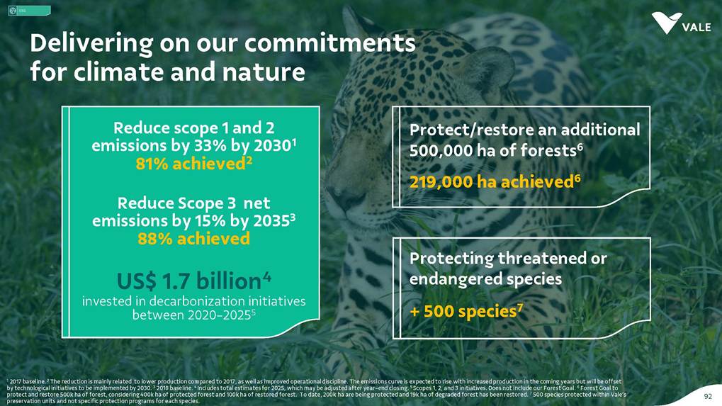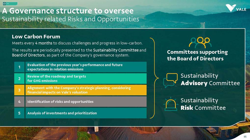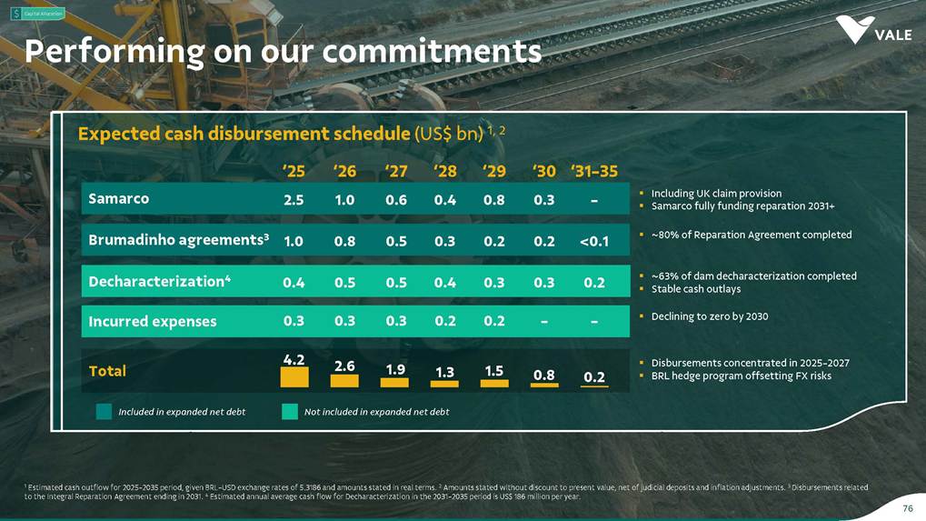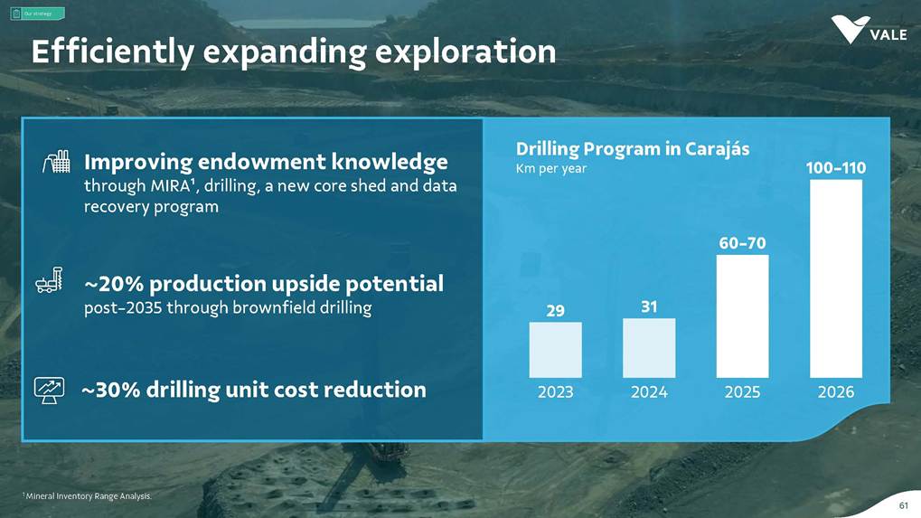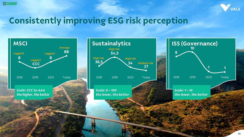 1 Institutional Presentation Investor Relations December 2025 2 AboutVale ESG Iron OreSolutions Vale Base Metals OurStrategy Capital Allocation AboutVale 3 #2 in iron ore production ~20% of seaborne market #6in nickel production Largestiron ore pellet producer #11 in copper reserves ~20 Bt We are one of the leadingIron ore, Nickel and Copper producers globally Note: As of 2024. About Vale 4 Vale at a glance About Vale 328MtIron ore 37MtPellets 348ktCopper 160ktNickel 2024 Production US$ 38.1 bn Net operating revenue in 2024 Expanded net debt of US$ 16.6 bn as of October 31, 2025 100% of electricity consumed in Brazil from renewable sources US$ 15.4 bn Proforma EBITDA in 2024 US$ 6.0 bn CAPEX in 2024 Industry leader in TRIFR (1.1) in 2024 US$ 3.9 bn in dividends & Interest on Capital paid in 2024 19 of 30 dams Decharacterized1 and no dams at Emergency Level 3 US$ 0.4 bn Disbursed on share buybacks in 2024 Key Markets – by revenue (2024) 11% 12% 18% 49% 3% Middle East 3% Rest of the world 4% North America SouthAmerica Europe Asia ex-China China Workforce of 64 thousand direct employees in 2024 5 1 As of Dec 2025. Australia Oman U.A.E. Malaysia India Singapore Japan USA Chile Brazil Argentina¹ Peru Diversified shareholder base and strong governance Note: Previ is a shareholder of Litel Participações S.A. (Litel) and Litela Participações S.A. (Litela), which w r p rt of V ’s form r contro group. B ckrock is r port consi ring Sch u 1 F, fi with th SEC on F b 15, 5, n Br sco’s t b s estimate on December 31, 2024. Treasury: position held by the companies MBR S.A., Vale Holdings B.V. and Vale S.A. The number of shares is presented based on the information contained in the share books of Vale. 6.0% Treasury 8.7% Previ 6.3% Mitsui&Co 6.1% Blackrock 72.9% Others Shareholder structure Novo Mercado B3's highest corporate governance segment. Vale's shareholder composition November 2025 Stock Exchanges B3 (Brazil) - VALE3 NYSE (ADR) - VALE Shareholders with 5% or more of the total capital Others − Majority independent BoD − All BoD members are non-executive directors − Chairman and Vice-Chairman are elected by shareholders − Audit and Risks Committee entirely composed of independent Board members. − Lead Independent Director role − Nominating Committee defines BoD nominees Best governance practices 7 About Vale Corporate Governance About Vale Executive Board Board of Directors1 CEO Gustavo Pimenta Finance & IR EVP Marcelo Bacci IO OperationsEVP Carlos Medeiros Commercial and New Business EVP Rogério Nogueira Technical EVP Rafael Bittar People EVP Samanta Pillar Legal AffairsEVP Sami Arap SustainabilityEVP Grazielle Parenti Click here to cc ss th fu inform tion bout V ’s Bo r of Dir ctors n Ex cuti Bo r . 1 The data takes into account the composition of the Board of Directors on May 7th, 2025. 2.7 years Average Tenure 13 Members 8 (62%) Independent Members 3 Women 4 Racially/ethnically diverse 4 Non Brazilians 8 Our journey Vale doRio Doce was founded Tubarão port inauguration CVRD rebranding to About Vale 9 1942 1956 1967 1969 1985 1997 2006 2009 Carajás discovery First pellet production 1st ore producedat Carajás and inauguration of the Carajás Railway (EFC) CVRD’s privatization INCOacquisition Our journey S11D operations start-up Samarco’s dam collapse 2010 2011 2015 2016 2017 2018 2019 2021 2023 2024 2025 Oman operations start-up Portfolio: divesting the aluminum business Governance: Migration to the Novo Mercado Portfolio: divesting the fertilizer business Portfolio: divesting the manganese business and Brumadinho’s dam collapse Portfolio: divesting the coal business Briquette operations start up and Base Metals Carve-out Vargem Grande and Capanema project start-ups Novo Carajás program About Vale 10 A focused companywith two unique and irreplicable businesses Vale Today About Vale 11 Iron Ore Solutions Vale Base Metals Iron OreSolutions 12 From the Mines to the Customers 13 Iron Ore Solutions Mineral Explorationand Projects Geology and Mine Planning Mine Operation Mineral Processing Pelletizing Railroad Logistics Port Logistics Shipping Logistics Blending and Distribution Centers Sales and Marketing Planning Products and Quality Iron Ore for the Steel Industry Vale’s mai ir re pr ucts Iron Ore Solutions Iron ore fines Carajás fines Brazilian Blend Fines Pellet Feed China (PFC) − 65% Fe − Low contaminants (silica, alumina and others) − Mined from the Northern System − 63% Fe − Low-alumina − Produced from blending Carajás and high-silica fines − ~63% Fe − Low-alumina − Pellet feed concentrated in Chinese facilities Mid-Grade Carajás − ~63% Fe − Low-alumina and Low-phosphorus − Mined from the Northern System Direct Reduction pellets Blast Furnace pellets BriquettesDeveloped by Vale − Agglomerates for direct charge in Direct Reduction Furnaces − Agglomerates for direct charge in Blast Furnaces − Same application as pellets in BF and DR furnaces − Lower CO2 emissions compared to pellet production − Commercial production ramping-up Agglomerates 14 Brazilian States: MA = Maranhão PA = Pará MG = Minas Gerais ES = Espírito Santo RJ = Rio de Janeiro Iron Ore Solutions 15 Vale operates three iron ore production systems in Brazil, which include mines, processing plants, railways and port facilities Southern System PA MG EFC EFVM MRS Ponta da Madeira Port (PDM) - São Luís - MA Tubarão Port - Vitoria - ES Itaguaí Port (CPBS) - RJ Guaíba Port (TIG) - RJ MA RJ ES Northern System Southeastern System Vale operates three iron ore production systems in Brazil Note: EFC is the Carajás Railway and EFVM is the Vitória-Min s R i w . MRS is V ’s r i w subsi i r . Northern System Southeastern System Southern System − 3 mining complexes − EFC - 997 km railway − 5 berths (3 Valemax berths) Serra Norte Serra Sul Serra Leste Carajás National Forest Cauê Belo Horizonte Conceição Alegria Timbopeba Brucutu Água Limpa Fazendão Itabi