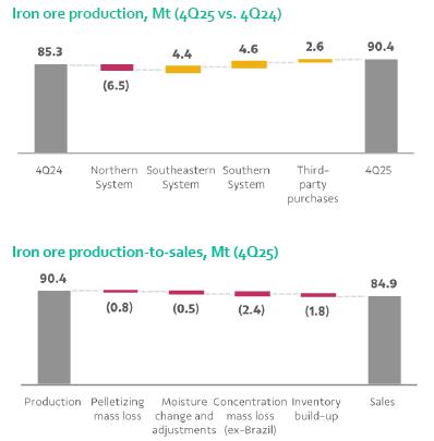 Iron ore production totaled 90.4 Mt in Q4, 6% (5.1 Mt) higher y/y, driven by Brucutu’s robust performance and the continued ramp-up of the Capanema and VGR1 projects. Pellets output totaled 8.3 Mt in Q4, 9% (0.8 Mt) lower y/y, reflecting market conditions. Iron ore sales reached 84.9 Mt in Q4, up 5% (3.7 Mt) y/y, consistent with higher production volumes.