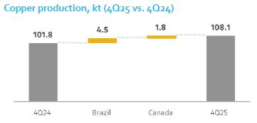 1 Average realized price for copper operations only (Salobo and Sossego). Average realized copper price for all operations, including copper sales originated from nickel operations was US$ 11,025/t in 4Q25 and US$ 9,653/t in 2025.