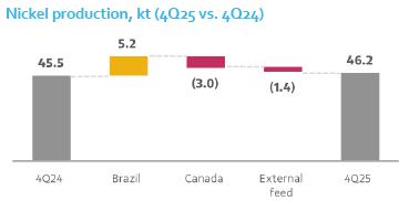 Sudbury: own sourced finished nickel production decreased by 2.4 kt y/y, reaching 8.2 kt in the quarter, driven by unscheduled maintenance of the reactor #3, with ongoing preventive maintenance into Q1.