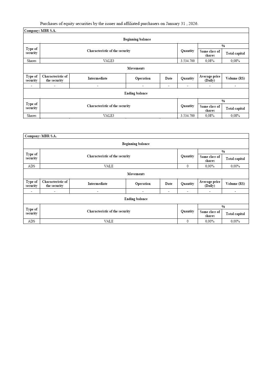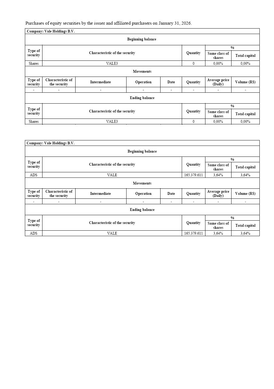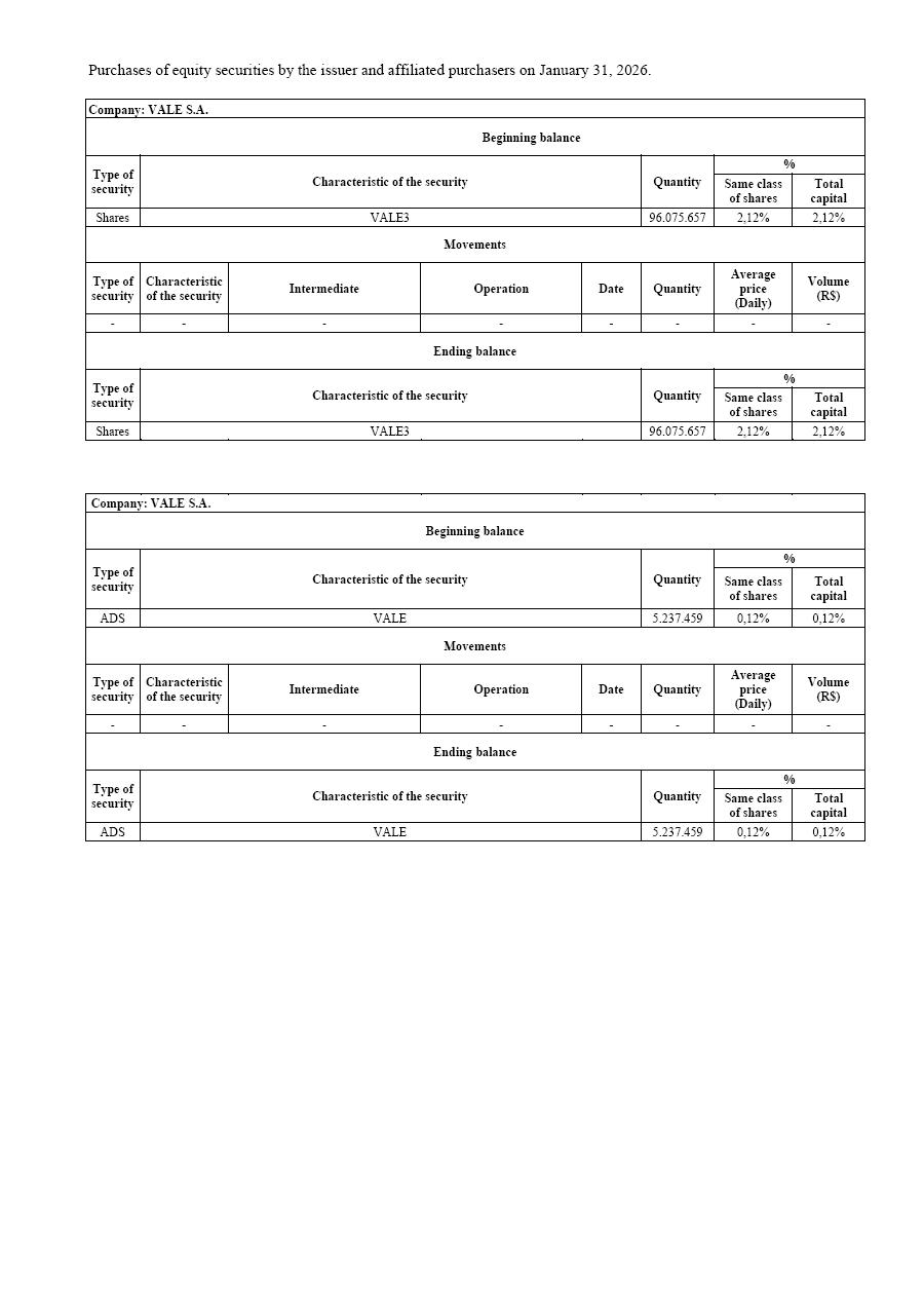 Purchases of equity securities by the issuer and affiliated purchasers on January 31, 2026.Company: VALE S.A.Beginning balance Type of security Characteristic of the security Quantity % Same class of shares Total capital Shares VALE3 96.075.657 2,12% 2,12% Movements Type of security Characteristic of the security Intermediate Operation Date Quantity Average price (Daily) Volume (R$) - - - - - - - - Ending balance Type of security Characteristic of the security Quantity % Same class of shares Total capital Shares VALE3 96.075.657 2,12% 2,12% Company: VALE S.A. Beginning balance Type of security Characteristic of the security Quantity % Same class of shares Total capital ADS VALE 5.237.459 0,12% 0,12% Movements Type of security Characteristic of the security Intermediate Operation Date Quantity Average price (Daily) Volume (R$) - - - - - - - - Ending balance Type of security Characteristic of the security Quantity % Same class of shares Total capital ADS VALE 5.237.459 0,12% 0,12% Purchases of equity securities by the issuer and affiliated purchasers on January 31 , 2026. Type of security Characteristic of the security Quantity % Same class of shares Total capital Shares VALE3 3.534.700 0,08% 0,08% Movements Type of security Characteristic of the security Intermediate Operation Date Quantity Average price (Daily) Volume (R$) - - - - - - - - Ending balance Type of security Characteristic of the security Quantity % Same class of shares Total capital Shares VALE3 3.534.700 0,08% 0,08% Company: MBR S.A. Beginning balance Type of security Characteristic of the security Quantity % Same class of shares Total capital ADS VALE 0 0,00% 0,00% Movements Type of security Characteristic of the security Intermediate Operation Date Quantity Average price (Daily) Volume (R$) - - - - - - - - Ending balance Type of security Characteristic of the security Quantity % Same class of shares Total capital ADS VALE 0 0,00% 0,00% Beginning balance Company: MBR S.A. Purchases of equity securities by the issuer and affiliated purchasers on January 31, 2026. Beginning balance Type of security Characteristic of the security Quantity % Same class of shares Total capital Shares VALE3 0 0,00% 0,00% Movements Type of security Characteristic of the security Intermediate Operation Date Quantity Average price (Daily) Volume (R$) - - - - - - - - Ending balance Type of security Characteristic of the security Quantity % Same class of shares Total capital Shares VALE3 0 0,00% 0,00% Company: Vale Holdings B.V. Beginning balance Type of security Characteristic of the security Quantity % Same class of shares Total capital ADS VALE 165.379.611 3,64% 3,64% Movements Type of security Characteristic of the security Intermediate Operation Date Quantity Average price (Daily) Volume (R$) - - - - - - - - Ending balance Type of security Characteristic of the security Quantity % Same class of shares Total capital ADS VALE 165.379.611 3,64% 3,64% Company: Vale Holdings B.V.