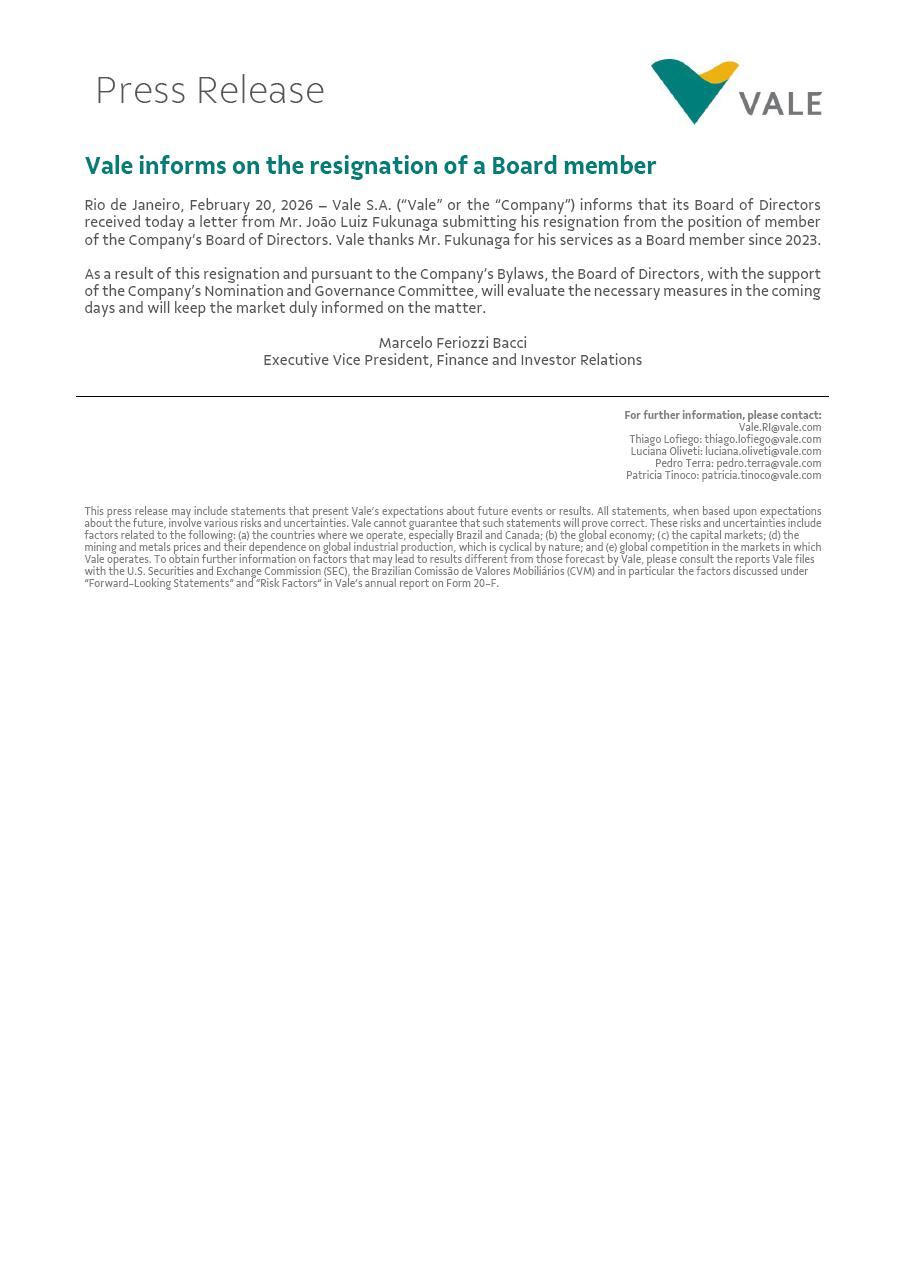 Vale informs on the resignation of a Board member Rio de Janeiro, February 20, 2026 – Vale S.A. (“Vale” or the “Company”) informs that its Board of Directors received today a letter from Mr. João Luiz Fukunaga submitting his resignation from the position of member of the Company’s Board of Directors. Vale thanks Mr. Fukunaga for his services as a Board member since 2023. As a result of this resignation and pursuant to the Company’s Bylaws, the Board of Directors, with the support of the Company’s Nomination and Governance Committee, will evaluate the necessary measures in the coming days and will keep the market duly informed on the matter. Marcelo Feriozzi Bacci Executive Vice President, Finance and Investor Relations For further information, please contact: Vale.RI@vale.com Thiago Lofiego: thiago.lofiego@vale.com Luciana Oliveti: luciana.oliveti@vale.com Pedro Terra: pedro.terra@vale.com Patricia Tinoco: patricia.tinoco@vale.com This press release may include statements that present Vale’s expectations about future events or results. All statements, when based upon expectations about the future, involve various risks and uncertainties. Vale cannot guarantee that such statements will prove correct. These risks and uncertainties include factors related to the following: (a) the countries where we operate, especially Brazil and Canada; (b) the global economy; (c) the capital markets; (d) the mining and metals prices and their dependence on global industrial production, which is cyclical by nature; and (e) global competition in the markets in which Vale operates. To obtain further information on factors that may lead to results different from those forecast by Vale, please consult the reports Vale files with the U.S. Securities and Exchange Commission (SEC), the Brazilian Comissão de Valores Mobiliários (CVM) and in particular the factors discussed under “Forward-Looking Statements” and “Risk Factors” in Vale’s annual report on Form 20-F. Press Release