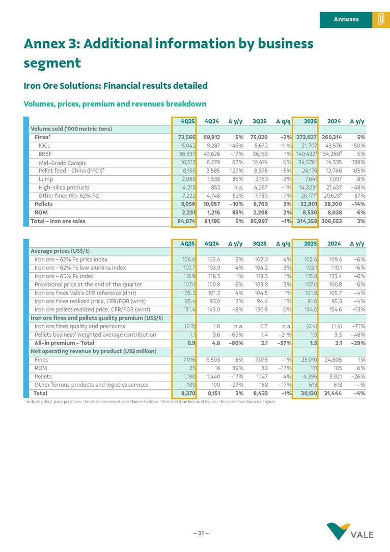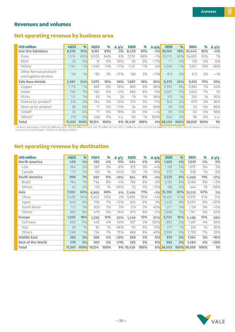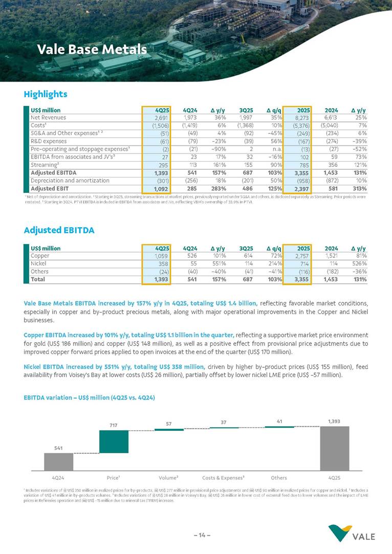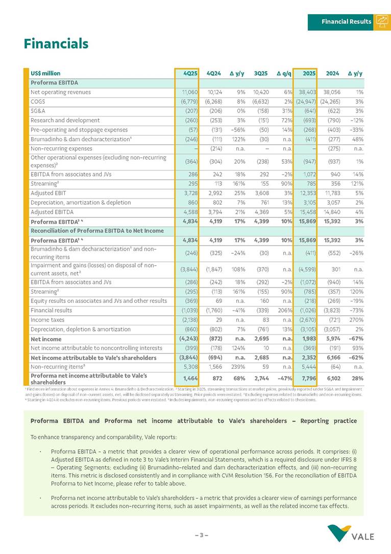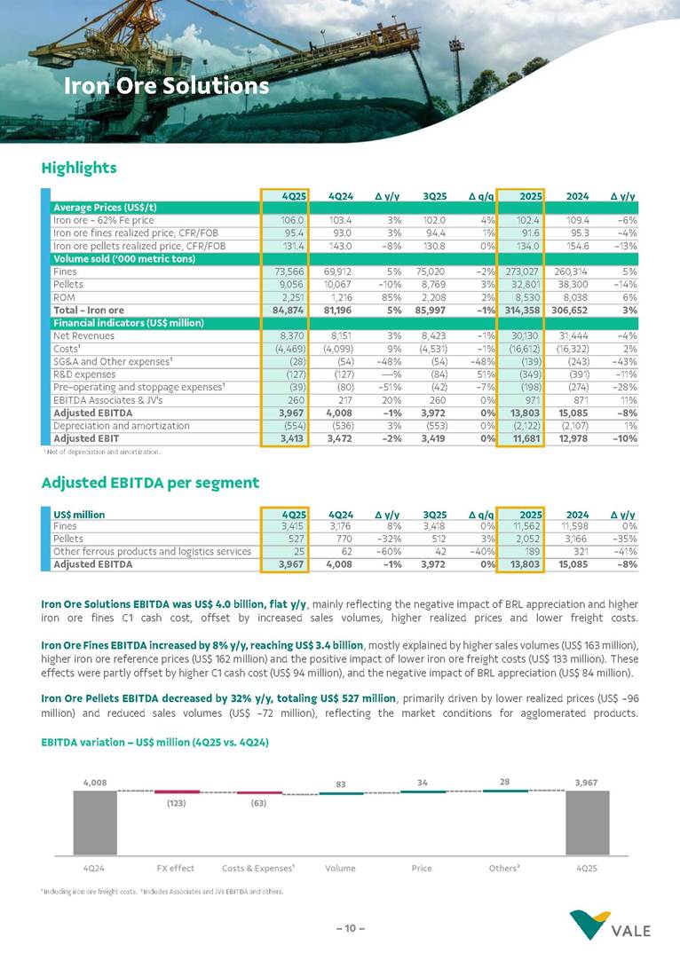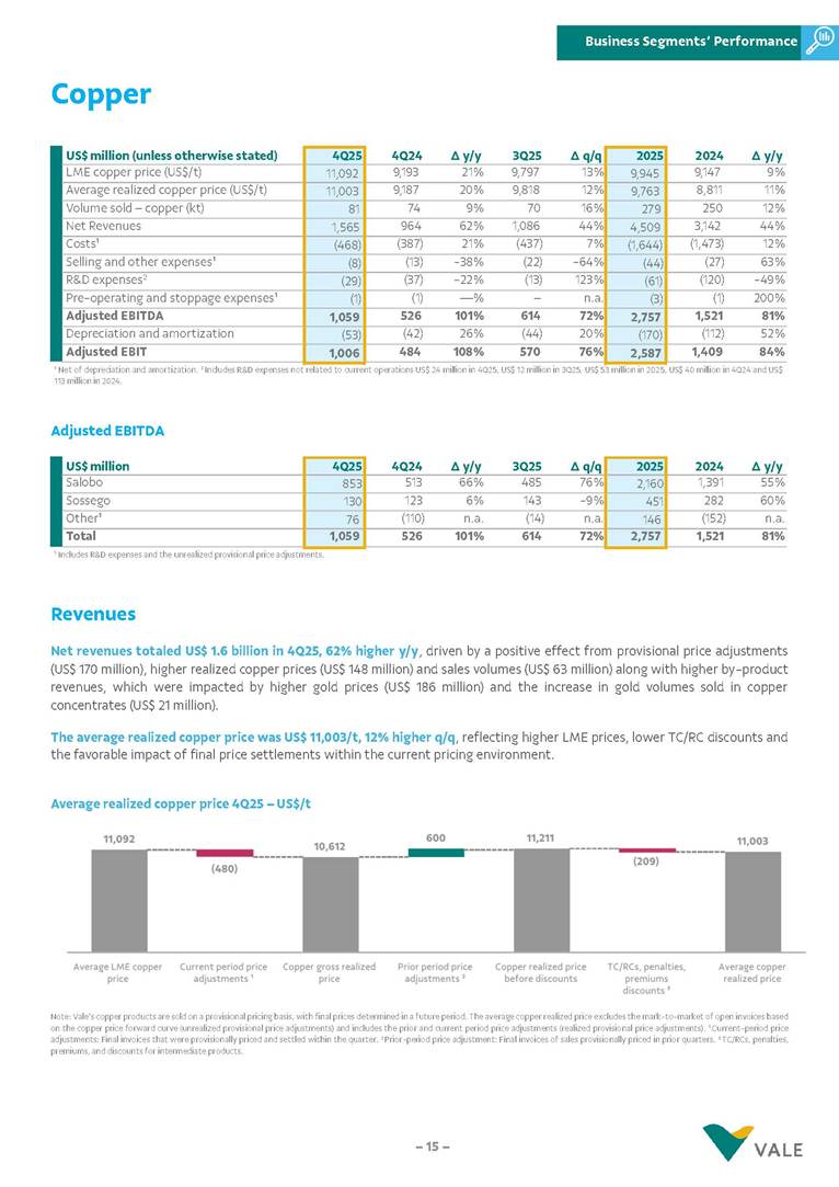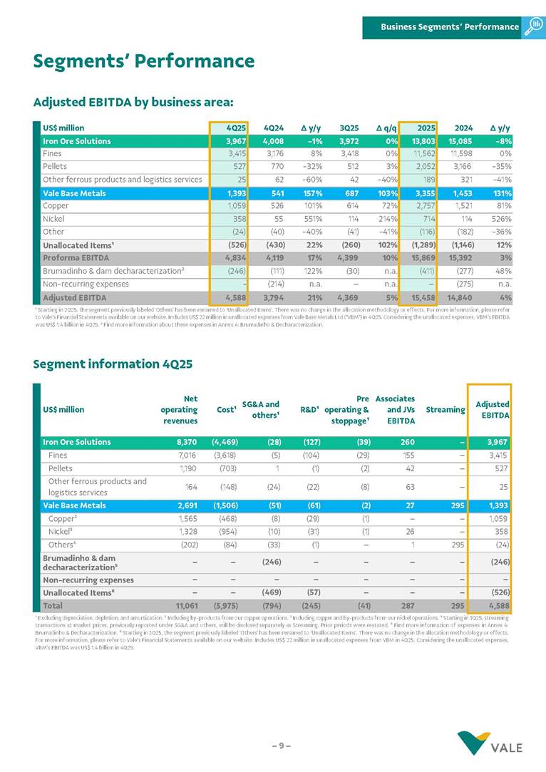 – 1 – 8. Selected financial indicators 9. US$ million 4Q25 4Q24 Δ y/y 3Q25 Δ q/q 2025 2024 Δ y/y Net operating revenues 11,060 10,124 9% 10,420 6% 38,403 38,056 1% 10. Total costs and expenses (ex-Brumadinho and dams decharacterization) (7,667) (7,376) 4% (7,229) 6% (27,496) (27,292) 1% Expenses related to Brumadinho and dams decharacterization (246) (111) 122% (30) n.a. (411) (277) 48% 11. Adjusted EBIT 3,728 2,992 25% 3,608 3% 12,353 11,783 5% 12. Adjusted EBITDA 4,588 3,794 21% 4,369 5% 15,458 14,840 4% 13. Proforma EBITDA1 4,834 4,119 17% 4,399 10% 15,869 15,392 3% 14. Proforma EBITDA margin (%) 44% 41% 3 p.p. 42% 2 p.p. 41% 40% 1 p.p. 5. Free cash flow 1,688 (100) n.a. 2,568 -34% 5,653 5,510 3% 6. Recurring free cash flow 1,688 817 107% 1,562 8% 4,762 3,771 26% 7. Attributable net income (3,844) (694) n.a. 2,685 n.a. 2,352 6,166 -62% 3. Proforma net income attributable to Vale’s shareholders 1,464 872 68% 2,744 -47% 7,796 6,102 28% 4. Net debt2 11,236 10,499 7% 12,452 -10% 11,236 10,499 7% 2. Expanded net debt 15,579 16,466 -5% 16,640 -6% 15,579 16,466 -5% 1. Capital expenditures 2,030 1,766 15% 1,250 62% 5,507 6,000 -8% 1 Excluding expenses related to Brumadinho and non-recurring items. 2 Including leases (IFRS 16). Results Highlights • Strong operational and cost performance across all business segments, with all 2025 guidances achieved. • Robust sales in 4Q25 and 2025. Iron ore, copper, and nickel sales increased by 5% (+4 Mt), 8% (+8 kt), and 5% (+3 kt) y/y in 4Q25, respectively. In 2025, sales increased 3% (+8 Mt), 12% (+41 kt) and 11% (+18 kt), respectively. • Average realized iron ore fines price was up 1% q/q and 3% y/y to US$ 95.4/t. Realized copper prices rose 12% q/q and 20% y/y to US$ 11,003/t. Realized nickel prices declined by 3% q/q and 7% y/y to US$ 15,015/t. • Iron ore C1 cash cost reached US$ 21.3/t in 2025, 2% lower y/y, marking the second consecutive year of cost reduction. In 4Q25, C1 cash cost also totaled US$ 21.3/t, 13% higher y/y, in line with guidance. Iron ore all-in costs reached US$ 54.2/t, 3% lower y/y in 2025 and US$ 54.3/t, 10% higher y/y in 4Q25. • Copper all-in costs were US$ -881/t in the quarter, while nickel all-in costs declined 35% y/y to US$ 9,001/t, mainly driven by strong by-product revenues and operational improvements across both segments. For 2025, all-in costs totaled US$ 603/t for copper and US$ 12,158/t for nickel, also marking the second consecutive year of all-in cost reduction. • Proforma EBITDA totaled US$ 4.8 billion, up 17% y/y and 10% q/q, reflecting higher contribution from Vale Base Metals. • Capital expenditures amounted to US$ 2.0 billion in 4Q25, in line with the US$ 5.5 billion CAPEX guidance for the year. • Recurring Free Cash Flow totaled US$ 1.7 billion, US$ 0.9 billion higher y/y, driven by stronger Proforma EBITDA and lower net financial expenses. • Expanded net debt reached US$ 15.6 billion at quarter-end, US$ 1.0 billion lower q/q, as a result of stronger FCF generation and Samarco-related provision adjustments. • US$1.8 billion in dividends and interest on capital to be paid in March, reflecting the dividend policy, in addition to the US$ 1.0 billion in extraordinary remuneration paid in January. Rio de Janeiro, February 12th, 2026 Vale’s performance in 4Q25 and 2025 “In 2025, Vale delivered an outstanding performance, achieving or exceeding all guidances, while advancing strategic priorities that reinforce our long-term ambition. We strengthened our commitment to safety, with meaningful reductions in high potential incidents, while accomplishing an important milestone in our safety journey, by having no dams at emergency Level 3. In our operations, we reached the highest iron ore and copper production levels since 2018 and delivered double digit production growth in nickel. This strong operational performance was supported by improved asset reliability and the successful ramp up of key growth projects, like Capanema, Vargem Grande, VBME and Onça Puma. At the same time, we continued to enhance our cost competitiveness, capturing structural efficiencies that improve our position in the global industry cost curve. Our disciplined capital allocation, coupled with strong execution and a more favorable cycle, enabled us to deliver superior shareholder returns. As we enter 2026, we remain focused on operational excellence, sustainable growth through initiatives such as the New Carajás Program, and on delivering superior long-term value for all our stakeholders.", commented Gustavo Pimenta, CEO – 2 – Business Highlights Iron Ore Solutions • Vale has continued to advance the commissioning of the Capanema and Vargem Grande 1 projects, with full ramp-up expected in 1H26 and 2H26, respectively. The Serra Sul +20 project construction also continues to progress, having 84% physical progress, with start-up expected in 2H26. Vale Base Metals • Construction works at the Bacaba project began following the construction license approval. The project will extend the life of the Sossego Mining Complex, adding approximately 50 ktpy of copper over its 8-year mine life, with a total planned CAPEX of US$ 290 million. • Vale Base Metals entered into an agreement with Glencore to assess a brownfield copper development in the Sudbury Basin, targeting a future 50/50 joint venture. The project is expected to produce 880 kt of copper over 21 years with US$1.6–2.0 billion in capital, alongside additional nickel, cobalt, gold and PGMs, with a 1H27 investment decision. Recent developments • Vale has completed the repurchase of 23% of its outstanding participating debentures, totaling US$ 703 million, following the optional acquisition offer launched in October. Concluded in November, this transaction marks a key milestone in Vale's financial liability management. ESG Tailing Dams • Maravilhas II dam, Vargem Grande dam and Dam 6 had their emergency levels removed, following the approval by ANM. The 