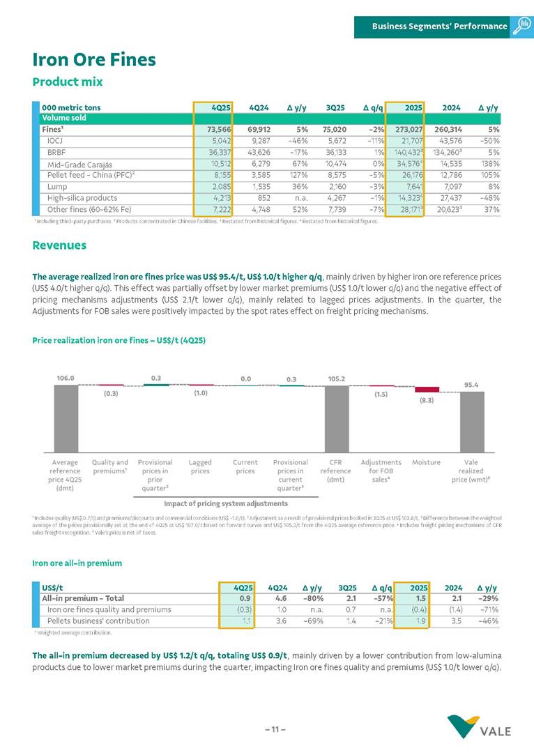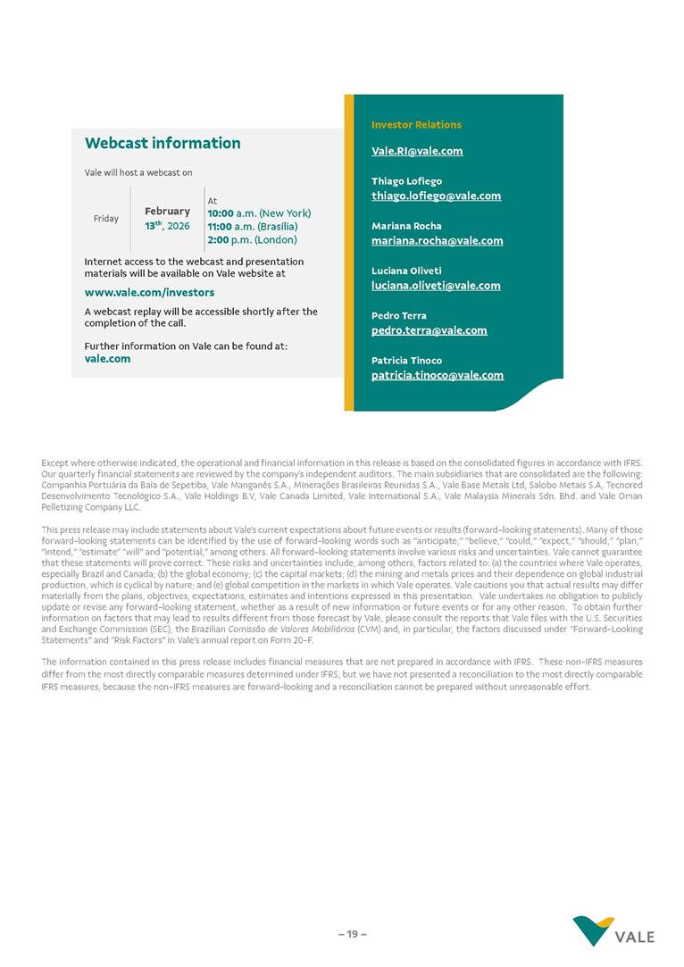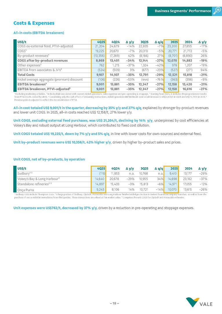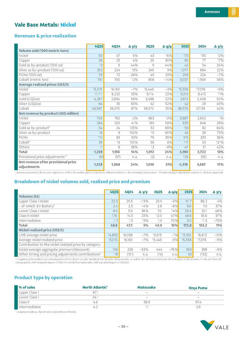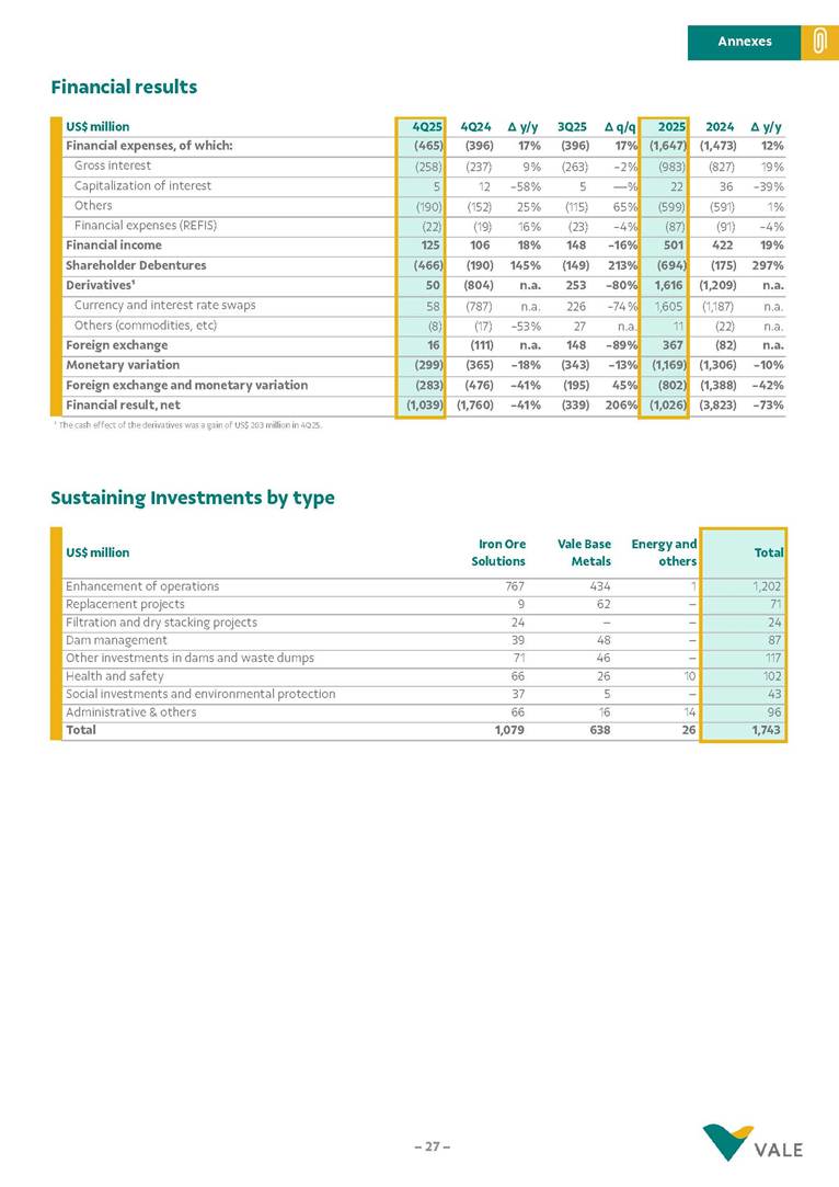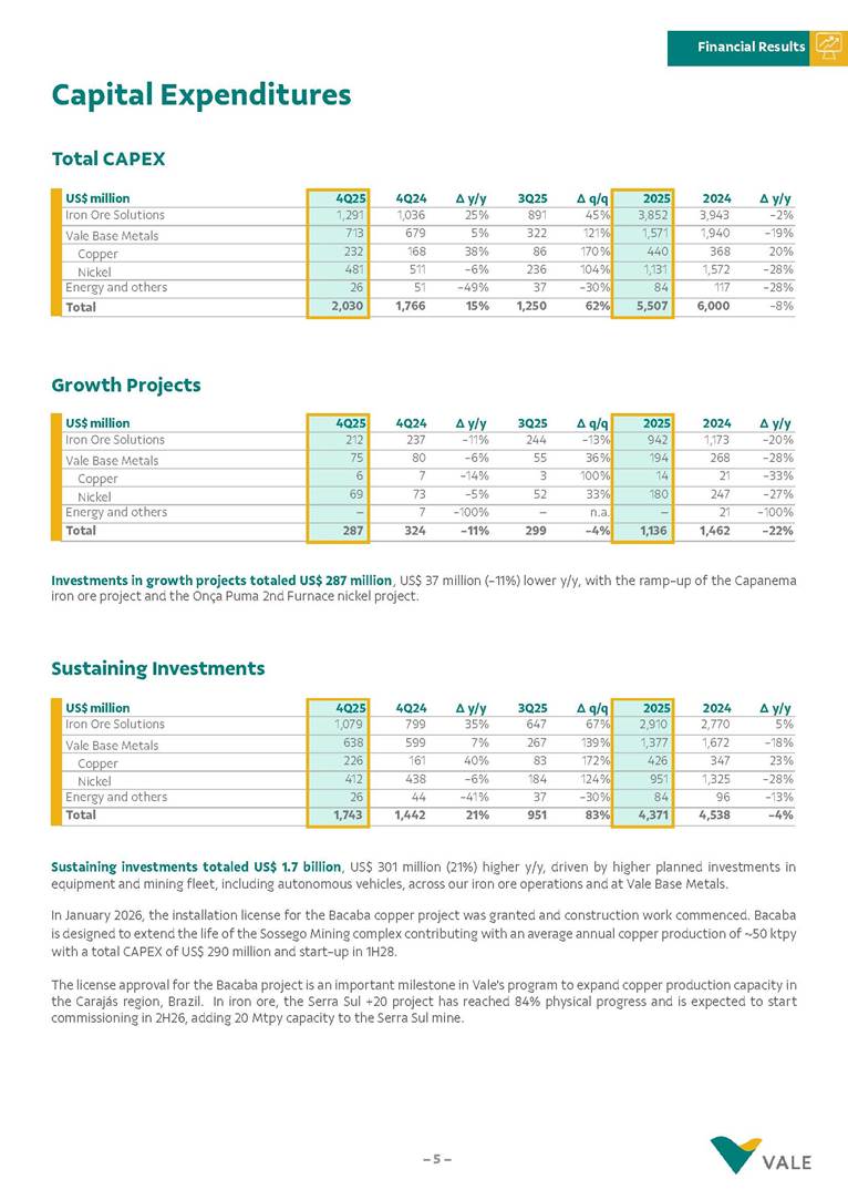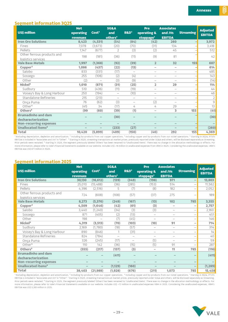 – 1 – 8. Selected financial indicators 9. US$ million 4Q25 4Q24 Δ y/y 3Q25 Δ q/q 2025 2024 Δ y/y Net operating revenues 11,060 10,124 9% 10,420 6% 38,403 38,056 1% 10. Total costs and expenses (ex-Brumadinho and dams decharacterization) (7,667) (7,376) 4% (7,229) 6% (27,496) (27,292) 1% Expenses related to Brumadinho and dams decharacterization (246) (111) 122% (30) n.a. (411) (277) 48% 11. Adjusted EBIT 3,728 2,992 25% 3,608 3% 12,353 11,783 5% 12. Adjusted EBITDA 4,588 3,794 21% 4,369 5% 15,458 14,840 4% 13. Proforma EBITDA1 4,834 4,119 17% 4,399 10% 15,869 15,392 3% 14. Proforma EBITDA margin (%) 44% 41% 3 p.p. 42% 2 p.p. 41% 40% 1 p.p. 5. Free cash flow 1,688 (100) n.a. 2,568 -34% 5,653 5,510 3% 6. Recurring free cash flow 1,688 817 107% 1,562 8% 4,762 3,771 26% 7. Attributable net income (3,844) (694) n.a. 2,685 n.a. 2,352 6,166 -62% 3. Proforma net income attributable to Vale’s shareholders 1,464 872 68% 2,744 -47% 7,796 6,102 28% 4. Net debt2 11,236 10,499 7% 12,452 -10% 11,236 10,499 7% 2. Expanded net debt 15,579 16,466 -5% 16,640 -6% 15,579 16,466 -5% 1. Capital expenditures 2,030 1,766 15% 1,250 62% 5,507 6,000 -8% 1 Excluding expenses related to Brumadinho and non-recurring items. 2 Including leases (IFRS 16). Results Highlights • Strong operational and cost performance across all business segments, with all 2025 guidances achieved. • Robust sales in 4Q25 and 2025. Iron ore, copper, and nickel sales increased by 5% (+4 Mt), 8% (+8 kt), and 5% (+3 kt) y/y in 4Q25, respectively. In 2025, sales increased 3% (+8 Mt), 12% (+41 kt) and 11% (+18 kt), respectively. • Average realized iron ore fines price was up 1% q/q and 3% y/y to US$ 95.4/t. Realized copper prices rose 12% q/q and 20% y/y to US$ 11,003/t. Realized nickel prices declined by 3% q/q and 7% y/y to US$ 15,015/t. • Iron ore C1 cash cost reached US$ 21.3/t in 2025, 2% lower y/y, marking the second consecutive year of cost reduction. In 4Q25, C1 cash cost also totaled US$ 21.3/t, 13% higher y/y, in line with guidance. Iron ore all-in costs reached US$ 54.2/t, 3% lower y/y in 2025 and US$ 54.3/t, 10% higher y/y in 4Q25. • Copper all-in costs were US$ -881/t in the quarter, while nickel all-in costs declined 35% y/y to US$ 9,001/t, mainly driven by strong by-product revenues and operational improvements across both segments. For 2025, all-in costs totaled US$ 603/t for copper and US$ 12,158/t for nickel, also marking the second consecutive year of all-in cost reduction. • Proforma EBITDA totaled US$ 4.8 billion, up 17% y/y and 10% q/q, reflecting higher contribution from Vale Base Metals. • Capital expenditures amounted to US$ 2.0 billion in 4Q25, in line with the US$ 5.5 billion CAPEX guidance for the year. • Recurring Free Cash Flow totaled US$ 1.7 billion, US$ 0.9 billion higher y/y, driven by stronger Proforma EBITDA and lower net financial expenses. • Expanded net debt reached US$ 15.6 billion at quarter-end, US$ 1.0 billion lower q/q, as a result of stronger FCF generation and Samarco-related provision adjustments. • US$1.8 billion in dividends and interest on capital to be paid in March, reflecting the dividend policy, in addition to the US$ 1.0 billion in extraordinary remuneration paid in January. Rio de Janeiro, February 12th, 2026 Vale’s performance in 4Q25 and 2025 “In 2025, Vale delivered an outstanding performance, achieving or exceeding all guidances, while advancing strategic priorities that reinforce our long-term ambition. We strengthened our commitment to safety, with meaningful reductions in high potential incidents, while accomplishing an important milestone in our safety journey, by having no dams at emergency Level 3. In our operations, we reached the highest iron ore and copper production levels since 2018 and delivered double digit production growth in nickel. This strong operational performance was supported by improved asset reliability and the successful ramp up of key growth projects, like Capanema, Vargem Grande, VBME and Onça Puma. At the same time, we continued to enhance our cost competitiveness, capturing structural efficiencies that improve our position in the global industry cost curve. Our disciplined capital allocation, coupled with strong execution and a more favorable cycle, enabled us to deliver superior shareholder returns. As we enter 2026, we remain focused on operational excellence, sustainable growth through initiatives such as the New Carajás Program, and on delivering superior long-term value for all our stakeholders.", commented Gustavo Pimenta, CEO – 2 – Business Highlights Iron Ore Solutions • Vale has continued to advance the commissioning of the Capanema and Vargem Grande 1 projects, with full ramp-up expected in 1H26 and 2H26, respectively. The Serra Sul +20 project construction also continues to progress, having 84% physical progress, with start-up expected in 2H26. Vale Base Metals • Construction works at the Bacaba project began following the construction license approval. The project will extend the life of the Sossego Mining Complex, adding approximately 50 ktpy of copper over its 8-year mine life, with a total planned CAPEX of US$ 290 million. • Vale Base Metals entered into an agreement with Glencore to assess a brownfield copper development in the Sudbury Basin, targeting a future 50/50 joint venture. The project is expected to produce 880 kt of copper over 21 years with US$1.6–2.0 billion in capital, alongside additional nickel, cobalt, gold and PGMs, with a 1H27 investment decision. Recent developments • Vale has completed the repurchase of 23% of its outstanding participating debentures, totaling US$ 703 million, following the optional acquisition offer launched in October. Concluded in November, this transaction marks a key milestone in Vale's financial liability management. ESG Tailing Dams • Maravilhas II dam, Vargem Grande dam and Dam 6 had their emergency levels removed, following the approval by ANM. The 
