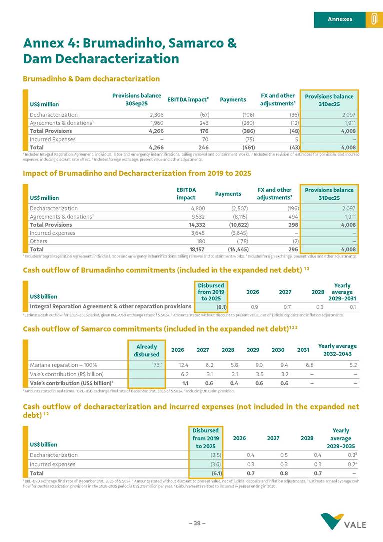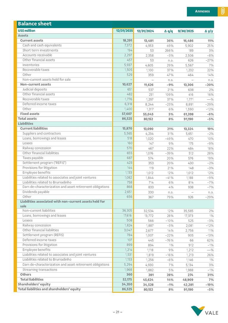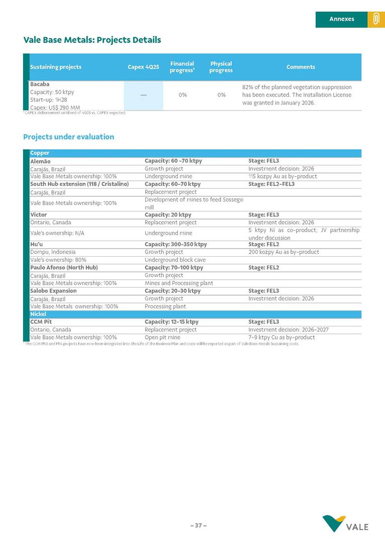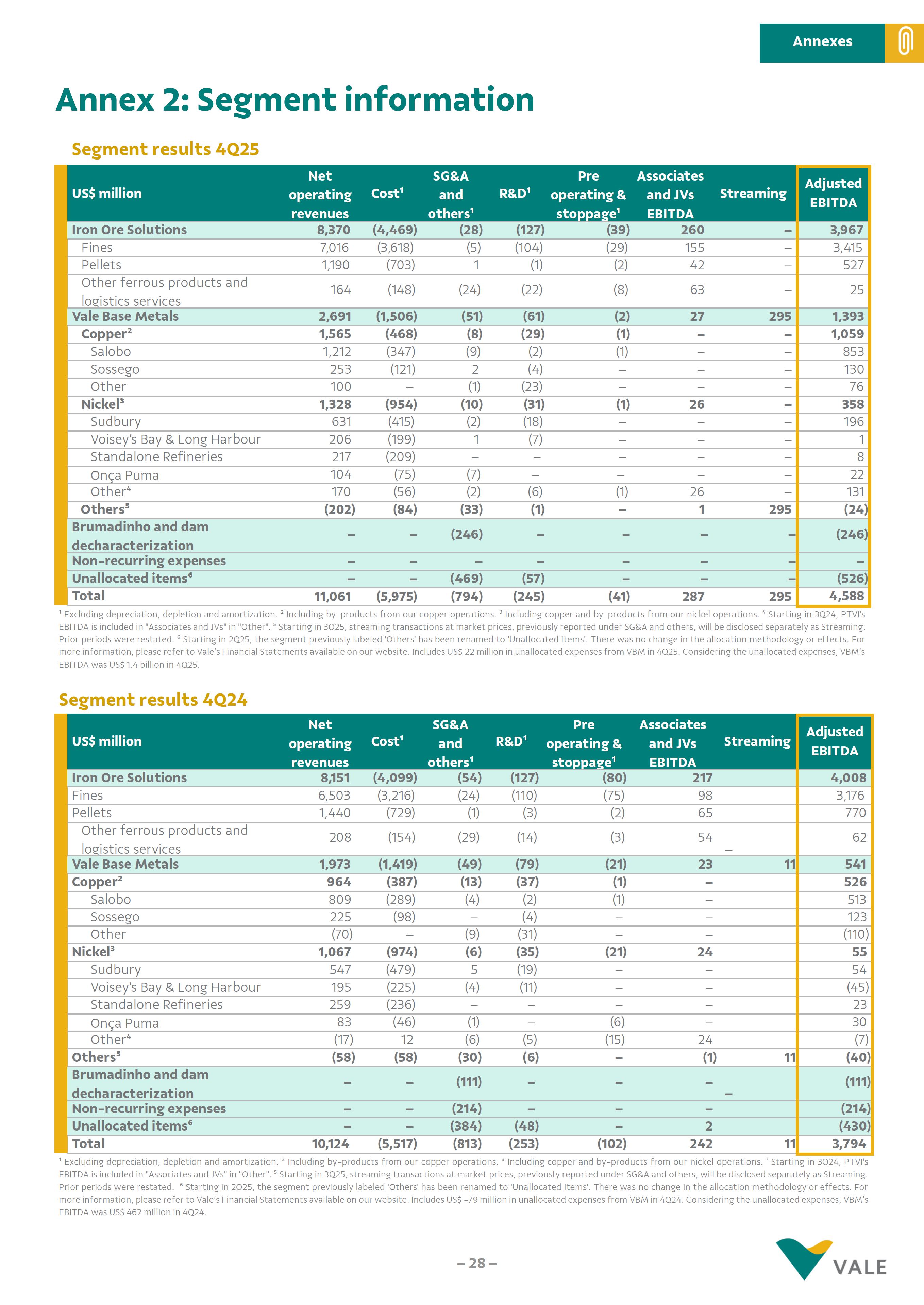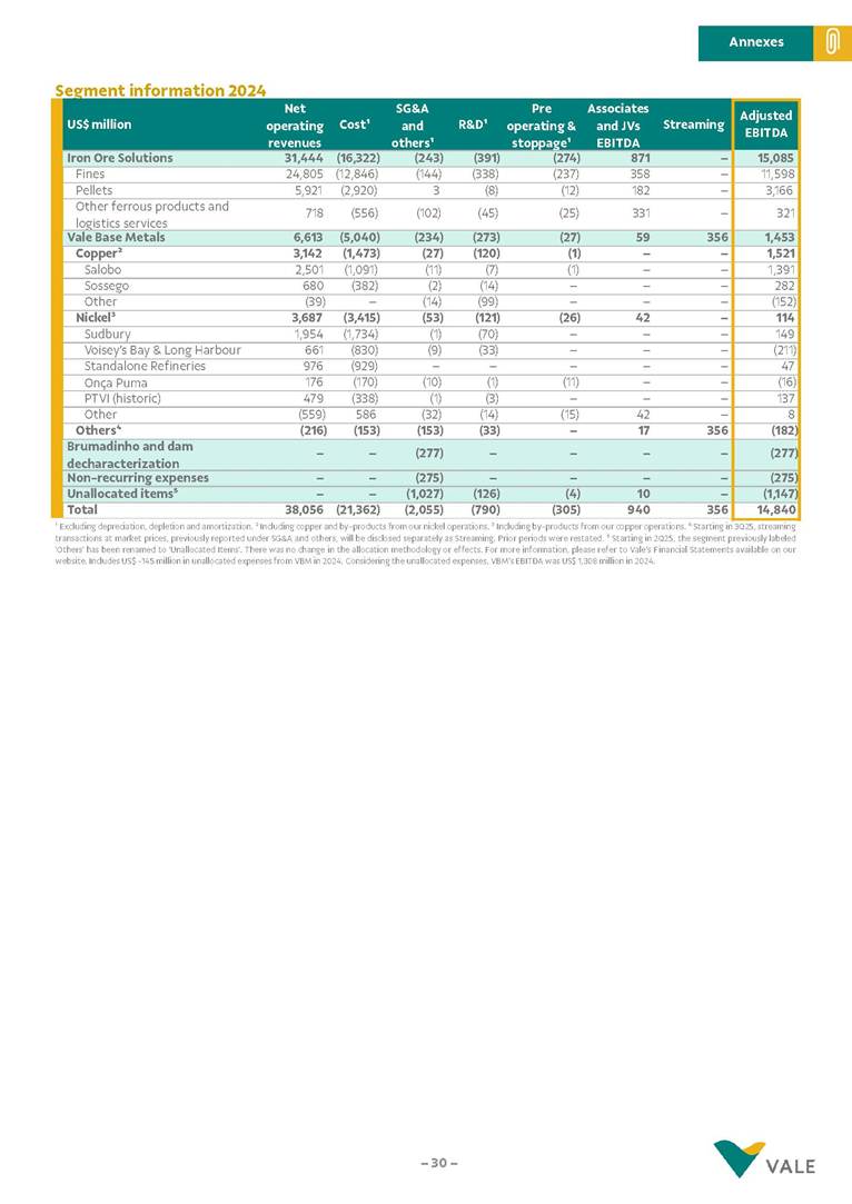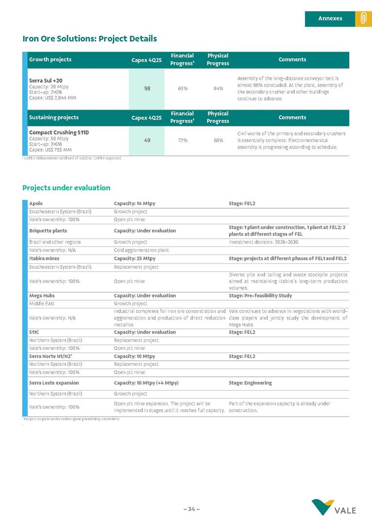 – 1 – 8. Selected financial indicators 9. US$ million 4Q25 4Q24 Δ y/y 3Q25 Δ q/q 2025 2024 Δ y/y Net operating revenues 11,060 10,124 9% 10,420 6% 38,403 38,056 1% 10. Total costs and expenses (ex-Brumadinho and dams decharacterization) (7,667) (7,376) 4% (7,229) 6% (27,496) (27,292) 1% Expenses related to Brumadinho and dams decharacterization (246) (111) 122% (30) n.a. (411) (277) 48% 11. Adjusted EBIT 3,728 2,992 25% 3,608 3% 12,353 11,783 5% 12. Adjusted EBITDA 4,588 3,794 21% 4,369 5% 15,458 14,840 4% 13. Proforma EBITDA1 4,834 4,119 17% 4,399 10% 15,869 15,392 3% 14. Proforma EBITDA margin (%) 44% 41% 3 p.p. 42% 2 p.p. 41% 40% 1 p.p. 5. Free cash flow 1,688 (100) n.a. 2,568 -34% 5,653 5,510 3% 6. Recurring free cash flow 1,688 817 107% 1,562 8% 4,762 3,771 26% 7. Attributable net income (3,844) (694) n.a. 2,685 n.a. 2,352 6,166 -62% 3. Proforma net income attributable to Vale’s shareholders 1,464 872 68% 2,744 -47% 7,796 6,102 28% 4. Net debt2 11,236 10,499 7% 12,452 -10% 11,236 10,499 7% 2. Expanded net debt 15,579 16,466 -5% 16,640 -6% 15,579 16,466 -5% 1. Capital expenditures 2,030 1,766 15% 1,250 62% 5,507 6,000 -8% 1 Excluding expenses related to Brumadinho and non-recurring items. 2 Including leases (IFRS 16). Results Highlights • Strong operational and cost performance across all business segments, with all 2025 guidances achieved. • Robust sales in 4Q25 and 2025. Iron ore, copper, and nickel sales increased by 5% (+4 Mt), 8% (+8 kt), and 5% (+3 kt) y/y in 4Q25, respectively. In 2025, sales increased 3% (+8 Mt), 12% (+41 kt) and 11% (+18 kt), respectively. • Average realized iron ore fines price was up 1% q/q and 3% y/y to US$ 95.4/t. Realized copper prices rose 12% q/q and 20% y/y to US$ 11,003/t. Realized nickel prices declined by 3% q/q and 7% y/y to US$ 15,015/t. • Iron ore C1 cash cost reached US$ 21.3/t in 2025, 2% lower y/y, marking the second consecutive year of cost reduction. In 4Q25, C1 cash cost also totaled US$ 21.3/t, 13% higher y/y, in line with guidance. Iron ore all-in costs reached US$ 54.2/t, 3% lower y/y in 2025 and US$ 54.3/t, 10% higher y/y in 4Q25. • Copper all-in costs were US$ -881/t in the quarter, while nickel all-in costs declined 35% y/y to US$ 9,001/t, mainly driven by strong by-product revenues and operational improvements across both segments. For 2025, all-in costs totaled US$ 603/t for copper and US$ 12,158/t for nickel, also marking the second consecutive year of all-in cost reduction. • Proforma EBITDA totaled US$ 4.8 billion, up 17% y/y and 10% q/q, reflecting higher contribution from Vale Base Metals. • Capital expenditures amounted to US$ 2.0 billion in 4Q25, in line with the US$ 5.5 billion CAPEX guidance for the year. • Recurring Free Cash Flow totaled US$ 1.7 billion, US$ 0.9 billion higher y/y, driven by stronger Proforma EBITDA and lower net financial expenses. • Expanded net debt reached US$ 15.6 billion at quarter-end, US$ 1.0 billion lower q/q, as a result of stronger FCF generation and Samarco-related provision adjustments. • US$1.8 billion in dividends and interest on capital to be paid in March, reflecting the dividend policy, in addition to the US$ 1.0 billion in extraordinary remuneration paid in January. Rio de Janeiro, February 12th, 2026 Vale’s performance in 4Q25 and 2025 “In 2025, Vale delivered an outstanding performance, achieving or exceeding all guidances, while advancing strategic priorities that reinforce our long-term ambition. We strengthened our commitment to safety, with meaningful reductions in high potential incidents, while accomplishing an important milestone in our safety journey, by having no dams at emergency Level 3. In our operations, we reached the highest iron ore and copper production levels since 2018 and delivered double digit production growth in nickel. This strong operational performance was supported by improved asset reliability and the successful ramp up of key growth projects, like Capanema, Vargem Grande, VBME and Onça Puma. At the same time, we continued to enhance our cost competitiveness, capturing structural efficiencies that improve our position in the global industry cost curve. Our disciplined capital allocation, coupled with strong execution and a more favorable cycle, enabled us to deliver superior shareholder returns. As we enter 2026, we remain focused on operational excellence, sustainable growth through initiatives such as the New Carajás Program, and on delivering superior long-term value for all our stakeholders.", commented Gustavo Pimenta, CEO – 2 – Business Highlights Iron Ore Solutions • Vale has continued to advance the commissioning of the Capanema and Vargem Grande 1 projects, with full ramp-up expected in 1H26 and 2H26, respectively. The Serra Sul +20 project construction also continues to progress, having 84% physical progress, with start-up expected in 2H26. Vale Base Metals • Construction works at the Bacaba project began following the construction license approval. The project will extend the life of the Sossego Mining Complex, adding approximately 50 ktpy of copper over its 8-year mine life, with a total planned CAPEX of US$ 290 million. • Vale Base Metals entered into an agreement with Glencore to assess a brownfield copper development in the Sudbury Basin, targeting a future 50/50 joint venture. The project is expected to produce 880 kt of copper over 21 years with US$1.6–2.0 billion in capital, alongside additional nickel, cobalt, gold and PGMs, with a 1H27 investment decision. Recent developments • Vale has completed the repurchase of 23% of its outstanding participating debentures, totaling US$ 703 million, following the optional acquisition offer launched in October. Concluded in November, this transaction marks a key milestone in Vale's financial liability management. ESG Tailing Dams • Maravilhas II dam, Vargem Grande dam and Dam 6 had their emergency levels removed, following the approval by ANM. The 