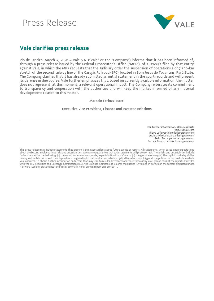 Vale clarifies press release Rio de Janeiro, March 4, 2026 – Vale S.A. (“Vale” or the “Company”) informs that it has been informed of, through a press release issued by the Federal Prosecutor’s Office (“MPF”), of a lawsuit filed by that entity against Vale, in which the MPF requests that the Judiciary order the suspension of operations along a 16‑km stretch of the second railway line of the Carajás Railroad (EFC), located in Bom Jesus do Tocantins, Pará State. The Company clarifies that it has already submitted an initial statement in the court records and will present its defense in due course. Vale further emphasizes that, based on currently available information, the matter does not represent, at this moment, a relevant operational impact. The Company reiterates its commitment to transparency and cooperation with the authorities and will keep the market informed of any material developments related to this matter. Marcelo Feriozzi Bacci Executive Vice President, Finance and Investor Relations For further information, please contact: Vale.RI@vale.com Thiago Lofiego: thiago.lofiego@vale.com Luciana Oliveti: luciana.oliveti@vale.com Pedro Terra: pedro.terra@vale.com Patricia Tinoco: patricia.tinoco@vale.com This press release may include statements that present Vale’s expectations about future events or results. All statements, when based upon expectations about the future, involve various risks and uncertainties. Vale cannot guarantee that such statements will prove correct. These risks and uncertainties include factors related to the following: (a) the countries where we operate, especially Brazil and Canada; (b) the global economy; (c) the capital markets; (d) the mining and metals prices and their dependence on global industrial production, which is cyclical by nature; and (e) global competition in the markets in which Vale operates. To obtain further information on factors that may lead to results different from those forecast by Vale, please consult the reports Vale files with the U.S. Securities and Exchange Commission (SEC), the Brazilian Comissão de Valores Mobiliários (CVM) and in particular the factors discussed under “Forward-Looking Statements” and “Risk Factors” in Vale’s annual report on Form 20-F. Press Release