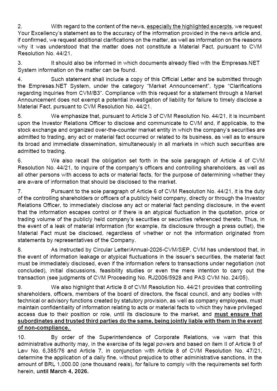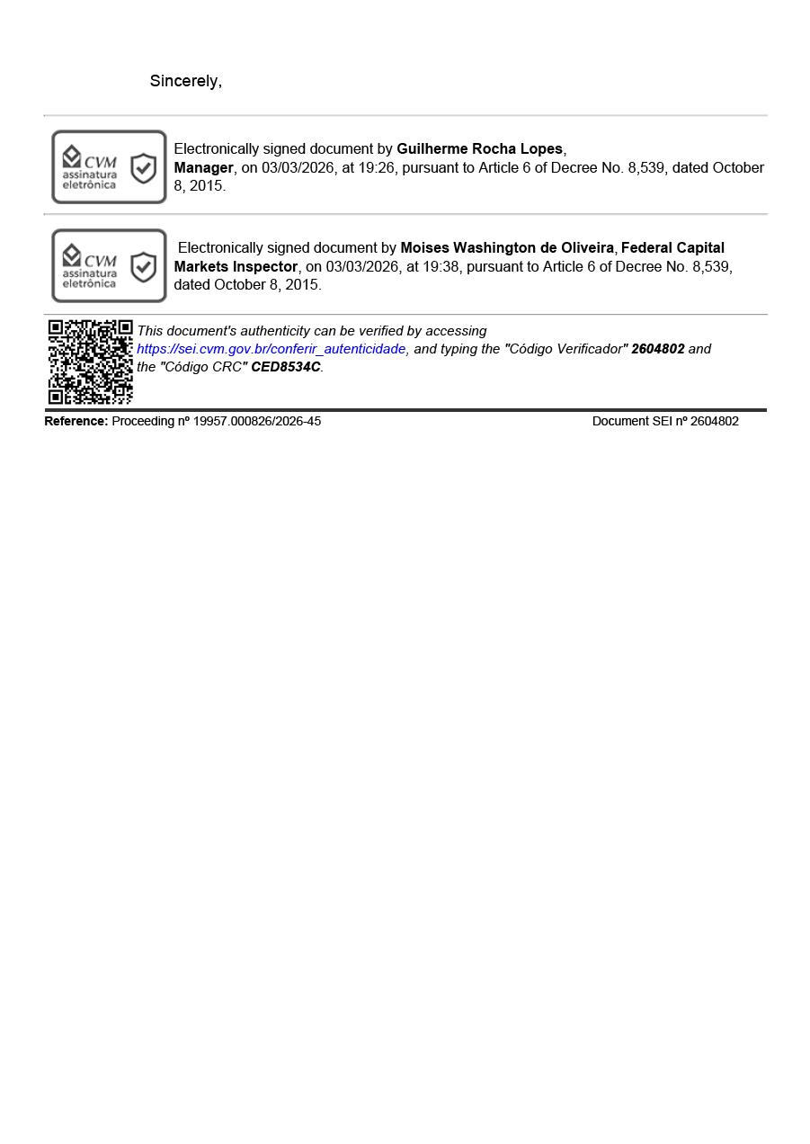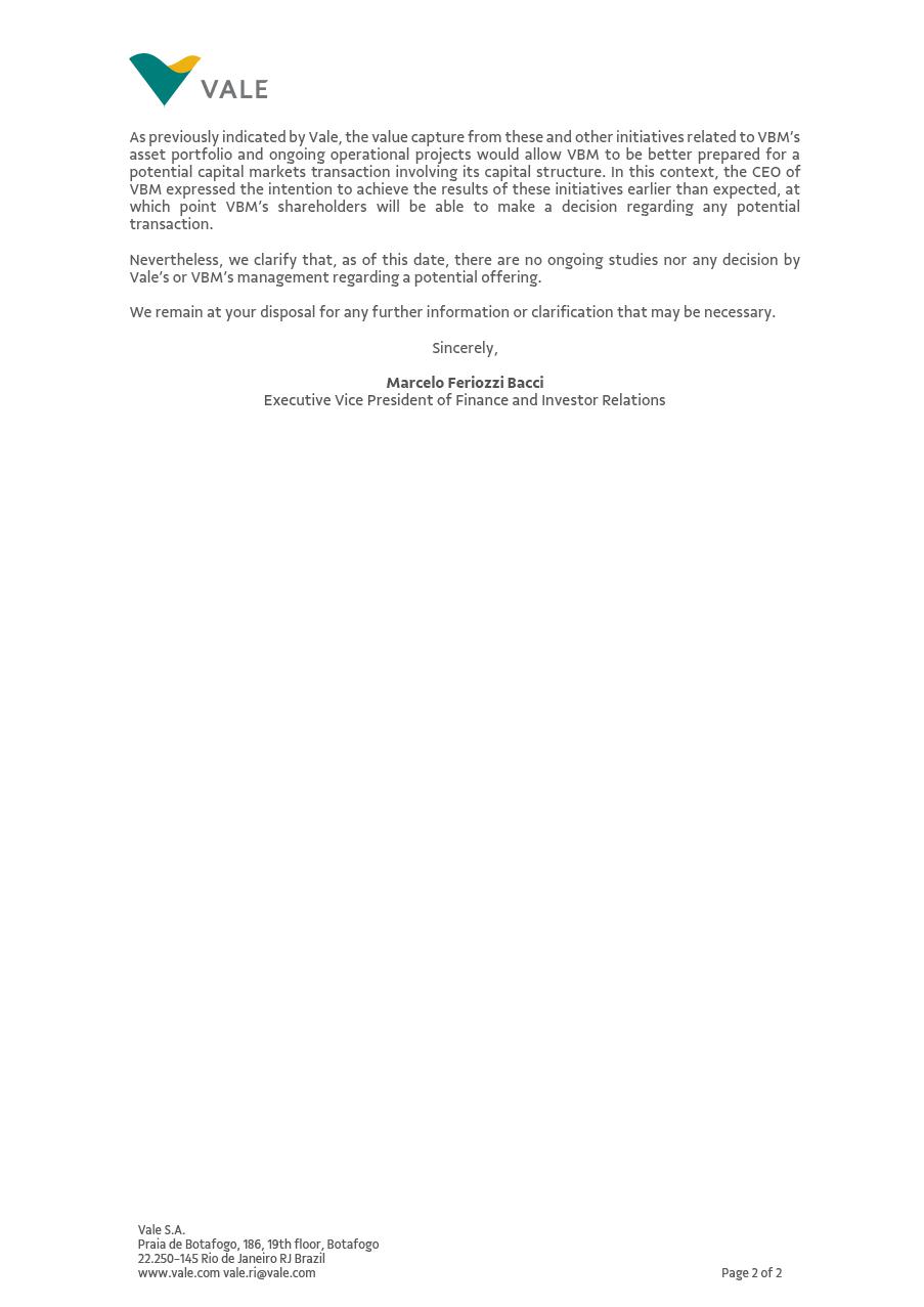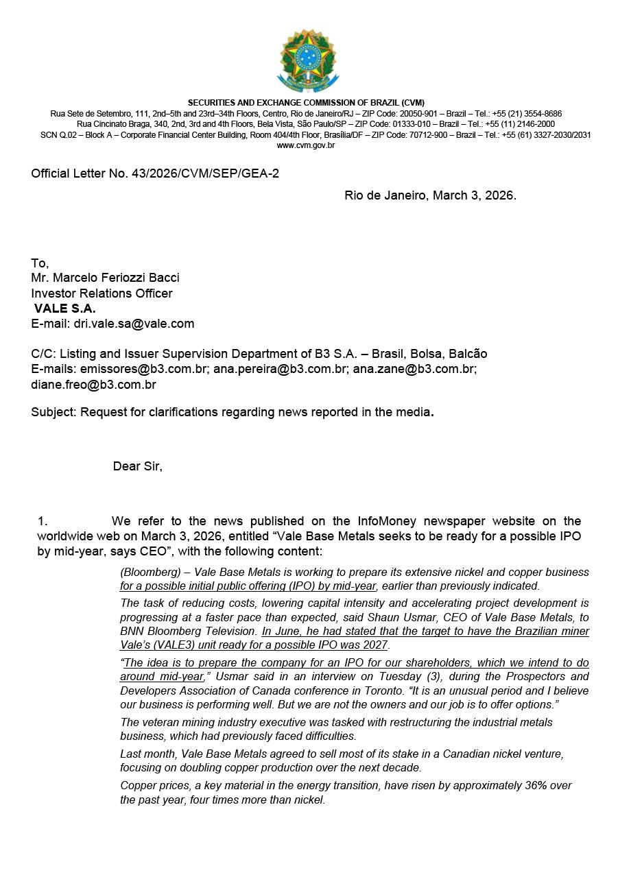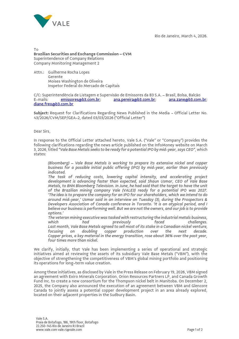 Vale S.A. Praia de Botafogo, 186, 19th floor, Botafogo 22.250-145 Rio de Janeiro RJ Brazil www.vale.com vale.ri@vale.com Page 1 of 2 Rio de Janeiro, March 4, 2026. To Brazilian Securities and Exchange Commission – CVM Superintendence of Company Relations Company Monitoring Management 2 Attn.: Guilherme Rocha Lopes Gerente Moises Washington de Oliveira Inspetor Federal do Mercado de Capitais C/C: Superintendência de Listagem e Supervisão de Emissores da B3 S.A. – Brasil, Bolsa, Balcão E-mails: emissores@b3.com.br; ana.pereira@b3.com.br; ana.zane@b3.com.br; diane.freo@b3.com.br Subject: Request for Clarifications Regarding News Published in the Media - Official Letter No. 43/2026/CVM/SEP/GEA-2, dated 03/03/2026 (“Official Letter”) Dear Sirs, In response to the Official Letter attached hereto, Vale S.A. (“Vale” or “Company”) provides the following clarifications regarding the news article published on the InfoMoney website on March 3, 2026, titled “Vale Base Metals seeks to be ready for a potential IPO by mid-year, says CEO”, which states: (Bloomberg) – Vale Base Metals is working to prepare its extensive nickel and copper business for a possible initial public offering (IPO) by mid-year, earlier than previously indicated. The task of reducing costs, lowering capital intensity, and accelerating project development is advancing faster than expected, said Shaun Usmar, CEO of Vale Base Metals, to BNN Bloomberg Television. In June, he had said that the target to have the unit of the Brazilian mining company Vale (VALE3) ready for a potential IPO was 2027. ‘The idea is to prepare the company for an IPO for our shareholders, which we intend to do around mid-year,’ Usmar said in an interview on Tuesday (3), during the Prospectors & Developers Association of Canada conference in Toronto. ‘It is an atypical period, and I believe our business is performing well. But we are not the owners, and our job is to provide options.’ The veteran mining executive was tasked with restructuring the industrial metals business, which had previously faced challenges. Last month, Vale Base Metals agreed to sell most of its stake in a Canadian nickel venture, focusing on doubling copper production over the next decade. Copper prices, a key material in the energy transition, rose about 36% over the past year, four times more than nickel. We clarify, initially, that Vale has been implementing a series of operational and strategic initiatives aimed at reviewing the assets of its subsidiary Vale Base Metals (“VBM”), with the objective of strengthening the competitiveness of VBM’s global mining portfolio and positioning its operations for long-term value creation. Among these initiatives, as disclosed by Vale in the Press Release on February 19, 2026, VBM signed an agreement with Exiro Minerals Corporation, Orion Resources Partners LP, and Canada Growth Fund Inc. to create a new consortium for the Thompson nickel belt in Manitoba. On December 2, 2025, the Company also announced the execution of an agreement between VBM and Glencore Canada to jointly assess a potential copper development project in an area already explored, located on their adjacent properties in the Sudbury Basin. Vale S.A. Praia de Botafogo, 186, 19th floor, Botafogo 22.250-145 Rio de Janeiro RJ Brazil www.vale.com vale.ri@vale.com Page 2 of 2 As previously indicated by Vale, the value capture from these and other initiatives related to VBM’s asset portfolio and ongoing operational projects would allow VBM to be better prepared for a potential capital markets transaction involving its capital structure. In this context, the CEO of VBM expressed the intention to achieve the results of these initiatives earlier than expected, at which point VBM’s shareholders will be able to make a decision regarding any potential transaction. Nevertheless, we clarify that, as of this date, there are no ongoing studies nor any decision by Vale’s or VBM’s management regarding a potential offering. We remain at your disposal for any further information or clarification that may be necessary. Sincerely, Marcelo Feriozzi Bacci Executive Vice President of Finance and Investor Relations SECURITIES AND EXCHANGE COMMISSION OF BRAZIL (CVM) Rua Sete de Setembro, 111, 2nd–5th and 23rd–34th Floors, Centro, Rio de Janeiro/RJ – ZIP Code: 20050-901 – Brazil – Tel.: +55 (21) 3554-8686 Rua Cincinato Braga, 340, 2nd, 3rd and 4th Floors, Bela Vista, São Paulo/SP – ZIP Code: 01333-010 – Brazil – Tel.: +55 (11) 2146-2000 SCN Q.02 – Block A – Corporate Financial Center Building, Room 404/4th Floor, Brasília/DF – ZIP Code: 70712-900 – Brazil – Tel.: +55 (61) 3327-2030/2031 www.cvm.gov.br Official Letter No. 43/2026/CVM/SEP/GEA-2 Rio de Janeiro, March 3, 2026. To, Mr. Marcelo Feriozzi Bacci Investor Relations Officer VALE S.A. E-mail: dri.vale.sa@vale.com C/C: Listing and Issuer Supervision Department of B3 S.A. – Brasil, Bolsa, Balcão E-mails: emissores@b3.com.br; ana.pereira@b3.com.br; ana.zane@b3.com.br; diane.freo@b3.com.br Subject: Request for clarifications regarding news reported in the media. Dear Sir, 1. We refer to the news published on the InfoMoney newspaper website on the worldwide web on March 3, 2026, entitled “Vale Base Metals seeks to be ready for a possible IPO by mid-year, says CEO”, with the following content: (Bloomberg) – Vale Base Metals is working to prepare its extensive nickel and copper business for a possible initial public offering (IPO) by mid-year, earlier than previously indicated. The task of reducing costs, lowering capital intensity and accelerating project development is progressing at a faster pace than expected, said Shaun Usmar, CEO of Vale Base Metals, to BNN Bloomberg Television. In June, he had stated that the target to have the Brazilian miner Vale’s (VALE3) unit ready for a possible IPO was 2027. “The idea is to prepare the company for an IPO for our shareholders, whi