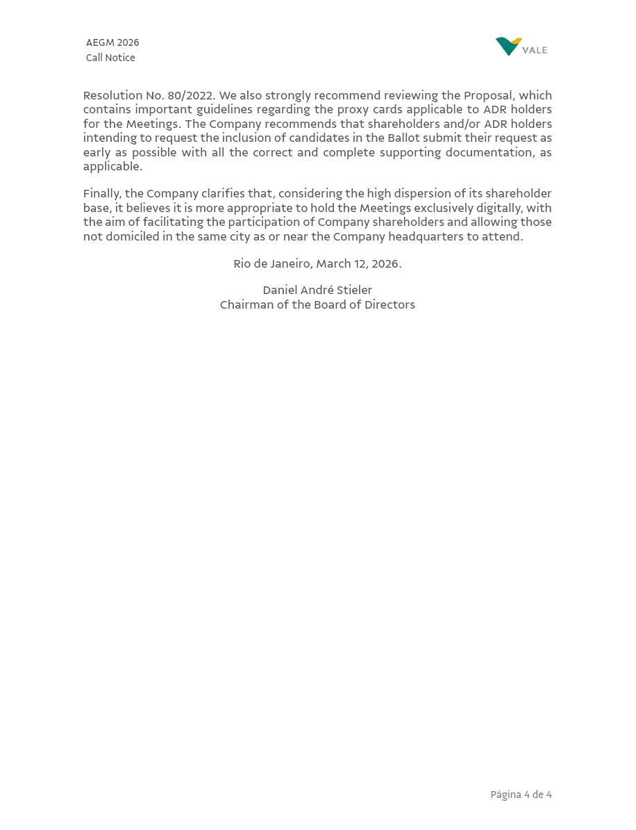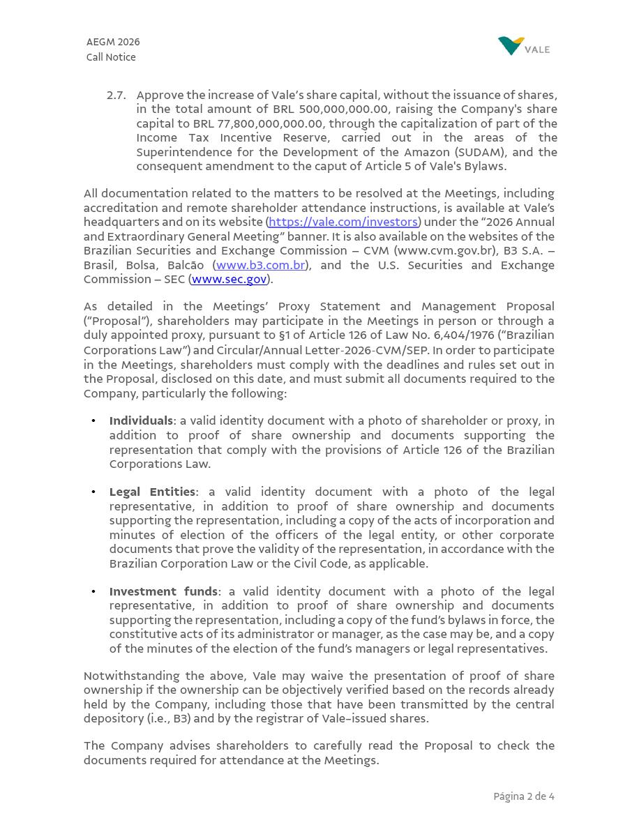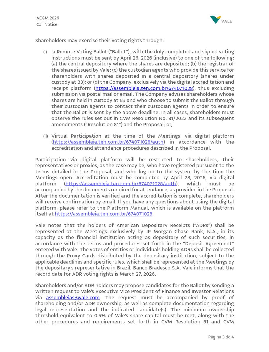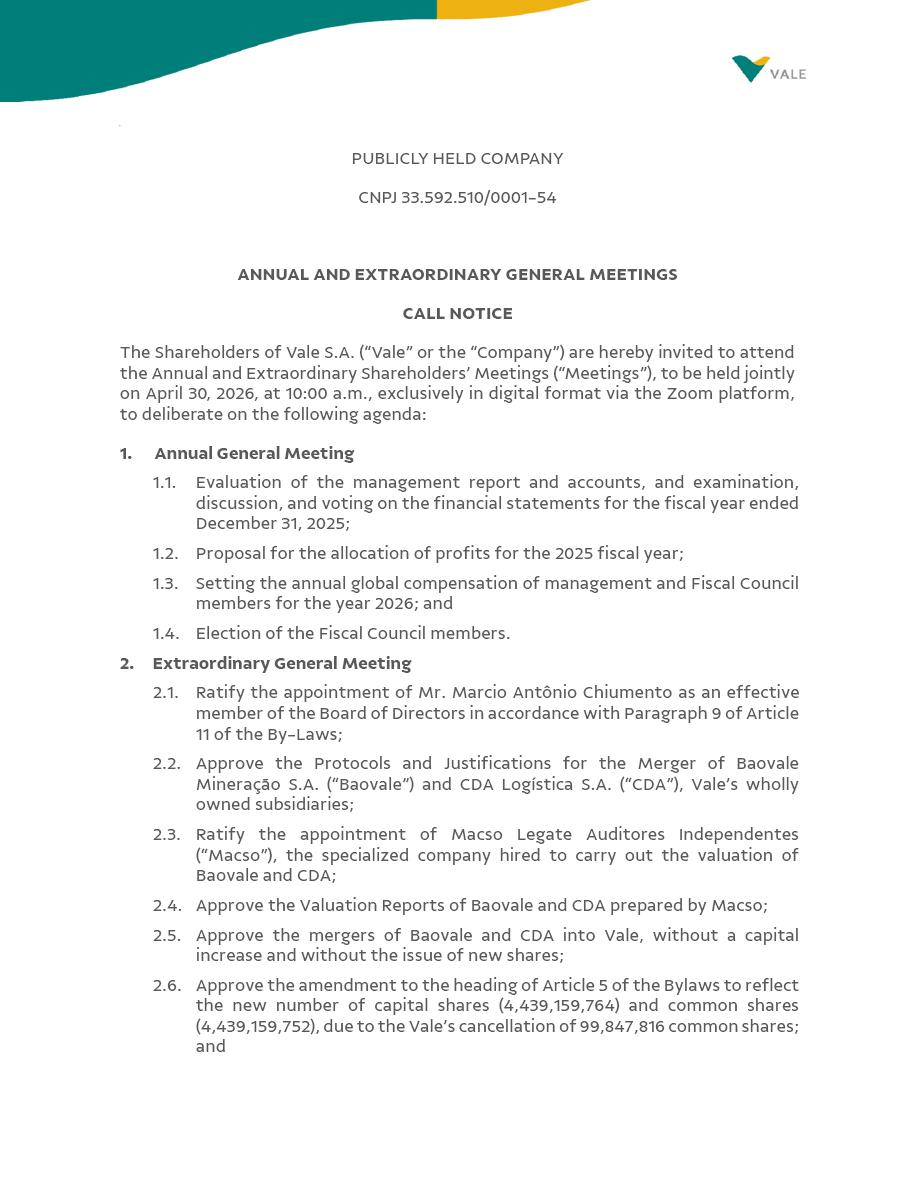 ] PUBLICLY HELD COMPANY CNPJ 33.592.510/0001-54 ANNUAL AND EXTRAORDINARY GENERAL MEETINGS CALL NOTICE The Shareholders of Vale S.A. (“Vale” or the “Company”) are hereby invited to attend the Annual and Extraordinary Shareholders’ Meetings (“Meetings”), to be held jointly on April 30, 2026, at 10:00 a.m., exclusively in digital format via the Zoom platform, to deliberate on the following agenda: 1. Annual General Meeting 1.1. Evaluation of the management report and accounts, and examination, discussion, and voting on the financial statements for the fiscal year ended December 31, 2025; 1.2. Proposal for the allocation of profits for the 2025 fiscal year; 1.3. Setting the annual global compensation of management and Fiscal Council members for the year 2026; and 1.4. Election of the Fiscal Council members. 2. Extraordinary General Meeting 2.1. Ratify the appointment of Mr. Marcio Antônio Chiumento as an effective member of the Board of Directors in accordance with Paragraph 9 of Article 11 of the By-Laws; 2.2. Approve the Protocols and Justifications for the Merger of Baovale Mineração S.A. (“Baovale”) and CDA Logística S.A. (“CDA”), Vale’s wholly owned subsidiaries; 2.3. Ratify the appointment of Macso Legate Auditores Independentes (“Macso”), the specialized company hired to carry out the valuation of Baovale and CDA; 2.4. Approve the Valuation Reports of Baovale and CDA prepared by Macso; 2.5. Approve the mergers of Baovale and CDA into Vale, without a capital increase and without the issue of new shares; 2.6. Approve the amendment to the heading of Article 5 of the Bylaws to reflect the new number of capital shares (4,439,159,764) and common shares (4,439,159,752), due to the Vale’s cancellation of 99,847,816 common shares; and AEGM 2026 Call Notice Página 2 de 4 2.7. Approve the increase of Vale’s share capital, without the issuance of shares, in the total amount of BRL 500,000,000.00, raising the Company's share capital to BRL 77,800,000,000.00, through the capitalization of part of the Income Tax Incentive Reserve, carried out in the areas of the Superintendence for the Development of the Amazon (SUDAM), and the consequent amendment to the caput of Article 5 of Vale's Bylaws. All documentation related to the matters to be resolved at the Meetings, including accreditation and remote shareholder attendance instructions, is available at Vale’s headquarters and on its website (https://vale.com/investors) under the “2026 Annual and Extraordinary General Meeting” banner. It is also available on the websites of the Brazilian Securities and Exchange Commission – CVM (www.cvm.gov.br), B3 S.A. – Brasil, Bolsa, Balcão (www.b3.com.br), and the U.S. Securities and Exchange Commission – SEC (www.sec.gov). As detailed in the Meetings’ Proxy Statement and Management Proposal (“Proposal”), shareholders may participate in the Meetings in person or through a duly appointed proxy, pursuant to §1 of Article 126 of Law No. 6,404/1976 (“Brazilian Corporations Law”) and Circular/Annual Letter‑2026‑CVM/SEP. In order to participate in the Meetings, shareholders must comply with the deadlines and rules set out in the Proposal, disclosed on this date, and must submit all documents required to the Company, particularly the following: • Individuals: a valid identity document with a photo of shareholder or proxy, in addition to proof of share ownership and documents supporting the representation that comply with the provisions of Article 126 of the Brazilian Corporations Law. • Legal Entities: a valid identity document with a photo of the legal representative, in addition to proof of share ownership and documents supporting the representation, including a copy of the acts of incorporation and minutes of election of the officers of the legal entity, or other corporate documents that prove the validity of the representation, in accordance with the Brazilian Corporation Law or the Civil Code, as applicable. • Investment funds: a valid identity document with a photo of the legal representative, in addition to proof of share ownership and documents supporting the representation, including a copy of the fund’s bylaws in force, the constitutive acts of its administrator or manager, as the case may be, and a copy of the minutes of the election of the fund’s managers or legal representatives. Notwithstanding the above, Vale may waive the presentation of proof of share ownership if the ownership can be objectively verified based on the records already held by the Company, including those that have been transmitted by the central depository (i.e., B3) and by the registrar of Vale-issued shares. The Company advises shareholders to carefully read the Proposal to check the documents required for attendance at the Meetings. AEGM 2026 Call Notice Página 3 de 4 Shareholders may exercise their voting rights through: (i) a Remote Voting Ballot (“Ballot”), with the duly completed and signed voting instructions must be sent by April 26, 2026 (inclusive) to one of the following: (a) the central depository where the shares are deposited; (b) the registrar of the shares issued by Vale; (c) the custodian agents who provide this service for shareholders with shares deposited in a central depository (shares under custody at B3); or (d) the Company, exclusively via the digital accreditation and receipt platform (https://assembleia.ten.com.br/674071028), thus excluding submission via postal mail or email. The Company advises shareholders whose shares are held in custody at B3 and who choose to submit the Ballot through their custodian agents to contact their custodian agents in order to ensure that the Ballot is sent by the above deadline. In all cases, shareholders must observe the rules set out in CVM Resolution No. 81/2022 and its subsequent amendments (“Resolution 81”) and the Proposal; or, (ii) Virtual Participation at the time of the Meetings, via digita