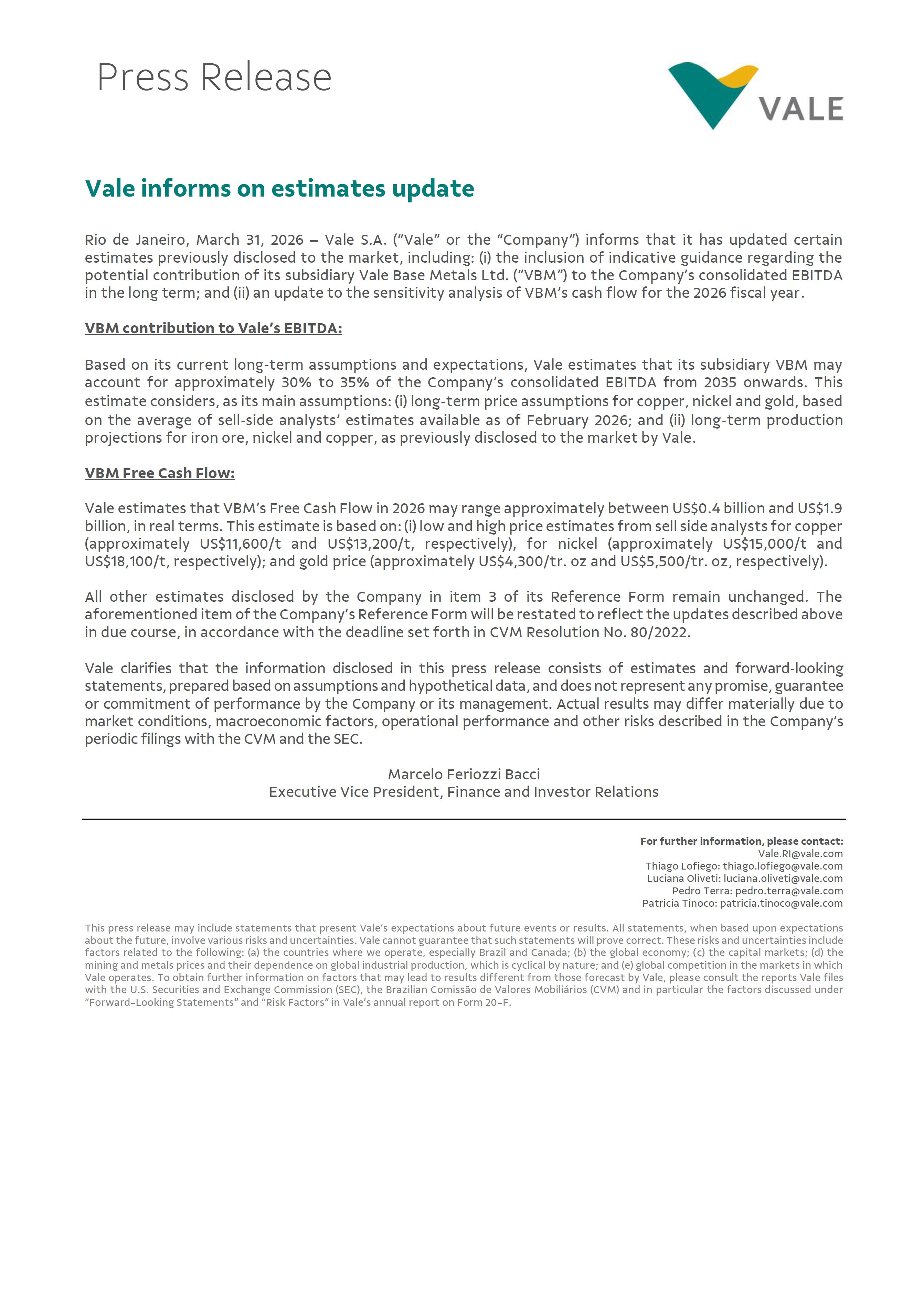 Vale informs on estimates update Rio de Janeiro, March 31, 2026 – Vale S.A. (“Vale” or the “Company”) informs that it has updated certain estimates previously disclosed to the market, including: (i) the inclusion of indicative guidance regarding the potential contribution of its subsidiary Vale Base Metals Ltd. (“VBM”) to the Company’s consolidated EBITDA in the long term; and (ii) an update to the sensitivity analysis of VBM’s cash flow for the 2026 fiscal year. VBM contribution to Vale’s EBITDA: Based on its current long‑term assumptions and expectations, Vale estimates that its subsidiary VBM may account for approximately 30% to 35% of the Company’s consolidated EBITDA from 2035 onwards. This estimate considers, as its main assumptions: (i) long‑term price assumptions for copper, nickel and gold, based on the average of sell‑side analysts’ estimates available as of February 2026; and (ii) long‑term production projections for iron ore, nickel and copper, as previously disclosed to the market by Vale. VBM Free Cash Flow: Vale estimates that VBM’s Free Cash Flow in 2026 may range approximately between US$0.4 billion and US$1.9 billion, in real terms. This estimate is based on: (i) low and high price estimates from sell side analysts for copper (approximately US$11,600/t and US$13,200/t, respectively), for nickel (approximately US$15,000/t and US$18,100/t, respectively); and gold price (approximately US$4,300/tr. oz and US$5,500/tr. oz, respectively). All other estimates disclosed by the Company in item 3 of its Reference Form remain unchanged. The aforementioned item of the Company’s Reference Form will be restated to reflect the updates described above in due course, in accordance with the deadline set forth in CVM Resolution No. 80/2022. Vale clarifies that the information disclosed in this press release consists of estimates and forward‑looking statements, prepared based on assumptions and hypothetical data, and does not represent any promise, guarantee or commitment of performance by the Company or its management. Actual results may differ materially due to market conditions, macroeconomic factors, operational performance and other risks described in the Company’s periodic filings with the CVM and the SEC. Marcelo Feriozzi Bacci Executive Vice President, Finance and Investor Relations For further information, please contact: Vale.RI@vale.com Thiago Lofiego: thiago.lofiego@vale.com Luciana Oliveti: luciana.oliveti@vale.com Pedro Terra: pedro.terra@vale.com Patricia Tinoco: patricia.tinoco@vale.com This press release may include statements that present Vale’s expectations about future events or results. All statements, when based upon expectations about the future, involve various risks and uncertainties. Vale cannot guarantee that such statements will prove correct. These risks and uncertainties include factors related to the following: (a) the countries where we operate, especially Brazil and Canada; (b) the global economy; (c) the capital markets; (d) the mining and metals prices and their dependence on global industrial production, which is cyclical by nature; and (e) global competition in the markets in which Vale operates. To obtain further information on factors that may lead to results different from those forecast by Vale, please consult the reports Vale files with the U.S. Securities and Exchange Commission (SEC), the Brazilian Comissão de Valores Mobiliários (CVM) and in particular the factors discussed under “Forward-Looking Statements” and “Risk Factors” in Vale’s annual report on Form 20-F. Press Release