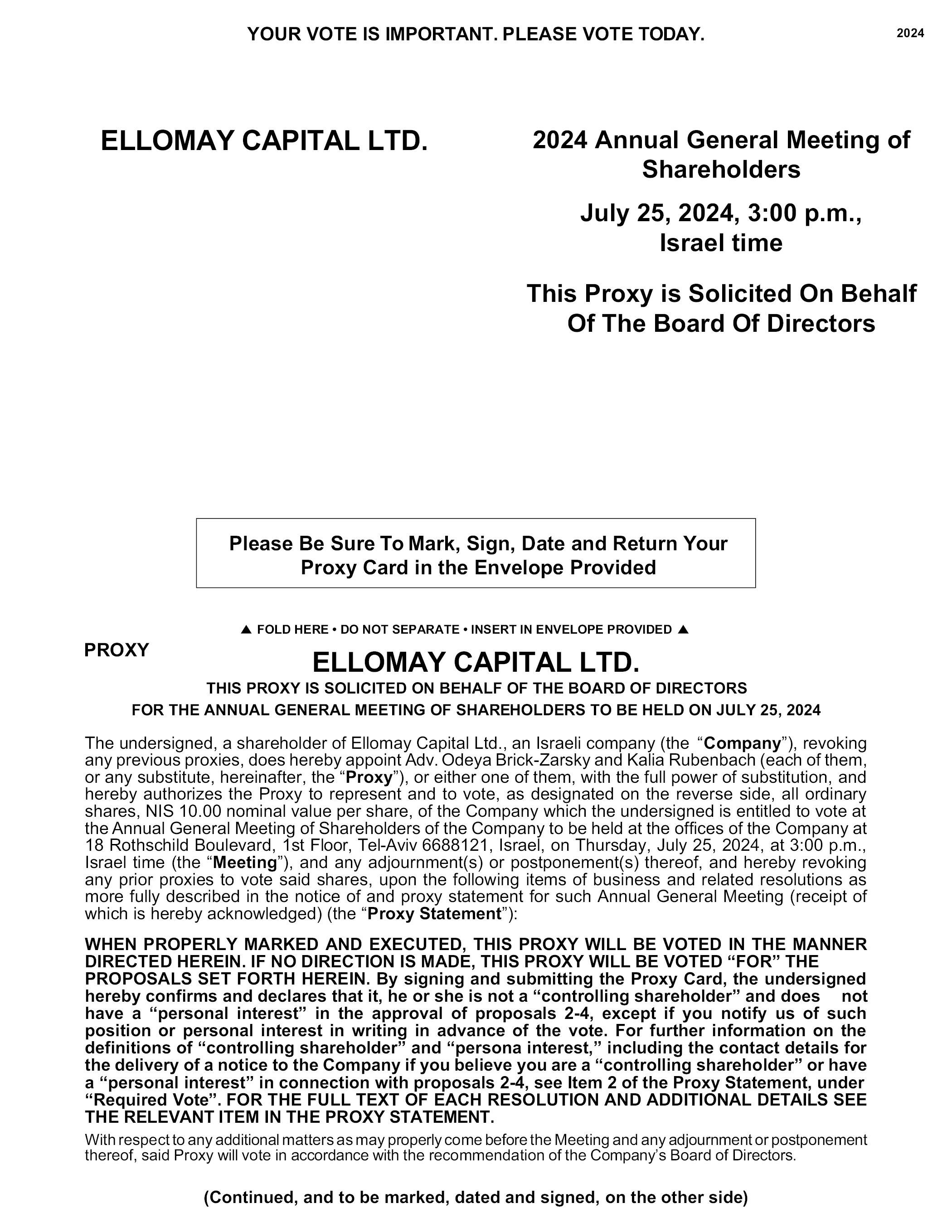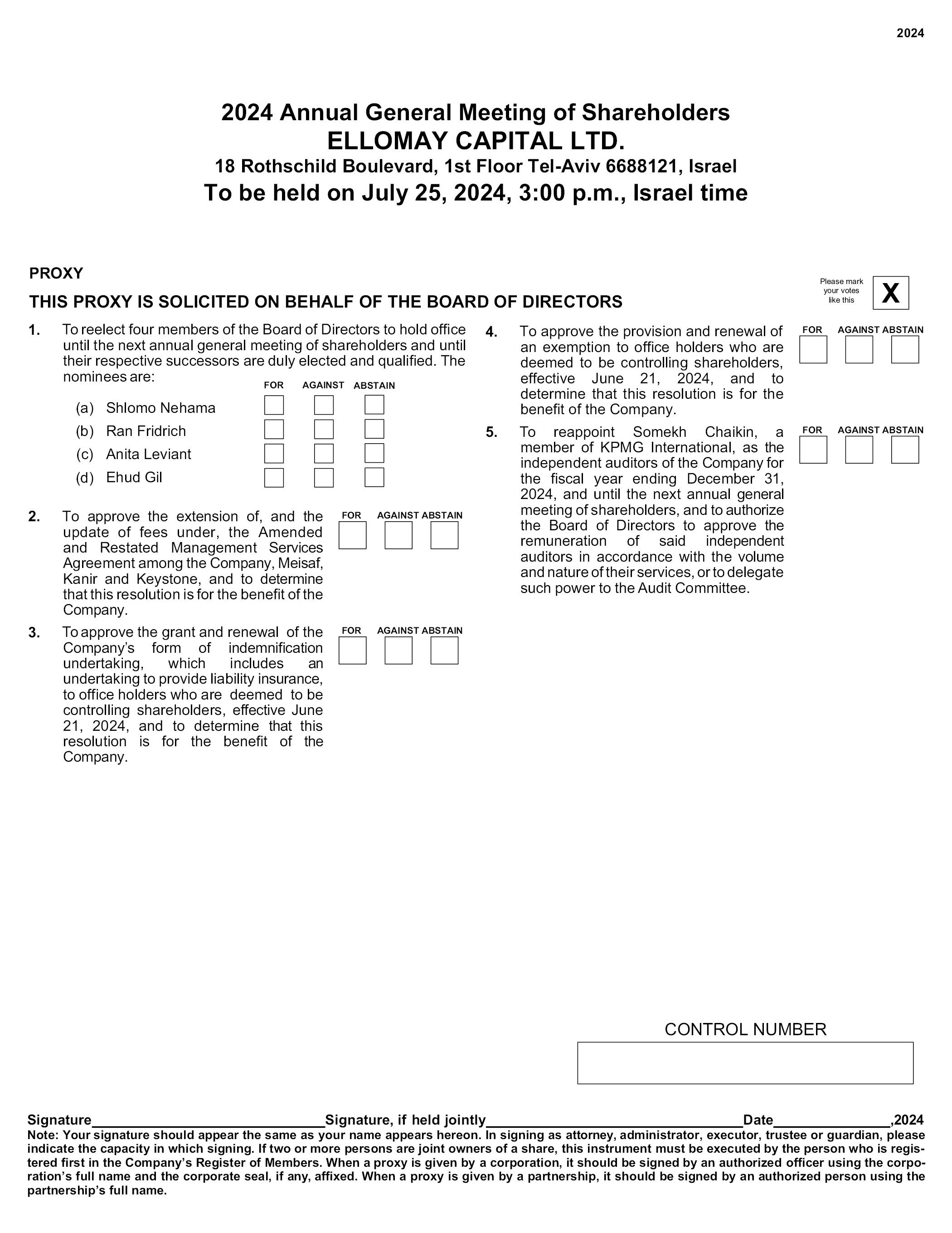 2024 2024 Annual General Meeting of Shareholders ELLOMAY CAPITAL LTD. 18 Rothschild Boulevard, 1st Floor Tel-Aviv 6688121, Israel To be held on July 25, 2024, 3:00 p.m., Israel time PROXY THIS PROXY IS SOLICITED ON BEHALF OF THE BOARD OF DIRECTORS Please mark your votes like this 1. To reelect four members of the Board of Directors to hold office until the next annual general meeting of shareholders and until their respective successors are duly elected and qualified. The 4. To approve the provision and renewal of an exemption to office holders who are deemed to be controlling shareholders, effective June 21, 2024, and to determine that this resolution is for the benefit of the Company. FOR AGAINST ABSTAIN nominees are: FOR AGAINST ABSTAIN (a) (b) (c) (d) Shlomo Nehama Ran Fridrich Anita Leviant Ehud Gil 5. To reappoint Somekh Chaikin, a FOR AGAINST ABSTAIN member of KPMG International, as the independent auditors of the Company for the fiscal year ending December 31, 2024, and until the next annual general meeting of shareholders, and to authorize the Board of Directors to approve the remuneration of said independent auditors in accordance with the volume and nature of their services, or to delegate such power to the Audit Committee. 2. To approve the extension of, and the FOR AGAINST ABSTAIN update of fees under, the Amended and Restated Management Services Agreement among the Company, Meisaf, Kanir and Keystone, and to determine that this resolution is for the benefit of the Company. To approve the grant and renewal of the Company’s form of indemnification undertaking, which includes an undertaking to provide liability insurance, to office holders who are deemed to be controlling shareholders, effective June 21, 2024, and to determine that this resolution is for the benefit of the Company. 3. FOR AGAINST ABSTAIN CONTROL NUMBER Signature Signature, if held jointly Date ,2024 Note: Your signature should appear the same as your name appears hereon. In signing as attorney, administrator, executor, trustee or guardian, please indicate the capacity in which signing. If two or more persons are joint owners of a share, this instrument must be executed by the person who is registered first in the Company’s Register of Members. When a proxy is given by a corporation, it should be signed by an authorized officer using the corporation’s full name and the corporate seal, if any, affixed. When a proxy is given by a partnership, it should be signed by an authorized person using the partnership’s full name.