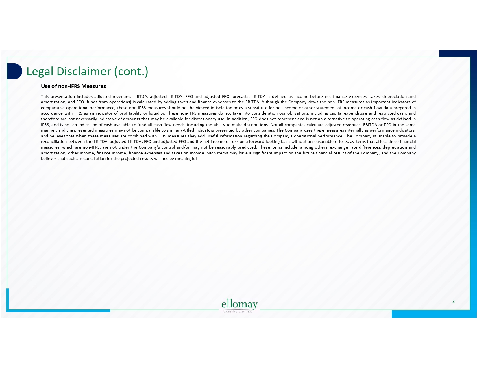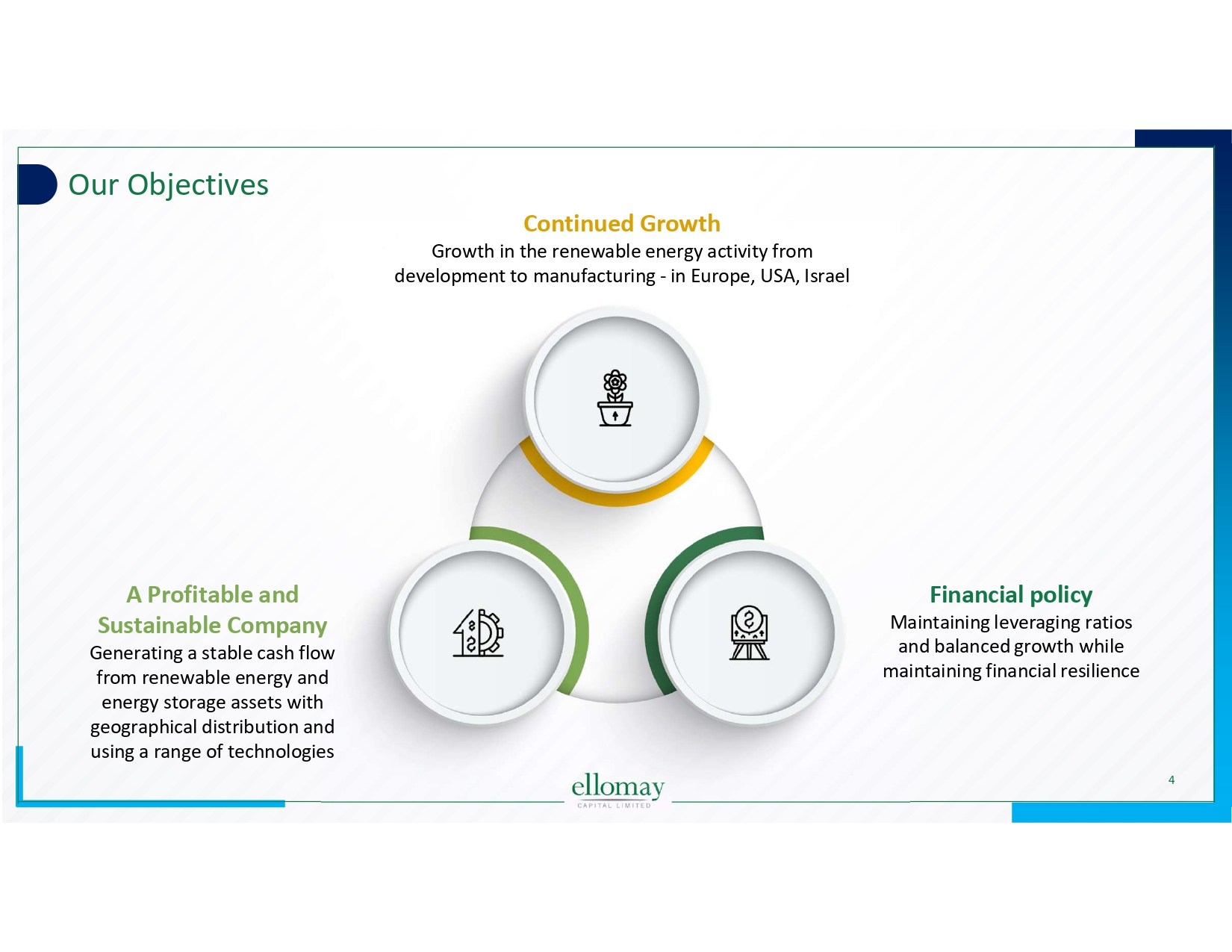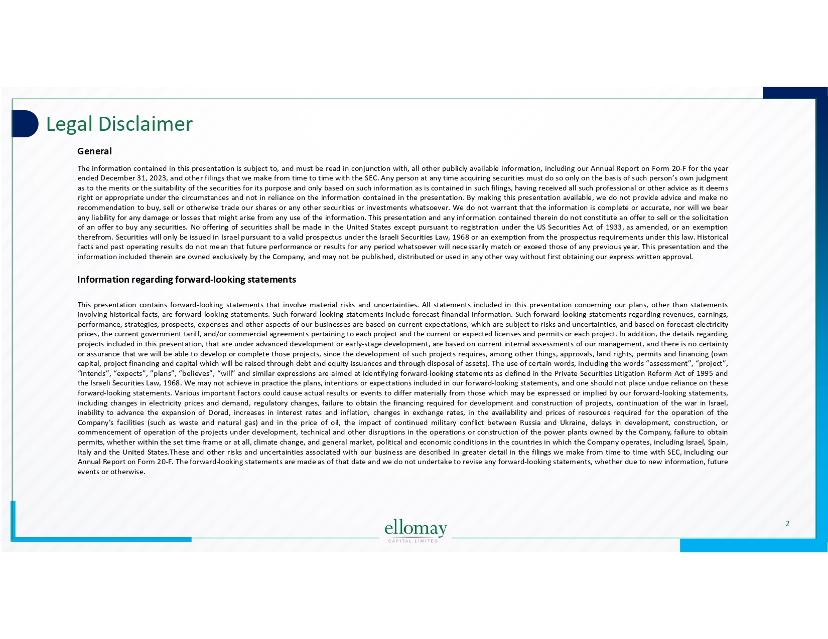 Legal Disclaimer 2 General The information contained in this presentation is subject to, and must be read in conjunction with, all other publicly available information, including our Annual Report on Form 20 - F for the year ended December 31 , 2023 , and other filings that we make from time to time with the SEC . Any person at any time acquiring securities must do so only on the basis of such person’s own judgment as to the merits or the suitability of the securities for its purpose and only based on such information as is contained in such filings, having received all such professional or other advice as it deems right or appropriate under the circumstances and not in reliance on the information contained in the presentation . By making this presentation available, we do not provide advice and make no recommendation to buy, sell or otherwise trade our shares or any other securities or investments whatsoever . We do not warrant that the information is complete or accurate, nor will we bear any liability for any damage or losses that might arise from any use of the information . This presentation and any information contained therein do not constitute an offer to sell or the solicitation of an offer to buy any securities . No offering of securities shall be made in the United States except pursuant to registration under the US Securities Act of 1933 , as amended, or an exemption therefrom . Securities will only be issued in Israel pursuant to a valid prospectus under the Israeli Securities Law, 1968 or an exemption from the prospectus requirements under this law . Historical facts and past operating results do not mean that future performance or results for any period whatsoever will necessarily match or exceed those of any previous year . This presentation and the information included therein are owned exclusively by the Company, and may not be published, distributed or used in any other way without first obtaining our express written approval . Information regarding forward - looking statements This presentation contains forward - looking statements that involve material risks and uncertainties . All statements included in this presentation concerning our plans, other than statements involving historical facts, are forward - looking statements . Such forward - looking statements include forecast financial information . Such forward - looking statements regarding revenues, earnings, performance, strategies, prospects, expenses and other aspects of our businesses are based on current expectations, which are subject to risks and uncertainties, and based on forecast electricity prices, the current government tariff, and/or commercial agreements pertaining to each project and the current or expected licenses and permits or each project . In addition, the details regarding projects included in this presentation, that are under advanced development or early - stage development, are based on current internal assessments of our management, and there is no certainty or assurance that we will be able to develop or complete those projects, since the development of such projects requires, among other things, approvals, land rights, permits and financing (own capital, project financing and capital which will be raised through debt and equity issuances and through disposal of assets) . The use of certain words, including the words “assessment”, “project”, “intends”, “expects”, ”plans”, “believes”, “will” and similar expressions are aimed at identifying forward - looking statements as defined in the Private Securities Litigation Reform Act of 1995 and the Israeli Securities Law, 1968 . We may not achieve in practice the plans, intentions or expectations included in our forward - looking statements, and one should not place undue reliance on these forward - looking statements . Various important factors could cause actual results or events to differ materially from those which may be expressed or implied by our forward - looking statements, including changes in electricity prices and demand, regulatory changes, failure to obtain the financing required for development and construction of projects, continuation of the war in Israel, inability to advance the expansion of Dorad, increases in interest rates and inflation, changes in exchange rates, in the availability and prices of resources required for the operation of the Company’s facilities (such as waste and natural gas) and in the price of oil, the impact of continued military conflict between Russia and Ukraine, delays in development, construction, or commencement of operation of the projects under development, technical and other disruptions in the operations or construction of the power plants owned by the Company, failure to obtain permits, whether within the set time frame or at all, climate change, and general market, political and economic conditions in the countries in which the Company operates, including Israel, Spain, Italy and the United States . These and other risks and uncertainties associated with our business are described in greater detail in the filings we make from time to time with SEC, including our Annual Report on Form 20 - F . The forward - looking statements are made as of that date and we do not undertake to revise any forward - looking statements, whether due to new information, future events or otherwise .