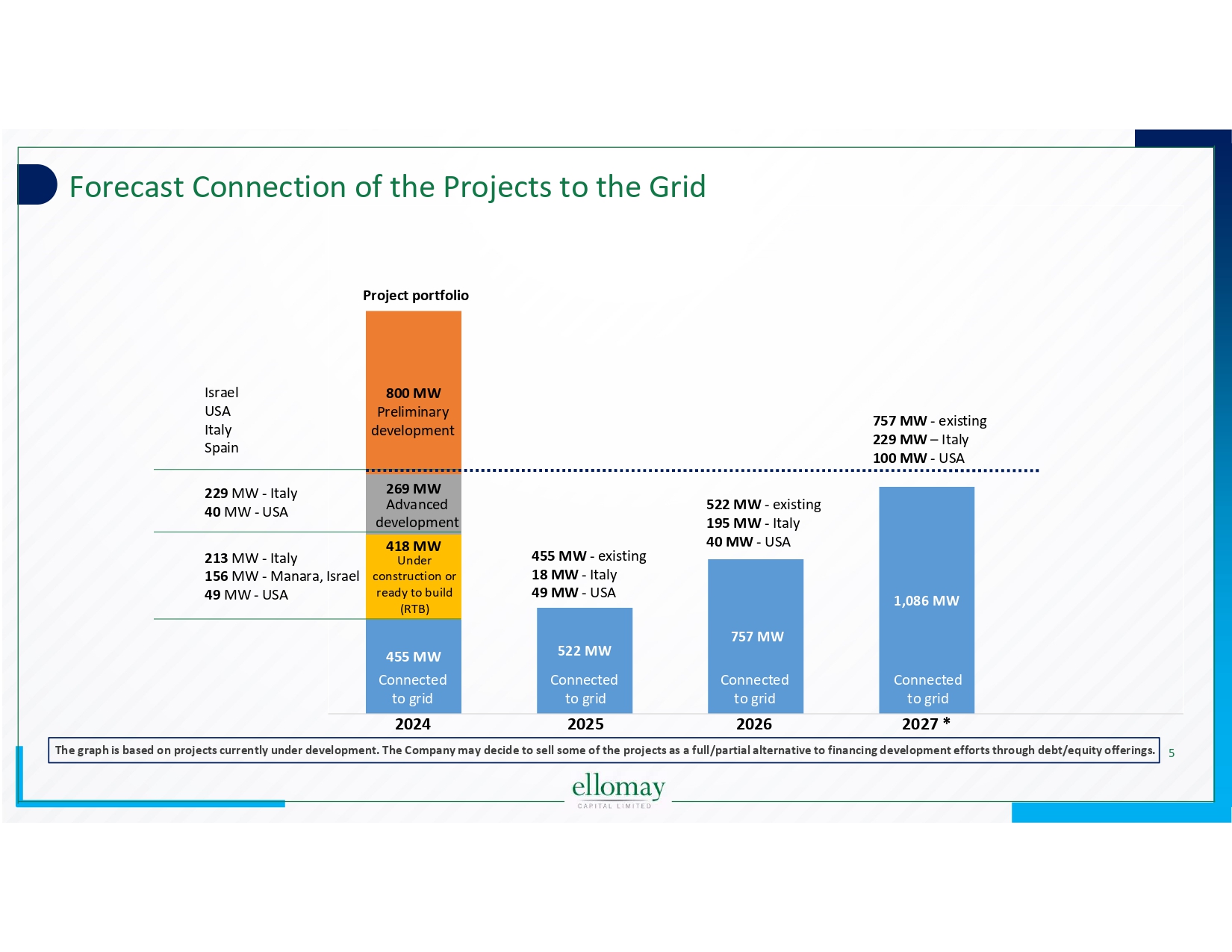 Our Objectives 4 Continued Growth Growth in the renewable energy activity from development to manufacturing - in Europe, USA, Israel A Profitable and Sustainable Company Generating a stable cash flow from renewable energy and energy storage assets with geographical distribution and using a range of technologies Financial policy Maintaining leveraging ratios and balanced growth while maintaining financial resilience