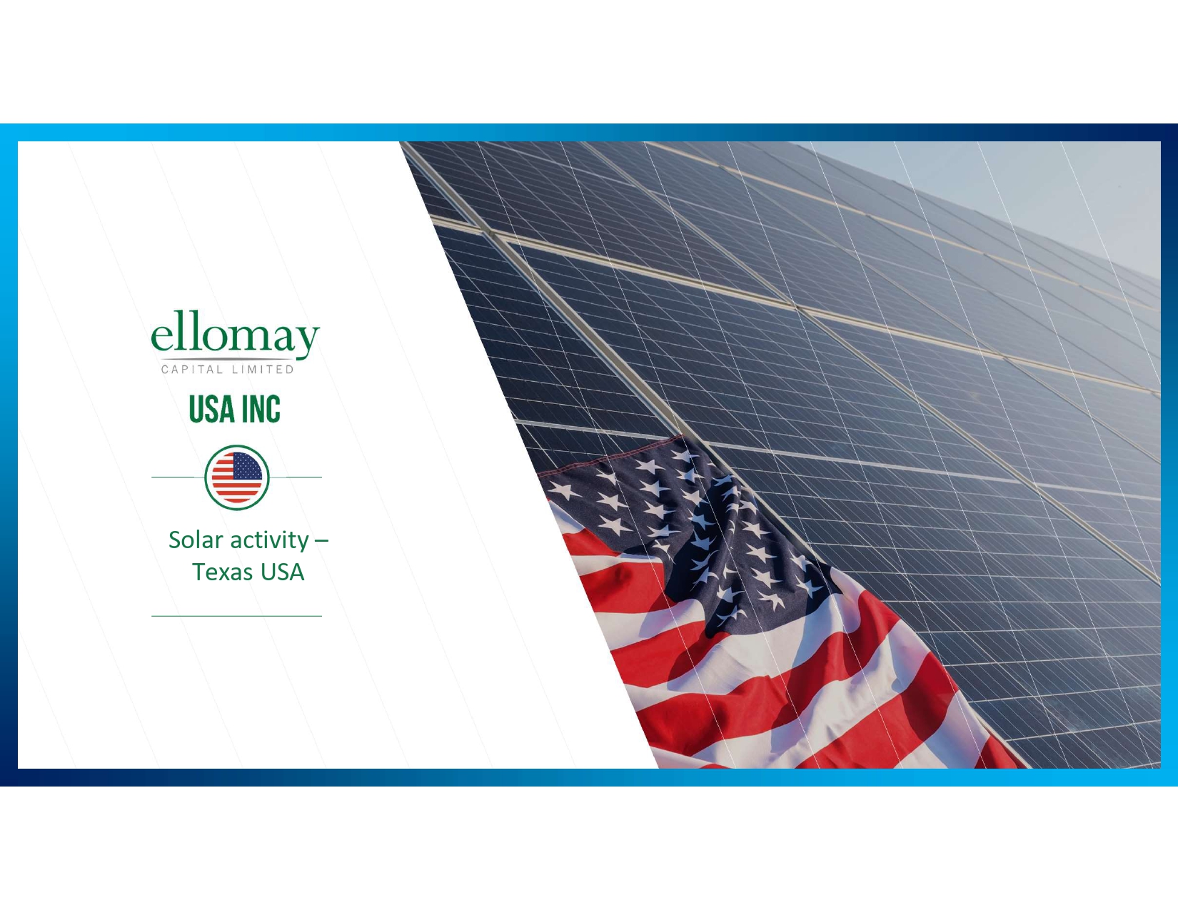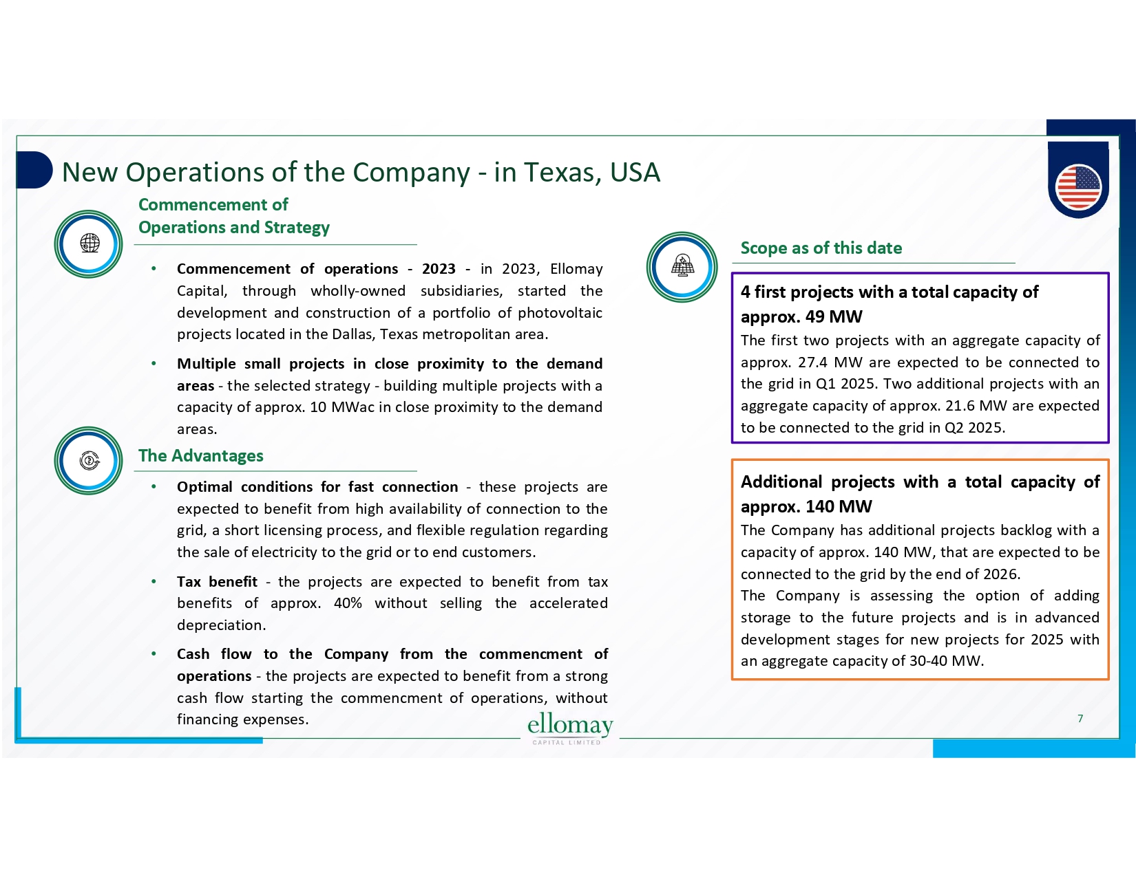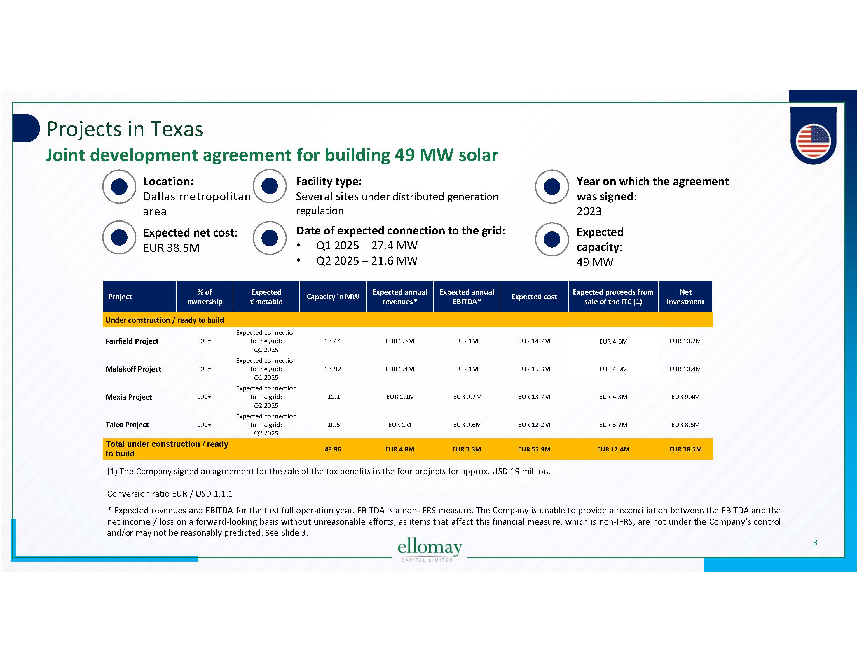 7 New Operations of the Company - in Texas, USA Commencement of Operations and Strategy • Commencement of operations - 2023 - in 2023 , Ellomay Capital, through wholly - owned subsidiaries, started the development and construction of a portfolio of photovoltaic projects located in the Dallas, Texas metropolitan area . • Multiple small projects in close proximity to the demand areas - the selected strategy - building multiple projects with a capacity of approx . 10 MWac in close proximity to the demand areas . The Advantages • Optimal conditions for fast connection - these projects are expected to benefit from high availability of connection to the grid, a short licensing process, and flexible regulation regarding the sale of electricity to the grid or to end customers . • Tax benefit - the projects are expected to benefit from tax benefits of approx . 40 % without selling the accelerated depreciation . • Cash flow to the Company from the commencment of operations - the projects are expected to benefit from a strong cash flow starting the commencment of operations, without financing expenses . Scope as of this date 4 first projects with a total capacity of approx . 49 MW The first two projects with an aggregate capacity of approx . 27 . 4 MW are expected to be connected to the grid in Q 1 2025 . Two additional projects with an aggregate capacity of approx . 21 . 6 MW are expected to be connected to the grid in Q 2 2025 . Additional projects with a total capacity of approx . 140 MW The Company has additional projects backlog with a capacity of approx . 140 MW, that are expected to be connected to the grid by the end of 2026 . The Company is assessing the option of adding storage to the future projects and is in advanced development stages for new projects for 2025 with an aggregate capacity of 30 - 40 MW .