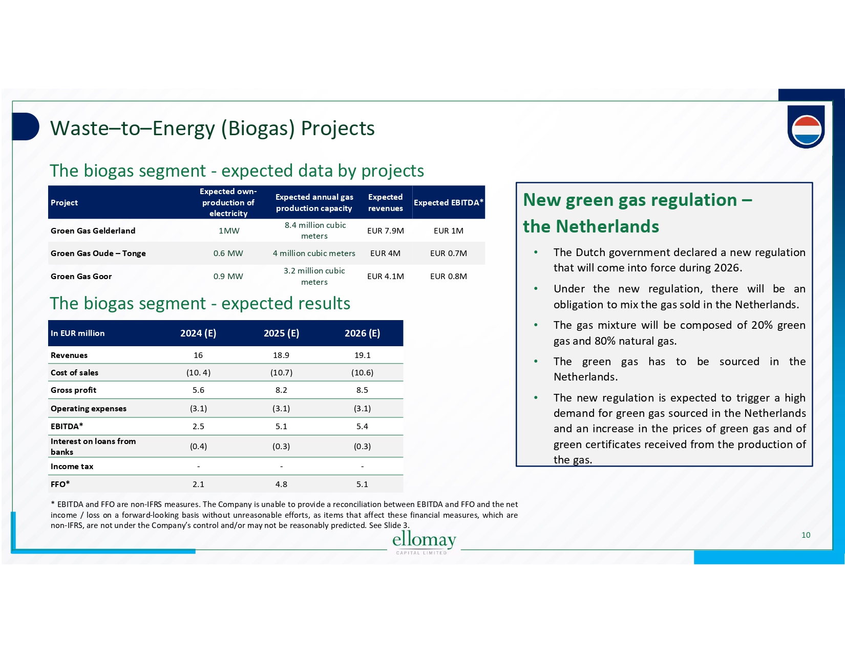 Waste – to – Energy (Biogas) Projects The biogas segment - expected data by projects 2024 Expected annual gas production capacity Expected own - production of electricity Project Expected Expected EBITDA* revenues EUR 7.9M EUR 1M 8.4 million cubic meters Groen Gas Gelderland 1MW Groen Gas Oude – Tonge 0.6 MW 4 million cubic meters EUR 4M EUR 0.7M EUR 4.1M EUR 0.8M 3.2 million cubic meters Groen Gas Goor 0.9 MW The biogas segment - expected results 2026 (E) 2025 (E) 2024 (E) In EUR million 19.1 18.9 16 Revenues (10.6) (10.7) (10. 4) Cost of sales 8.5 8.2 5.6 Gross profit (3.1) (3.1) (3.1) Operating expenses 5.4 5.1 2.5 EBITDA* (0.3) (0.3) (0.4) Interest on loans from banks - - - Income tax 5.1 4.8 2.1 FFO* 10 New green gas regulation – the Netherlands • The Dutch government declared a new regulation that will come into force during 2026 . • Under the new regulation, there will be an obligation to mix the gas sold in the Netherlands . • The gas mixture will be composed of 20 % green gas and 80 % natural gas . • The green gas has to be sourced in the Netherlands . • The new regulation is expected to trigger a high demand for green gas sourced in the Netherlands and an increase in the prices of green gas and of green certificates received from the production of the gas . * EBITDA and FFO are non - IFRS measures . The Company is unable to provide a reconciliation between EBITDA and FFO and the net income / loss on a forward - looking basis without unreasonable efforts, as items that affect these financial measures, which are non - IFRS, are not under the Company’s control and/or may not be reasonably predicted . See Slide 3 .