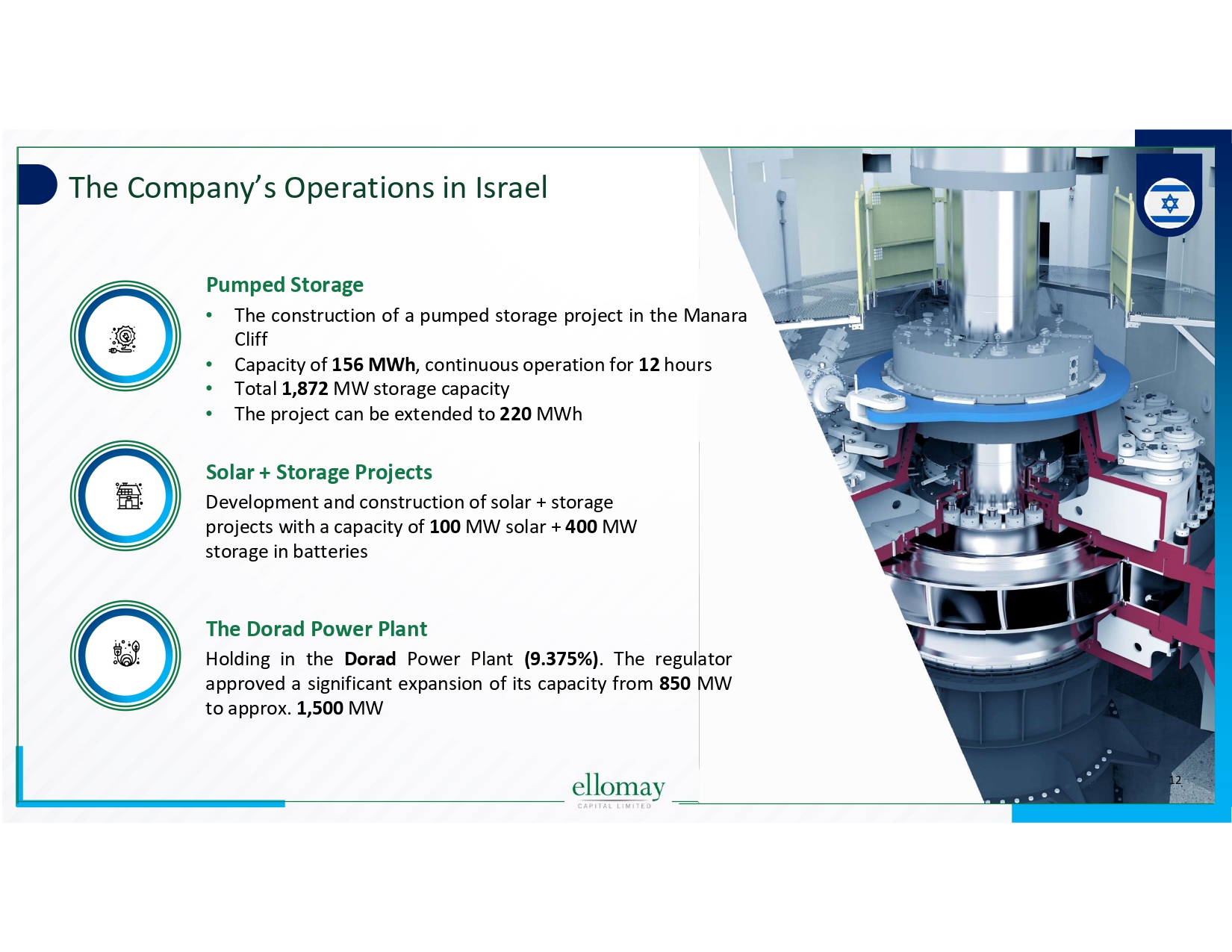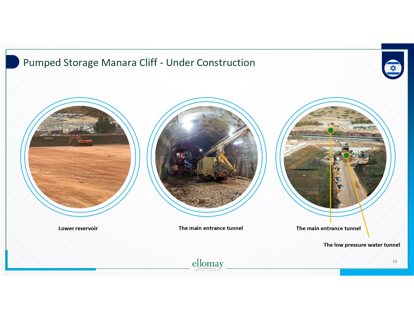 The Company’s Operations in Israel 12 Pumped Storage • The construction of a pumped storage project in the Manara Cliff • Capacity of 156 MWh , continuous operation for 12 hours • Total 1,872 MW storage capacity • The project can be extended to 220 MWh Solar + Storage Projects Development and construction of solar + storage projects with a capacity of 100 MW solar + 400 MW storage in batteries The Dorad Power Plant Holding in the Dorad Power Plant ( 9 . 375 % ) . The regulator approved a significant expansion of its capacity from 850 MW to approx . 1 , 500 MW