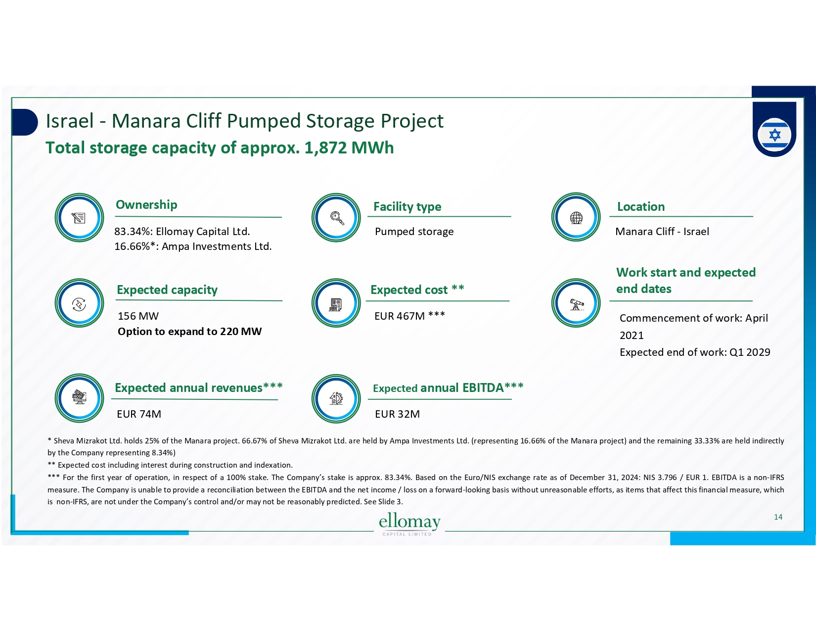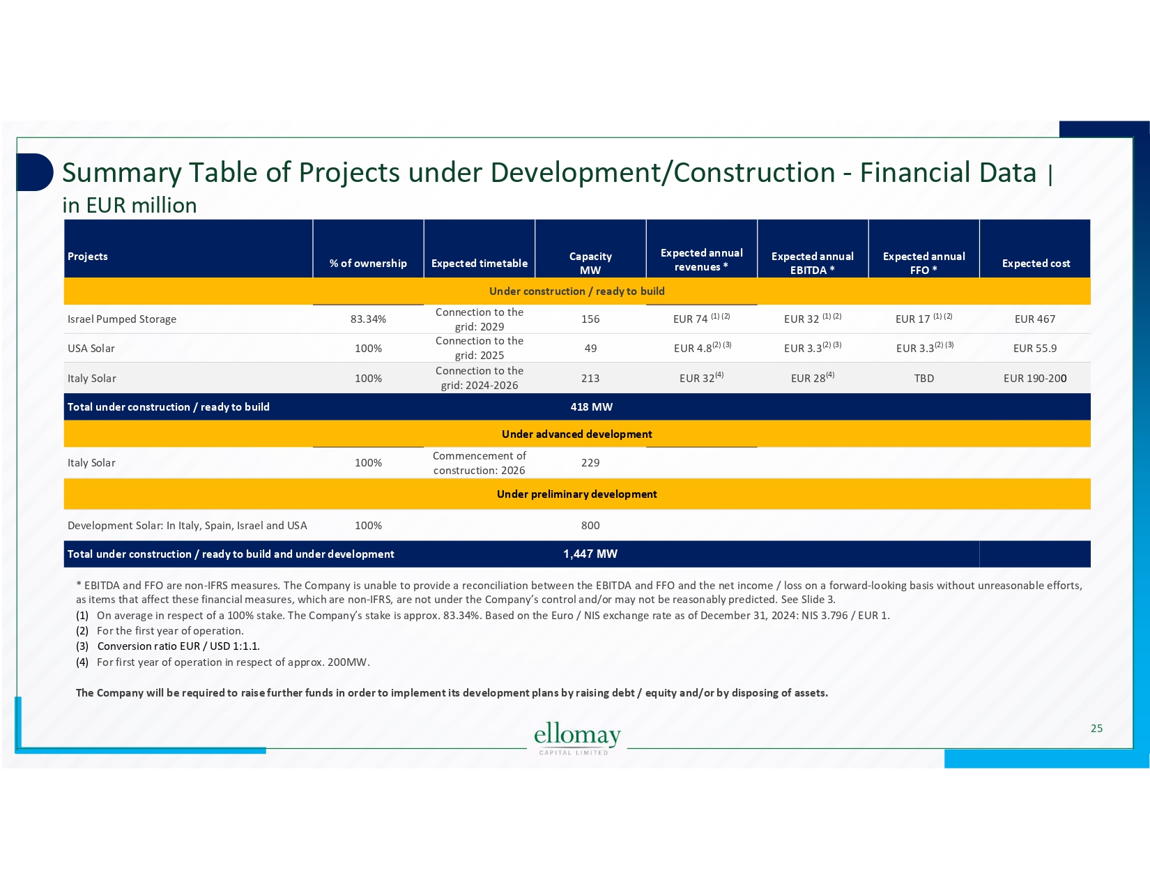 Summary Table of Projects under Development/Construction - Financial Data | in EUR million Expected cost 25 Expected annual FFO * Expected annual EBITDA * Expected annual revenues * Capacity MW % of ownership Expected timetable Projects Under construction / ready to build EUR 467 EUR 17 (1) (2) EUR 32 (1) (2) EUR 74 (1) (2) 156 Connection to the grid: 2029 83.34% Israel Pumped Storage EUR 55.9 EUR 3.3 (2) (3) EUR 3.3 (2) (3) EUR 4.8 (2) (3) 49 Connection to the grid: 2025 100% USA Solar EUR 190 - 20 0 TBD EUR 28 (4) EUR 32 (4) 213 418 MW Connection to the grid: 2024 - 2026 100% Italy Solar Total under construction / ready to build Under advanced development 229 Commencement of construction: 2026 100% Italy Solar Under preliminary development Development Solar: In Italy, Spain, Israel and USA 100% 800 Total under construction / ready to build and under development 1,447 MW * EBITDA and FFO are non - IFRS measures. The Company is unable to provide a reconciliation between the EBITDA and FFO and the net income / loss on a forward - looking basis without unreasonable efforts, as items that affect these financial measures, which are non - IFRS, are not under the Company’s control and/or may not be reasonably predicted. See Slide 3. (1) On average in respect of a 100% stake. The Company’s stake is approx. 83.34%. Based on the Euro / NIS exchange rate as of December 31, 2024: NIS 3.796 / EUR 1. (2) For the first year of operation. (3) Conversion ratio EUR / USD 1:1.1. (4) For first year of operation in respect of approx. 200MW. The Company will be required to raise further funds in order to implement its development plans by raising debt / equity and/or by disposing of assets.