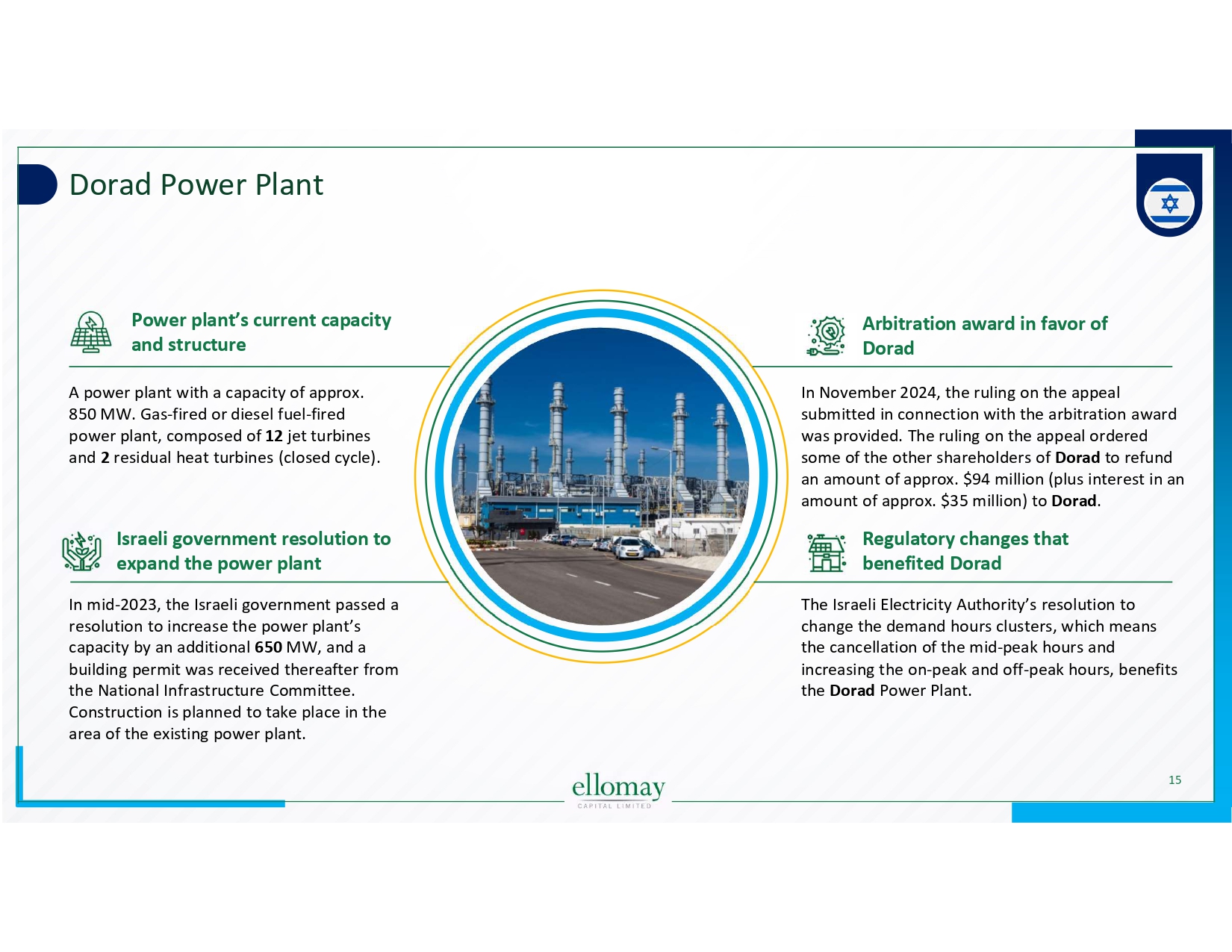 Dorad Power Plant 15 Power plant’s current capacity and structure A power plant with a capacity of approx. 850 MW. Gas - fired or diesel fuel - fired power plant, composed of 12 jet turbines and 2 residual heat turbines (closed cycle). Israeli government resolution to expand the power plant In mid - 2023, the Israeli government passed a resolution to increase the power plant’s capacity by an additional 650 MW, and a building permit was received thereafter from the National Infrastructure Committee. Construction is planned to take place in the area of the existing power plant. Arbitration award in favor of Dorad In November 2024, the ruling on the appeal submitted in connection with the arbitration award was provided. The ruling on the appeal ordered some of the other shareholders of Dorad to refund an amount of approx. $94 million (plus interest in an amount of approx. $35 million) to Dorad . Regulatory changes that benefited Dorad The Israeli Electricity Authority’s resolution to change the demand hours clusters, which means the cancellation of the mid - peak hours and increasing the on - peak and off - peak hours, benefits the Dorad Power Plant.