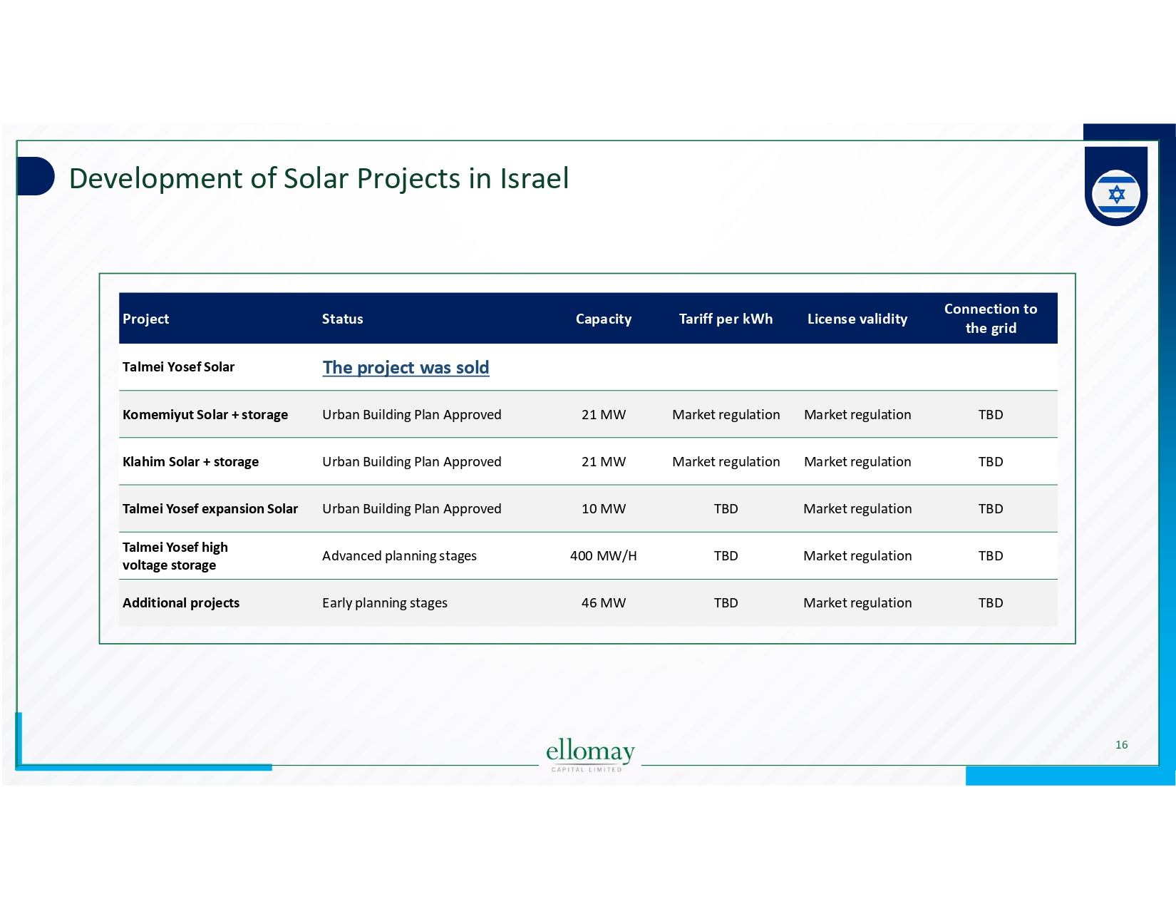 Development of Solar Projects in Israel Connection to the grid License validity Tariff per kWh Capacity Status The project was sold Project Talmei Yosef Solar TBD Market regulation Market regulation 21 MW Urban Building Plan Approved Komemiyut Solar + storage TBD Market regulation Market regulation 21 MW Urban Building Plan Approved Klahim Solar + storage TBD Market regulation TBD 10 MW Urban Building Plan Approved Talmei Yosef expansion Solar TBD Market regulation TBD 400 MW/H Advanced planning stages Talmei Yosef high voltage storage TBD Market regulation TBD 46 MW Early planning stages Additional projects 16