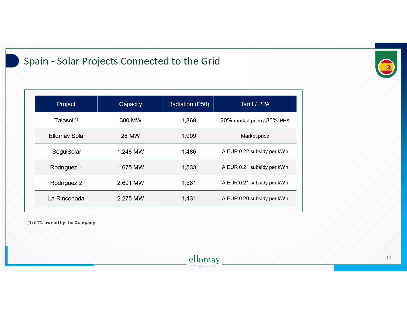 Spain - Solar Projects Connected to the Grid Tariff / PPA Radiation (P50) Capacity Project 20% market price / 80% PPA 1,869 300 MW Talasol )1) Market price 1,909 28 MW Ellomay Solar A EUR 0.22 subsidy per kWh 1,486 1.248 MW SeguiSolar A EUR 0.21 subsidy per kWh 1,533 1.675 MW Rodríguez 1 A EUR 0.21 subsidy per kWh 1,561 2.691 MW Rodríguez 2 A EUR 0.20 subsidy per kWh 1,431 2.275 MW La Rinconada 18 (1) 51% owned by the Company