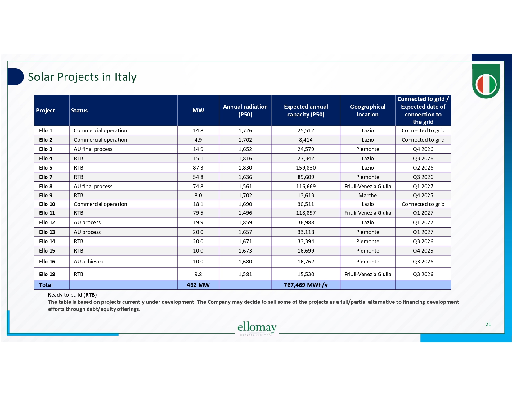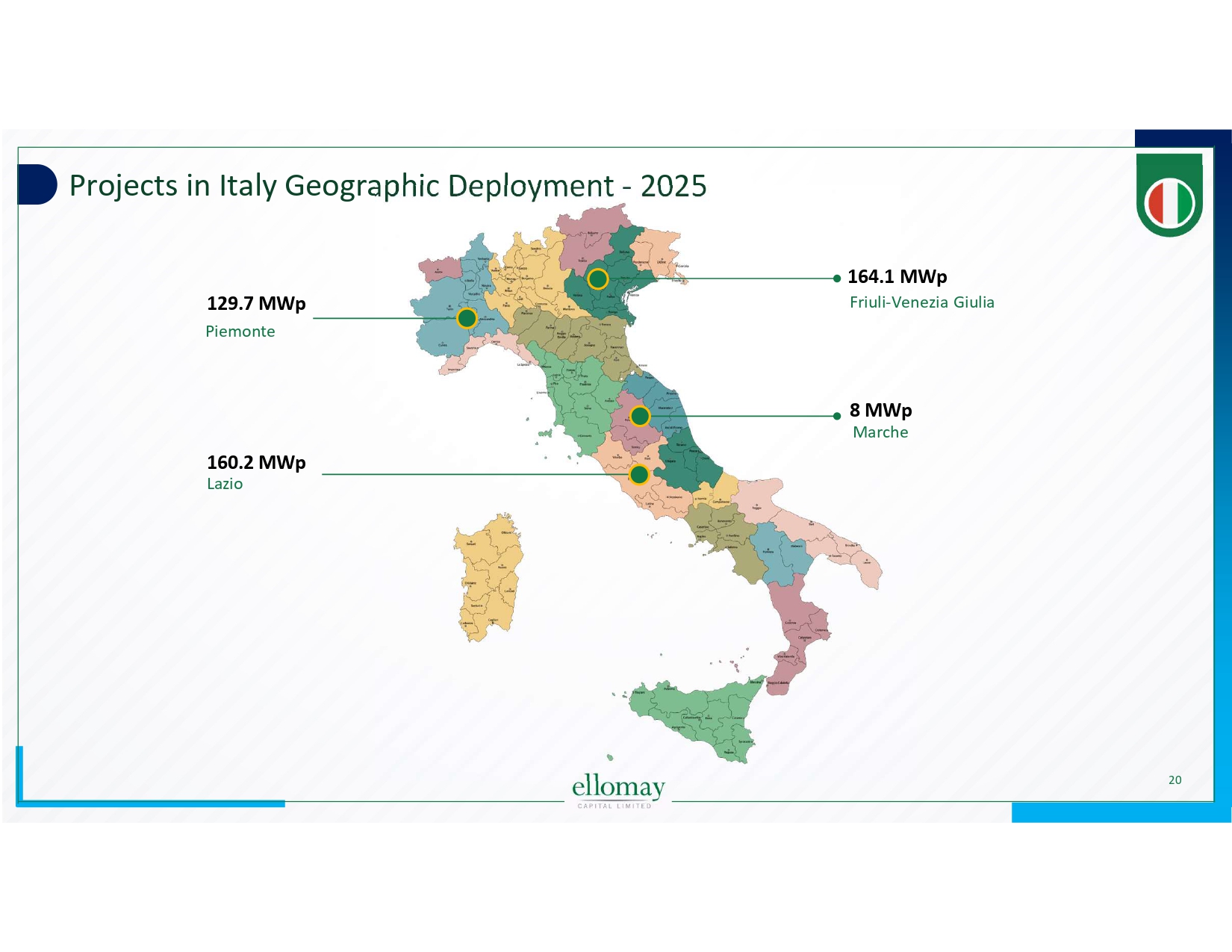 Projects in Italy Geogr aphic Deployment - 2025 164.1 MWp Friuli - Venezia Giulia 20 8 MWp Marche 129.7 MWp Piemonte 160.2 MWp Lazio