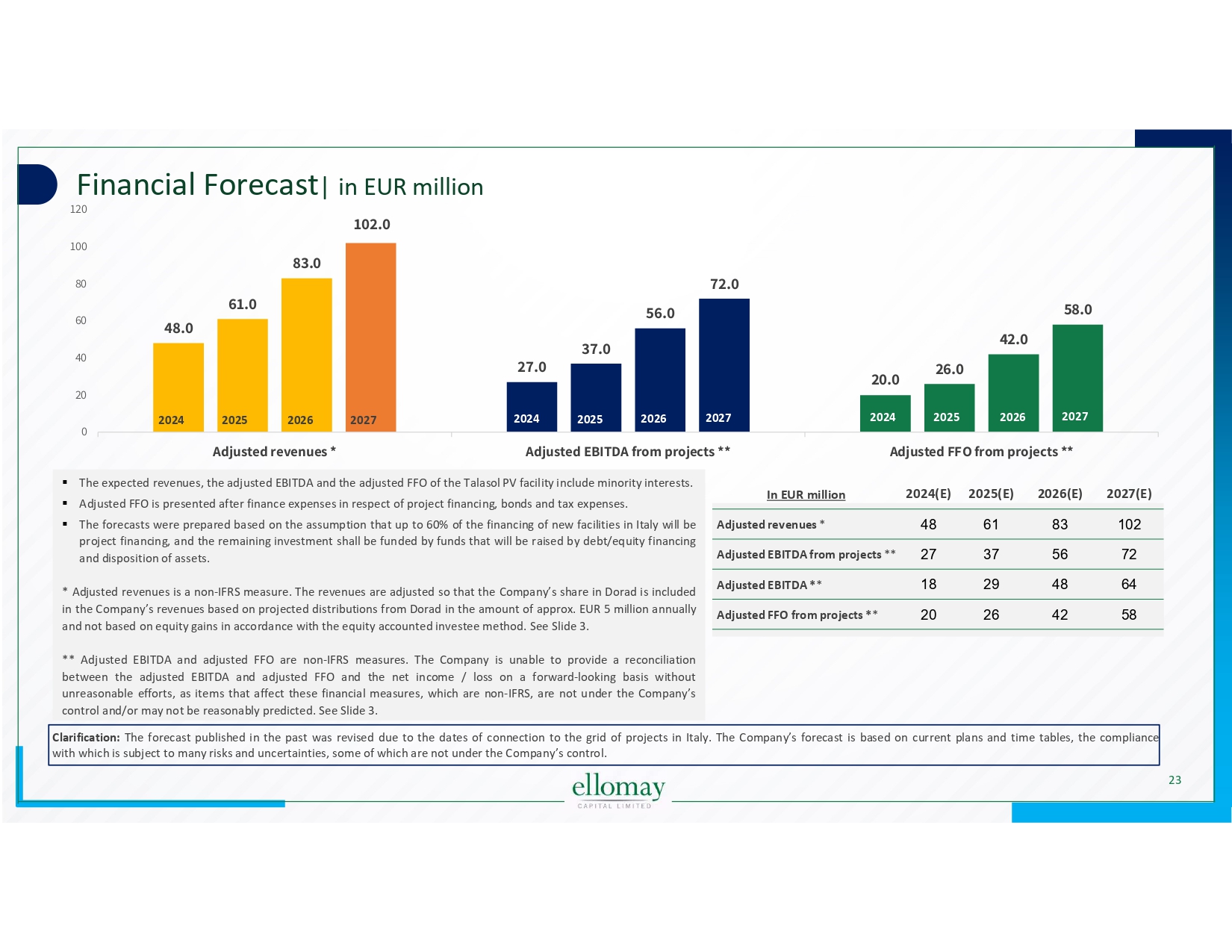 Financial Forecast | in EUR million 48.0 23 27.0 20.0 61.0 37.0 26.0 83.0 56.0 42.0 72.0 58.0 0 20 40 60 80 100 120 102.0 Adjusted revenues * Adjusted EBITDA from projects ** Adjusted FFO from projects ** 2027 2026 2025 2024 2027 2026 2025 2024 2027 2026 2025 2024 Adjusted revenues * 48 61 83 102 Adjusted EBITDA from projects ** 27 37 56 72 Adjusted EBITDA * * 18 29 48 64 Adjusted FFO from projects * * 20 26 42 58 ▪ The expected revenues, the adjusted EBITDA and the adjusted FFO of the Talasol PV facility include minority interests. 2027(E) 2026(E) 2025(E) 2024(E) In EUR million ▪ Adjusted FFO is presented after finance expenses in respect of project financing, bonds and tax expenses. ▪ The forecasts were prepared based on the assumption that up to 60% of the financing of new facilities in Italy will be project financing, and the remaining investment shall be funded by funds that will be raised by debt/equity financing and disposition of assets. * Adjusted revenues is a non - IFRS measure. The revenues are adjusted so that the Company’s share in Dorad is included in the Company’s revenues based on projected distributions from Dorad in the amount of approx. EUR 5 million annually and not based on equity gains in accordance with the equity accounted investee method. See Slide 3. ** Adjusted EBITDA and adjusted FFO are non - IFRS measures. The Company is unable to provide a reconciliation between the adjusted EBITDA and adjusted FFO and the net income / loss on a forward - looking basis without unreasonable efforts, as items that affect these financial measures, which are non - IFRS, are not under the Company’s control and/or may not be reasonably predicted. See Slide 3. Clarification: The forecast published in the past was revised due to the dates of connection to the grid of projects in Italy. The Company’s forecast is based on current plans and time tables, the compliance with which is subject to many risks and uncertainties, some of which are not under the Company’s control.