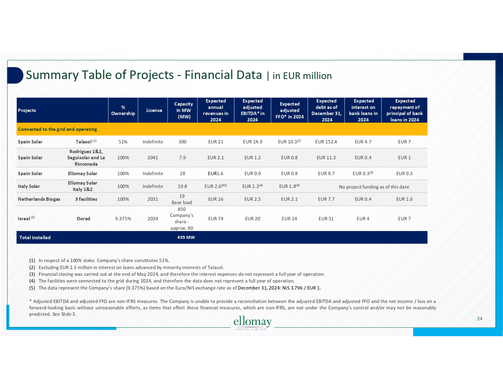 Summary Table of Projects - Financial Data | in EUR million Expected Expected interest on repayment of bank loans in principal of bank 2024 loans in 2024 24 Expected debt as of December 31, 2024 Expected adjusted Expected EBITDA* in adjusted 2024 FFO* in 2024 Expected annual revenues in 2024 Capacity % License In MW Ownership (MW) Projects Connected to the grid and operating EUR 7 EUR 4.7 EUR 152.4 EUR 10.3 (2) EUR 14.9 EUR 21 300 Indefinite Spain Solar Talasol (1) 51% EUR 1 EUR 0.4 EUR 11.3 EUR 0.8 EUR 1.2 EUR 2.1 7.9 2041 Rodríguez 1&2, Spain Solar Seguisolar and La 100% Rinconada EUR 0.3 EUR 0.3 (3) EUR 9.7 EUR 0.8 EUR 0.9 EUR 1.6 28 Indefinite Spain Solar Ellomay Solar 100% EUR 74 EUR 20 EUR 14 EUR 51 EUR 4 EUR 7 850 Company’s share - approx. 80 Israel (5) Dorad 9.375% 2034 Total installed 455 MW (1) In respect of a 100% stake. Company’s share constitutes 51%. (2) Excluding EUR 2.3 million in interest on loans advanced by minority interests of Talasol. (3) Financial closing was carried out at the end of May 2024, and therefore the interest expenses do not represent a full year of operation. (4) The facilities were connected to the grid during 2024, and therefore the data does not represent a full year of operation. (5) The data represent the Company’s share (9.375%) based on the Euro/NIS exchange rate as of December 31, 2024: NIS 3.796 / EUR 1. * Adjusted EBITDA and adjusted FFO are non - IFRS measures . The Company is unable to provide a reconciliation between the adjusted EBITDA and adjusted FFO and the net income / loss on a forward - looking basis without unreasonable efforts, as items that affect these financial measures, which are non - IFRS, are not under the Company’s control and/or may not be reasonably predicted . See Slide 3 . No project funding as of this date EUR 1.8 (4) EUR 2.2 (4) EUR 2.6 (45) 19.8 Indefinite 100% Ellomay Solar Italy 1&2 Italy Solar EUR 1.6 EUR 0.4 EUR 7.7 EUR 2.1 EUR 2.5 EUR 16 19 Base load 2031 100% 3 facilities Netherlands Biogas