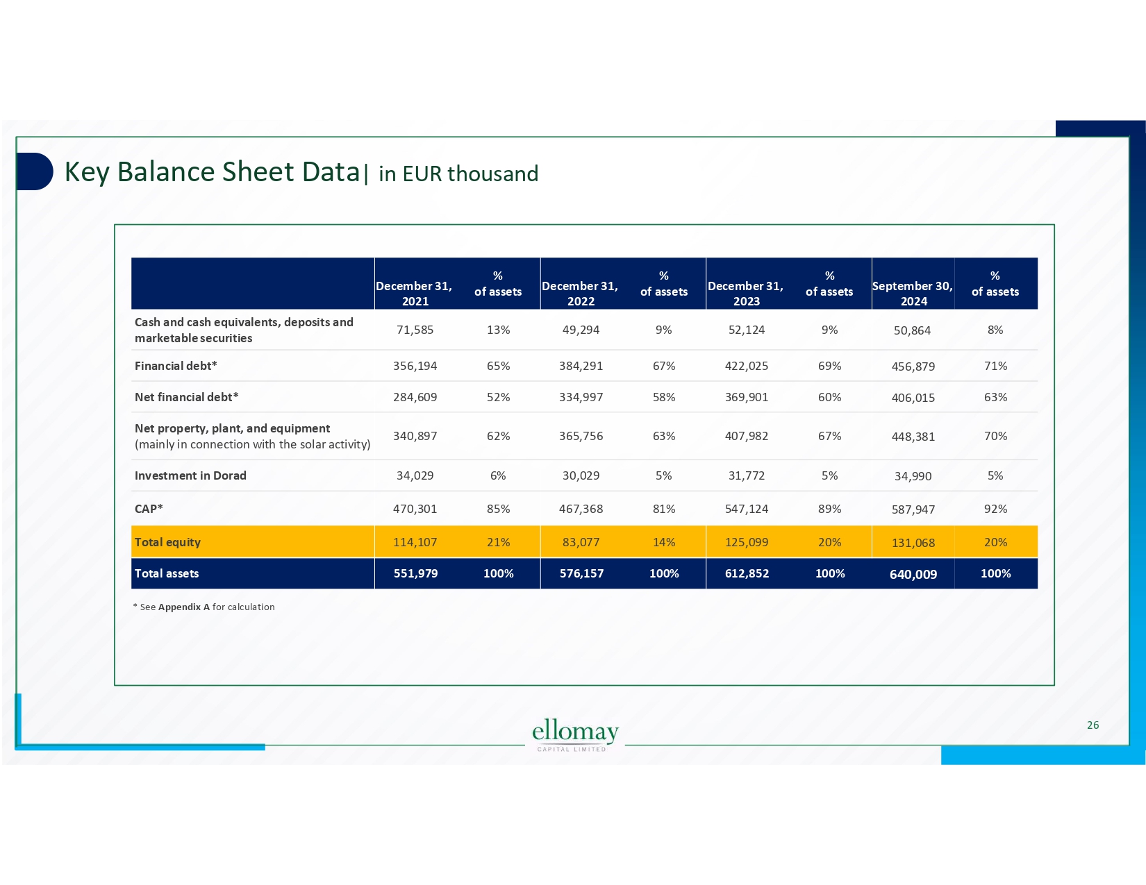 Key Balance Sheet Data | in EUR thousand 26 % of assets September 30, 2024 % of assets December 31, 2023 % of assets December 31, 2022 % of assets December 31, 2021 8% 50,864 9% 52,124 9% 49,294 13% 71,585 Cash and cash equivalents, deposits and marketable securities 71% 456,879 69% 422,025 67% 384,291 65% 356,194 Financial debt* 63% 406,015 60% 369,901 58% 334,997 52% 284,609 Net financial debt* 70% 448,381 67% 407,982 63% 365,756 62% 340,897 Net property, plant, and equipment (mainly in connection with the solar activity) 5% 34,990 5% 31,772 5% 30,029 6% 34,029 Investment in Dorad 92% 587,947 89% 547,124 81% 467,368 85% 470,301 CAP* 20% 131,068 20% 125,099 14% 83,077 21% 114,107 Total equity 100% 640,009 100% 612,852 100% 576,157 100% 551,979 Total assets * See Appendix A for calculation