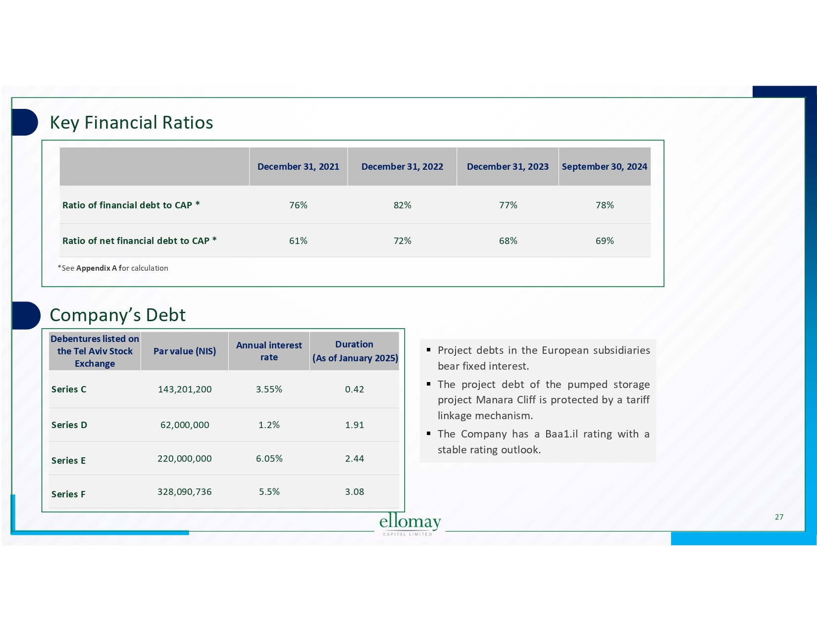 Key Financial Ratios September 30, 2024 December 31, 2023 December 31, 2022 December 31, 2021 78% 77% 82% 76% Ratio of financial debt to CAP * 69% 68% 72% 61% Ratio of net financial debt to CAP * *See Appendix A f or calculation Company’s Debt Duration (As of January 2025) 0.42 Annual interest rate 3.55% Par value (NIS) 143,201,200 Debentures listed on the Tel Aviv Stock Exchange Series C 1.91 1.2% 62,000,000 Series D 2.44 6.05% 220,000,000 Series E 3.08 5.5% 328,090,736 Series F 27 ▪ Project debts in the European subsidiaries bear fixed interest . ▪ The project debt of the pumped storage project Manara Cliff is protected by a tariff linkage mechanism . ▪ The Company has a Baa 1 . il rating with a stable rating outlook .