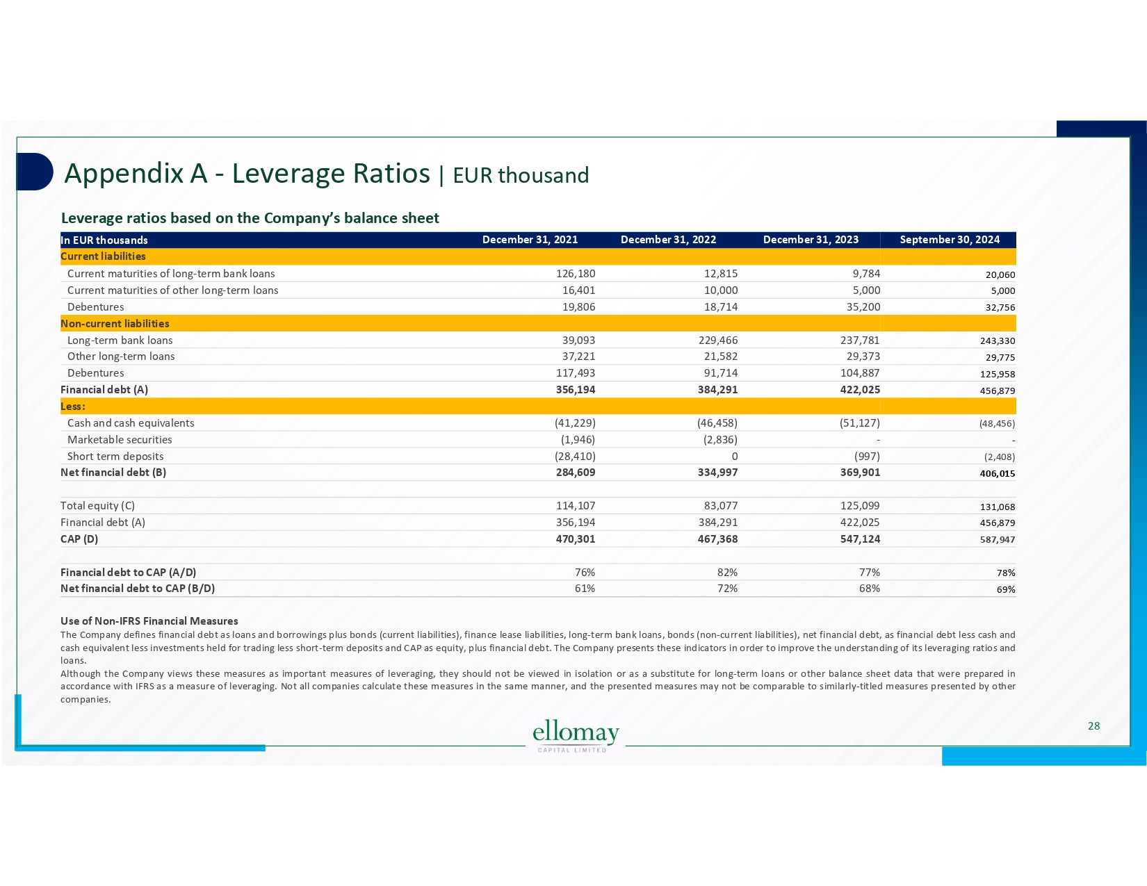 Appendix A - Leverage Ratios | EUR thousand 28 Leverage ratios based on the Company’s balance sheet September 30, 2024 December 31, 2023 December 31, 2022 December 31, 2021 In EUR thousands 20,060 9,784 12,815 126,180 Current liabilities Current maturities of long - term bank loans 5,000 5,000 10,000 16,401 Current maturities of other long - term loans 32,756 35,200 18,714 19,806 Debentures Non - current liabilities 243,330 237,781 229,466 39,093 Long - term bank loans 29,775 29,373 21,582 37,221 Other long - term loans 125,958 104,887 91,714 117,493 Debentures 456,879 422,025 384,291 356,194 Financial debt (A) Less: (48,456) (51,127) (46,458) (41,229) Cash and cash equivalents - - (2,836) (1,946) Marketable securities (2,408) (997) 0 (28,410) Short term deposits 406,015 369,901 334,997 284,609 Net financial debt (B) 131,068 125,099 83,077 114,107 Total equity (C) 456,879 422,025 384,291 356,194 Financial debt (A) 587,947 547,124 467,368 470,301 CAP (D) 78% 77% 82% 76% Financial debt to CAP (A/D) 69% 68% 72% 61% Net financial debt to CAP (B/D) Use of Non - IFRS Financial Measures The Company defines financial debt as loans and borrowings plus bonds (current liabilities), finance lease liabilities, long - term bank loans, bonds (non - current liabilities), net financial debt, as financial debt less cash and cash equivalent less investments held for trading less short - term deposits and CAP as equity, plus financial debt . The Company presents these indicators in order to improve the understanding of its leveraging ratios and loans . Although the Company views these measures as important measures of leveraging, they should not be viewed in isolation or as a substitute for long - term loans or other balance sheet data that were prepared in accordance with IFRS as a measure of leveraging. Not all companies calculate these measures in the same manner, and the presented measures may not be comparable to similarly - titled measures presented by other companies.