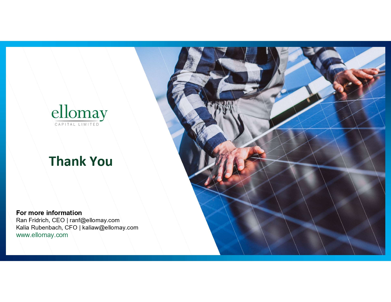 Thank You For more information Ran Fridrich, CEO | ranf@ellomay.com Kalia Rubenbach, CFO | kaliaw@ellomay.com www.ellomay.com