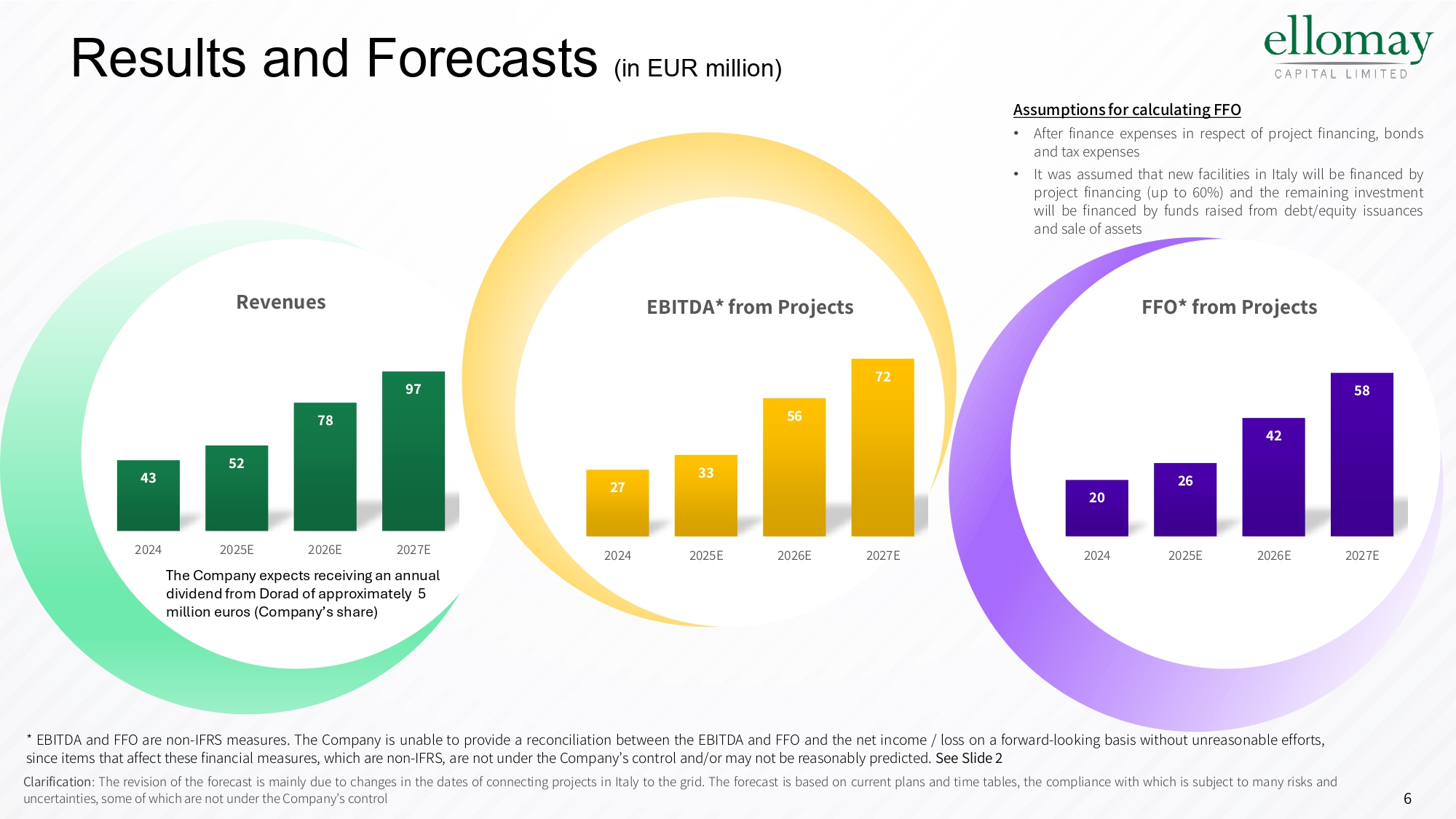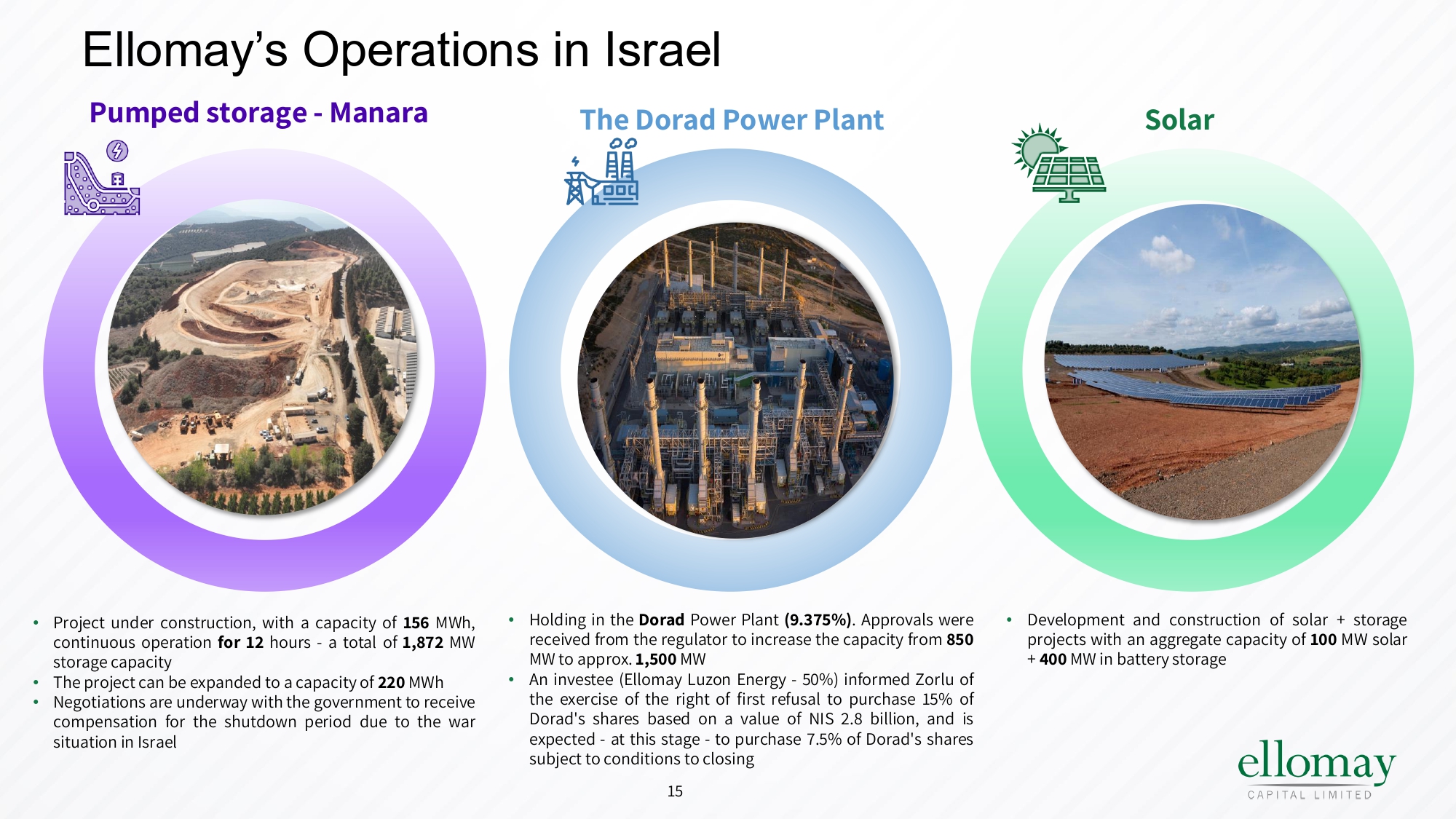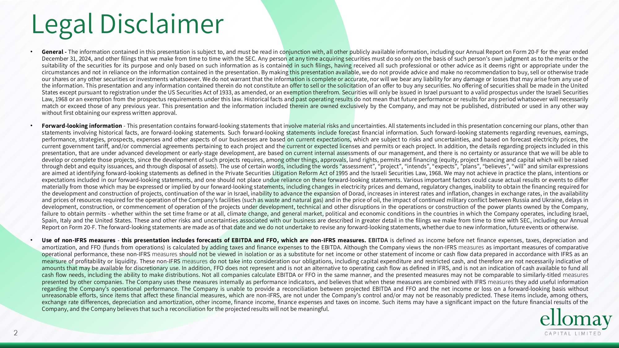 Legal Disclaimer • General - The information contained in this presentation is subject to, and must be read in conjunction with, all other publicly available information, including our Annual Report on Form 20 - F for the year ended December 31 , 2024 , and other filings that we make from time to time with the SEC . Any person at any time acquiring securities must do so only on the basis of such person’s own judgment as to the merits o r the suitability of the securities for its purpose and only based on such information as is contained in such filings, having received all such professional or other advice as it deems right or appropriate under the circumstances and not in reliance on the information contained in the presentation . By making this presentation available, we do not provide advice and make no recommendation to buy, sell or otherwise trade our shares o r any other securities o r investments whatsoever . We do not warrant that the information is complete o r accurate, nor will we bear any liability for any damage o r losses that may arise from any use of the information . This presentation and any information contained therein do not constitute an offer to sell or the solicitation of an offer to buy any securities . N o offering of securities shall be made in the United States except pursuant to registration under the US Securities Act of 1933 , as amended, o r an exemption therefrom . Securities will only be issued in Israel pursuant to a valid prospectus under the Israeli Securities Law, 1968 or an exemption from the prospectus requirements under this law . Historical facts and past operating results do not mean that future performance or results for any period whatsoever will necessarily match o r exceed those of any previous year . This presentation and the information included therein are owned exclusively by the Company, and may not be published, distributed or used in any other way without first obtaining our express written approval . • Forward - looking information - This presentation contains forward - looking statements that involve material risks and uncertainties . All statements included in this presentation concerning our plans, other than statements involving historical facts, are forward - looking statements . Such forward - looking statements include forecast financial information . Such forward - looking statements regarding revenues, earnings, performance, strategies, prospects, expenses and other aspects of our businesses are based on current expectations, which are subject to risks and uncertainties, and based on forecast electricity prices, the current government tariff, and/or commercial agreements pertaining to each project and the current or expected licenses and permits o r each project . In addition, the details regarding projects included in this presentation, that are under advanced development o r early - stage development, are based on current internal assessments of our management, and there i s no certainty o r assurance that we will be able to develop o r complete those projects, since the development of such projects requires, among other things, approvals, land rights, permits and financing (equity, project financing and capital which will be raised through debt and equity issuances, and through disposal of assets) . The use of certain words, including the words “assessment”, “project”, “intends”, “expects”, ”plans”, “believes”, “will” and similar expressions are aimed at identifying forward - looking statements as defined in the Private Securities Litigation Reform Act of 1995 and the Israeli Securities Law, 1968 . We may not achieve in practice the plans, intentions or expectations included in our forward - looking statements, and one should not place undue reliance on these forward - looking statements . Various important factors could cause actual results o r events to differ materially from those which may be expressed o r implied by our forward - looking statements, including changes in electricity prices and demand, regulatory changes, inability to obtain the financing required for the development and construction of projects, continuation of the war in Israel, inability to advance the expansion of Dorad, increases in interest rates and inflation, changes in exchange rates, in the availability and prices of resources required for the operation of the Company’s facilities (such as waste and natural gas) and in the price of oil, the impact of continued military conflict between Russia and Ukraine, delays in development, construction, or commencement of operation of the projects under development, technical and other disruptions in the operations or construction of the power plants owned by the Company, failure to obtain permits - whether within the set time frame or at all, climate change, and general market, political and economic conditions in the countries in which the Company operates, including Israel, Spain, Italy and the United States . These and other risks and uncertainties associated with our business are described in greater detail in the filings we make from time to time with SEC, including our Annual Report on Form 20 - F . The forward - looking statements are made as of that date and we do not undertake to revise any forward - looking statements, whether due to new information, future events or otherwise . • Use of non - IFRS measures - this presentation includes forecasts of EBITDA and FFO, which are non - IFRS measures . EBITDA is defined as income before net finance expenses, taxes, depreciation and amortization, and FFO (funds from operations) is calculated by adding taxes and finance expenses to the EBITDA . Although the Company views the non - IFRS measures as important measures of comparative operational performance, these non - IFRS measures should not be viewed in isolation or as a substitute for net income or other statement of income or cash flow data prepared in accordanc