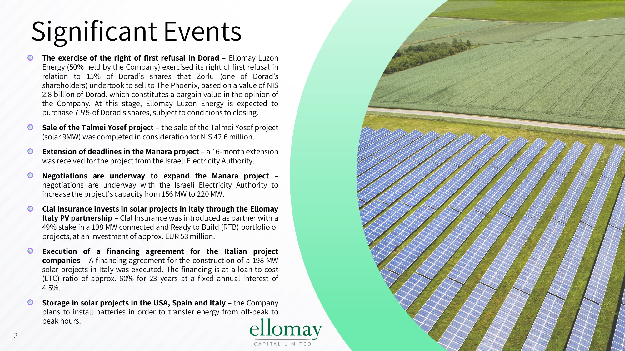 Significant Events The exercise of the right of first refusal in Dorad – Ellomay Luzon Energy ( 50 % held by the Company) exercised its right of first refusal in relation to 15 % of Dorad’s shares that Zorlu (one of Dorad’s shareholders) undertook to sell to The Phoenix, based on a value of NIS 2 . 8 billion of Dorad, which constitutes a bargain value in the opinion of the Company . At this stage, Ellomay Luzon Energy is expected to purchase 7 . 5 % of Dorad's shares, subject to conditions to closing . Sale of the Talmei Yosef project – the sale of the Talmei Yosef project (solar 9 MW) was completed in consideration for NIS 42 . 6 million . Extension of deadlines in the Manara project – a 16 - month extension was received for the project from the Israeli Electricity Authority . Negotiations are underway to expand the Manara project – negotiations are underway with the Israeli Electricity Authority to increase the project’s capacity from 156 MW to 220 MW . Clal Insurance invests in solar projects in Italy through the Ellomay Italy PV partnership – Clal Insurance was introduced as partner with a 49 % stake in a 198 MW connected and Ready to Build (RTB) portfolio of projects, at an investment of approx . EUR 53 million . Execution of a financing agreement for the Italian project companies – A financing agreement for the construction of a 198 MW solar projects in Italy was executed . The financing is at a loan to cost (LTC) ratio of approx . 60 % for 23 years at a fixed annual interest of 4 . 5 % . Storage in solar projects in the USA, Spain and Italy – the Company plans to install batteries in order to transfer energy from off - peak to peak hours . 3