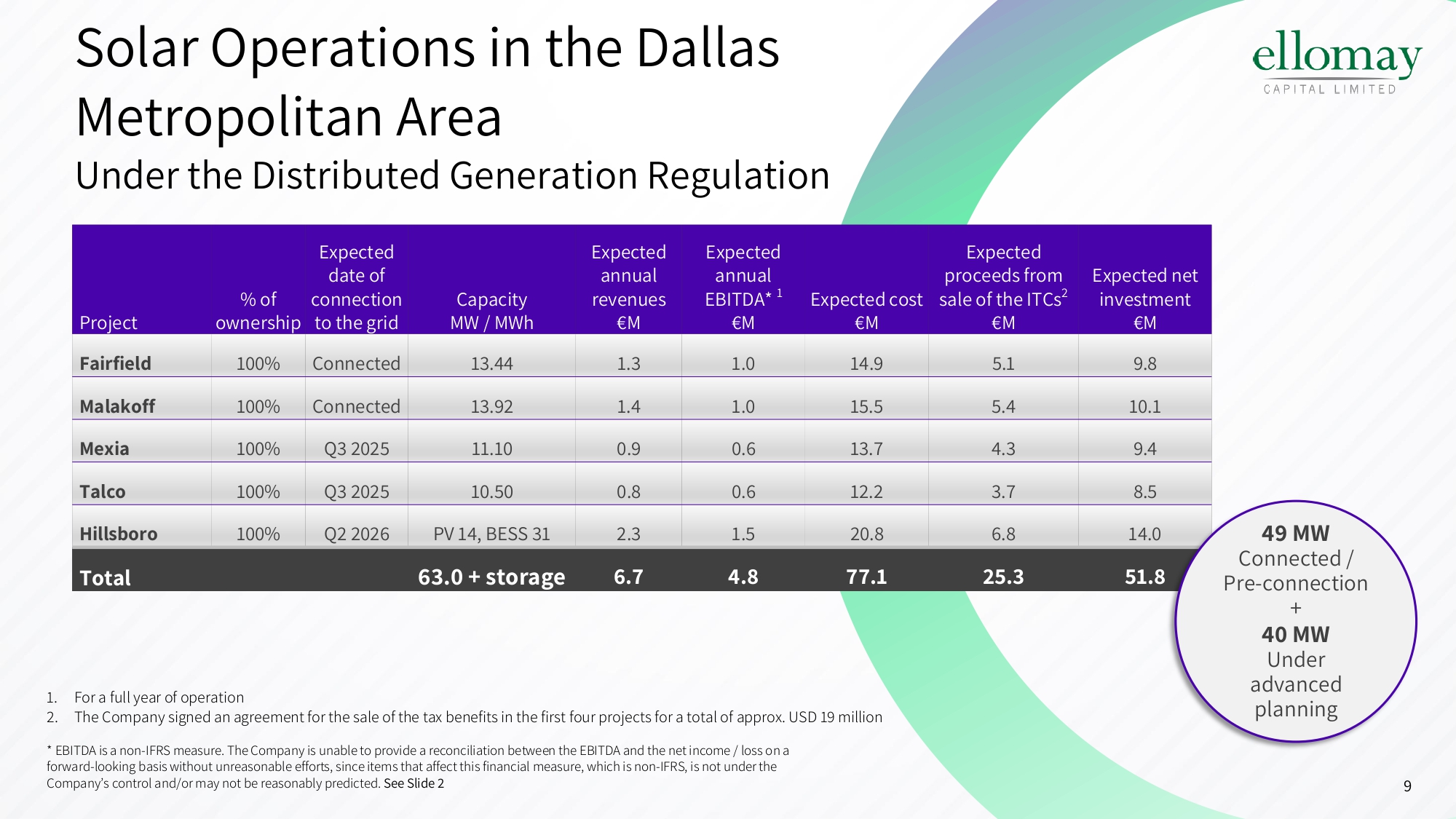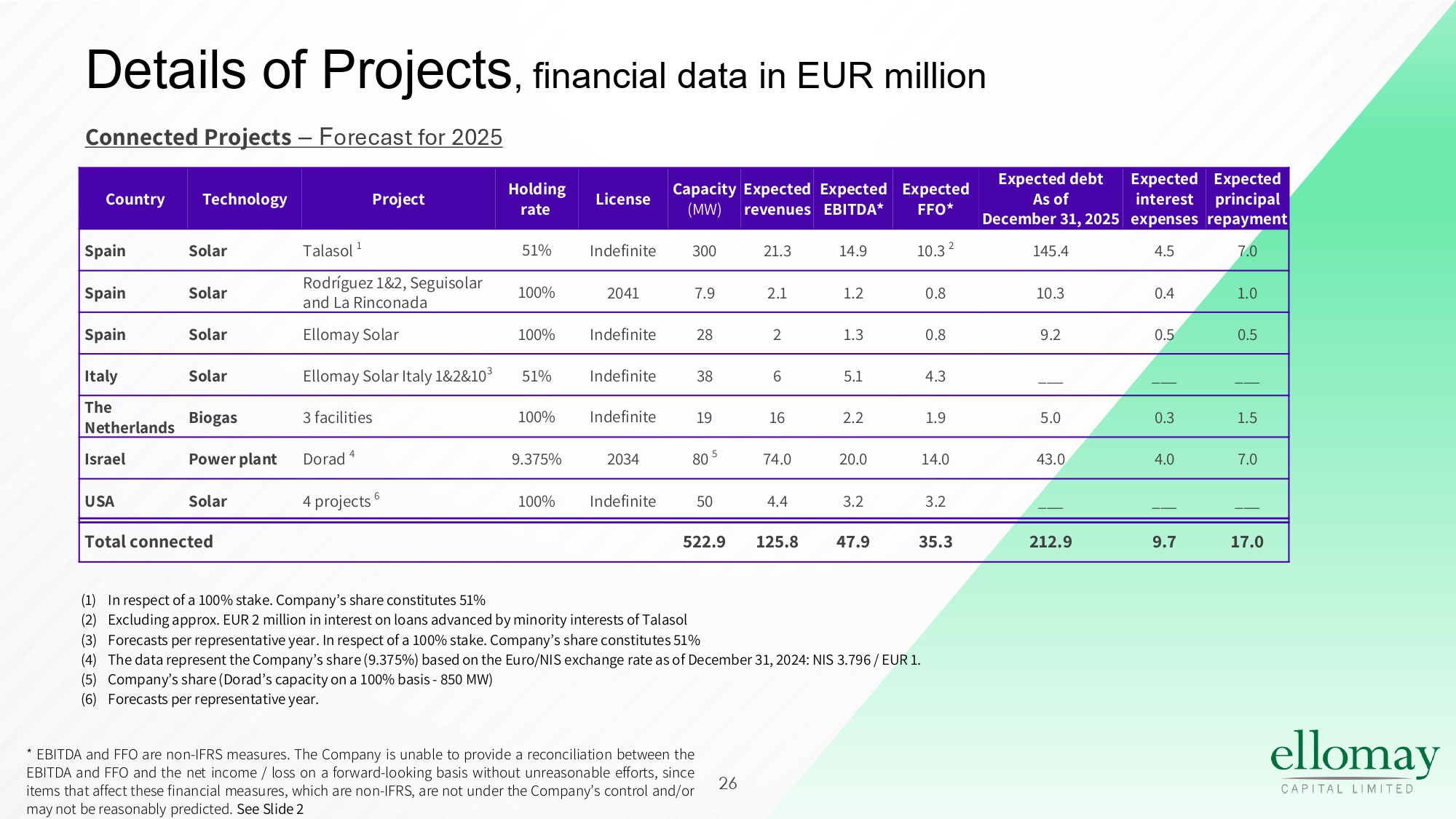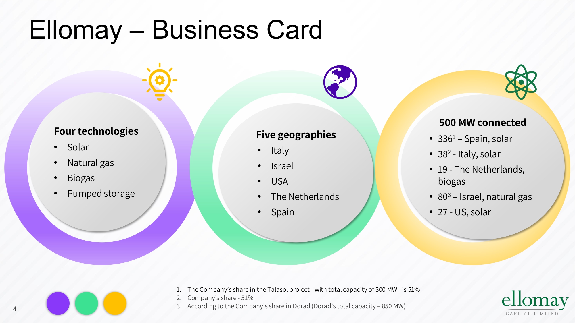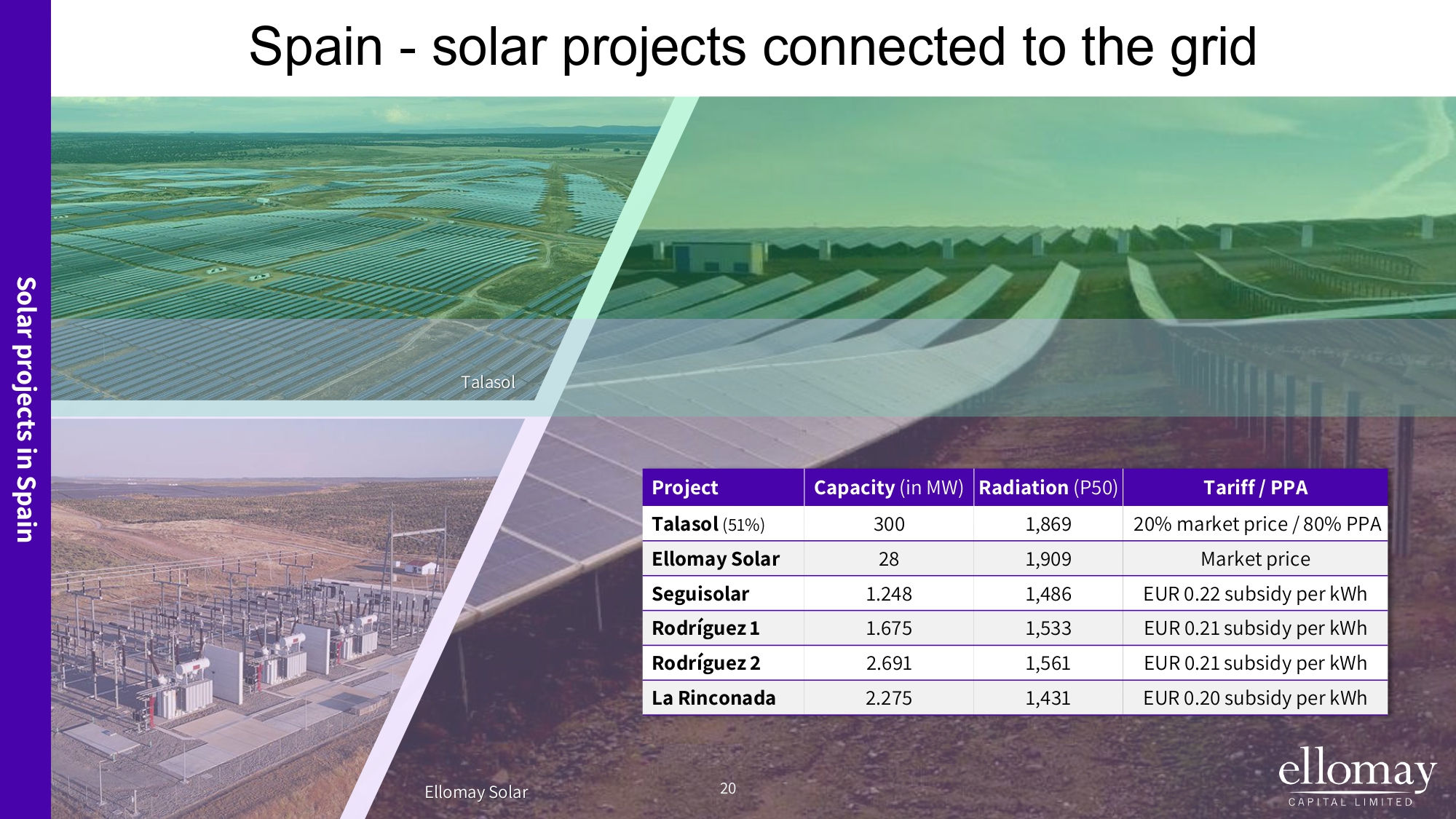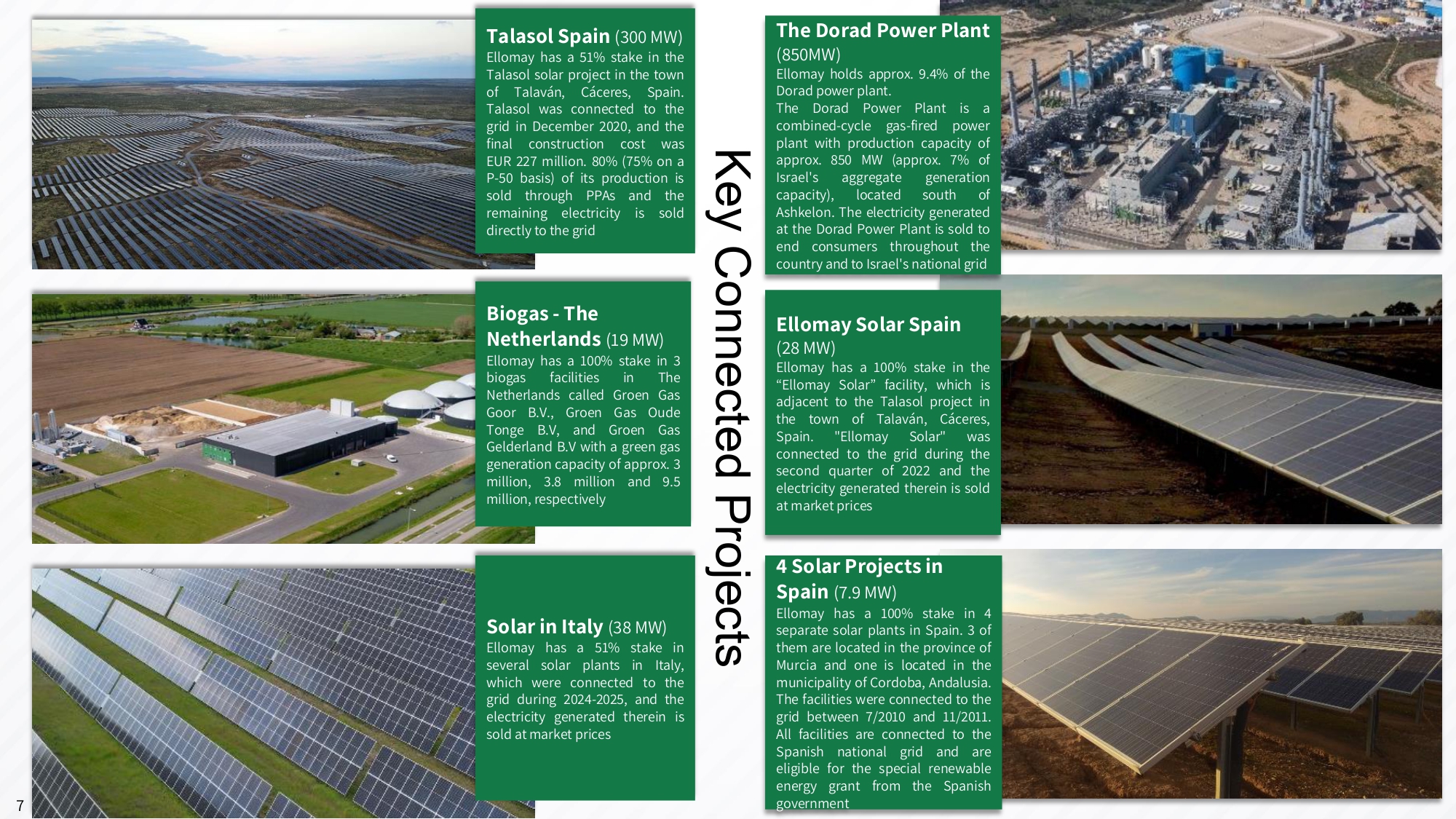 7 Key Connected Projects Talasol Spain ( 300 MW) Ellomay has a 51 % stake in the Talasol solar project in the town of Talaván, Cáceres, Spain . Talasol was connected to the grid in December 2020 , and the final construction cost was EUR 227 million . 80 % ( 75 % on a P - 50 basis) of its production is sold through PPAs and the remaining electricity is sold directly to the grid Biogas - The Netherlands ( 19 MW) Ellomay has a 100 % stake in 3 biogas facilities in The Netherlands called Groen Gas Goor B . V . , Groen Gas Oude Tonge B . V, and Groen Gas Gelderland B . V with a green gas generation capacity of approx . 3 million, 3 . 8 million and 9 . 5 million, respectively Solar in Italy ( 38 MW) Ellomay has a 51 % stake in several solar plants in Italy, which were connected to the grid during 2024 - 2025 , and the electricity generated therein is sold at market prices The Dorad Power Plant ( 850 MW) Ellomay holds approx . 9 . 4 % of the Dorad power plant . The Dorad Power Plant is a combined - cycle gas - fired power plant with production capacity of approx . 850 MW (approx . 7 % of Israel's aggregate generation capacity), located south of Ashkelon . The electricity generated at the Dorad Power Plant is sold to end consumers throughout the country and to Israel's national grid Ellomay Solar Spain (28 MW) Ellomay has a 100 % stake in the “Ellomay Solar” facility, which is adjacent to the Talasol project in the town of Talaván, Cáceres, Spain . "Ellomay Solar" was connected to the grid during the second quarter of 2022 and the electricity generated therein is sold at market prices 4 Solar Projects in Spain (7.9 MW) Ellomay has a 100 % stake in 4 separate solar plants in Spain . 3 of them are located in the province of Murcia and one is located in the municipality of Cordoba, Andalusia . The facilities were connected to the grid between 7 / 2010 and 11 / 2011 . All facilities are connected to the Spanish national grid and are eligible for the special renewable energy grant from the Spanish government