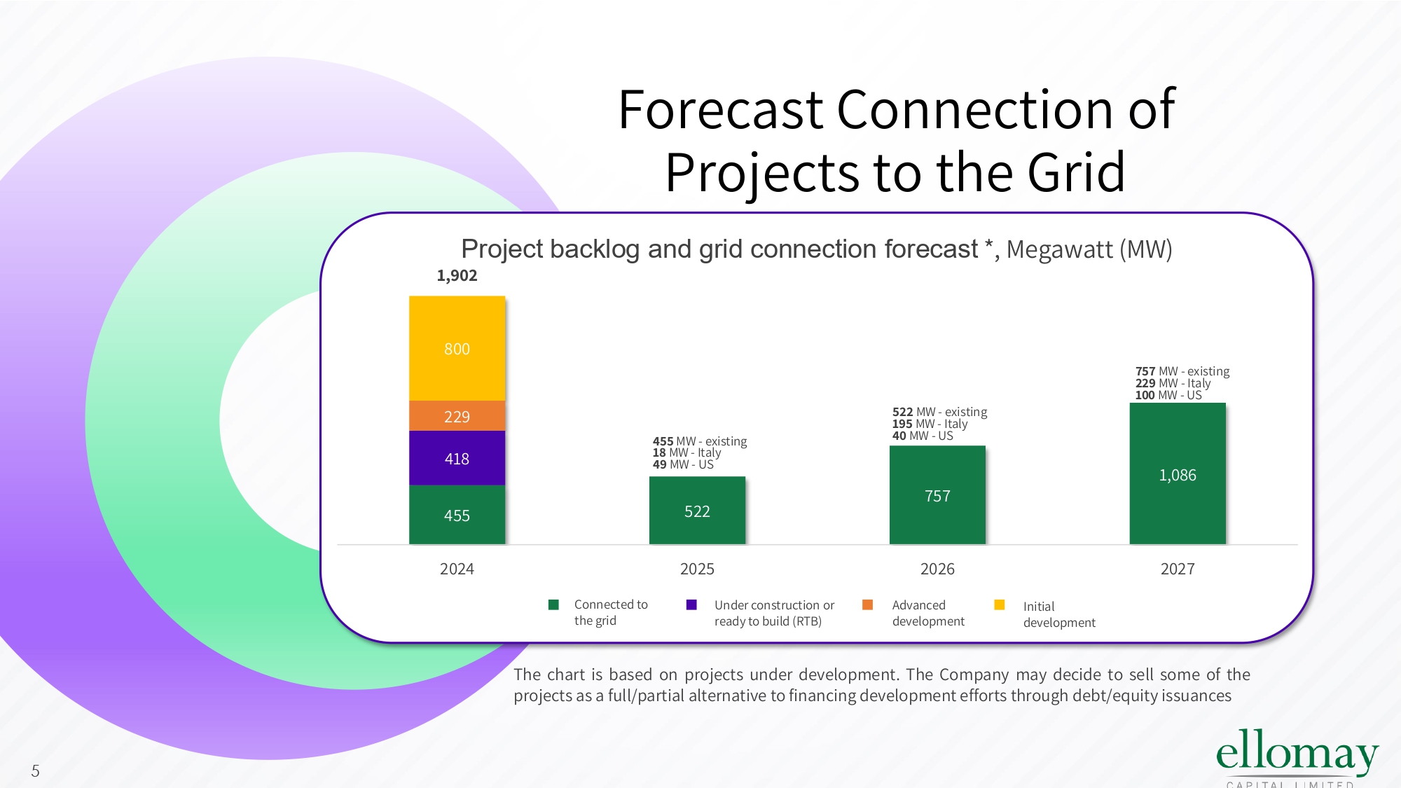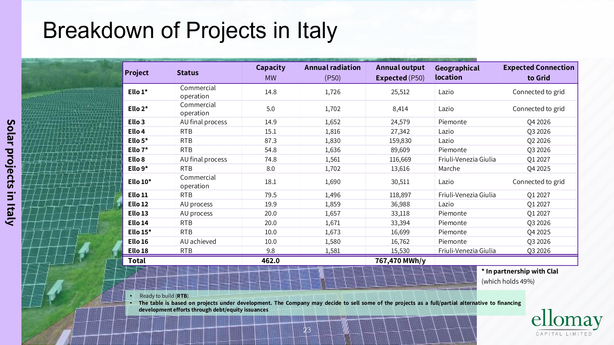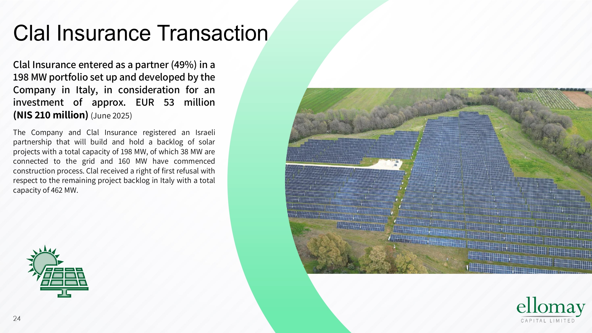 Clal Insurance Transaction Clal Insurance entered as a partner ( 49 % ) in a 198 MW portfolio set up and developed by the Company in Italy, in consideration for an investment of approx . EUR 53 million (NIS 210 million) (June 2025 ) The Company and Clal Insurance registered an Israeli partnership that will build and hold a backlog of solar projects with a total capacity of 198 MW, of which 38 MW are connected to the grid and 160 MW have commenced construction process . Clal received a right of first refusal with respect to the remaining project backlog in Italy with a total capacity of 462 MW . 24