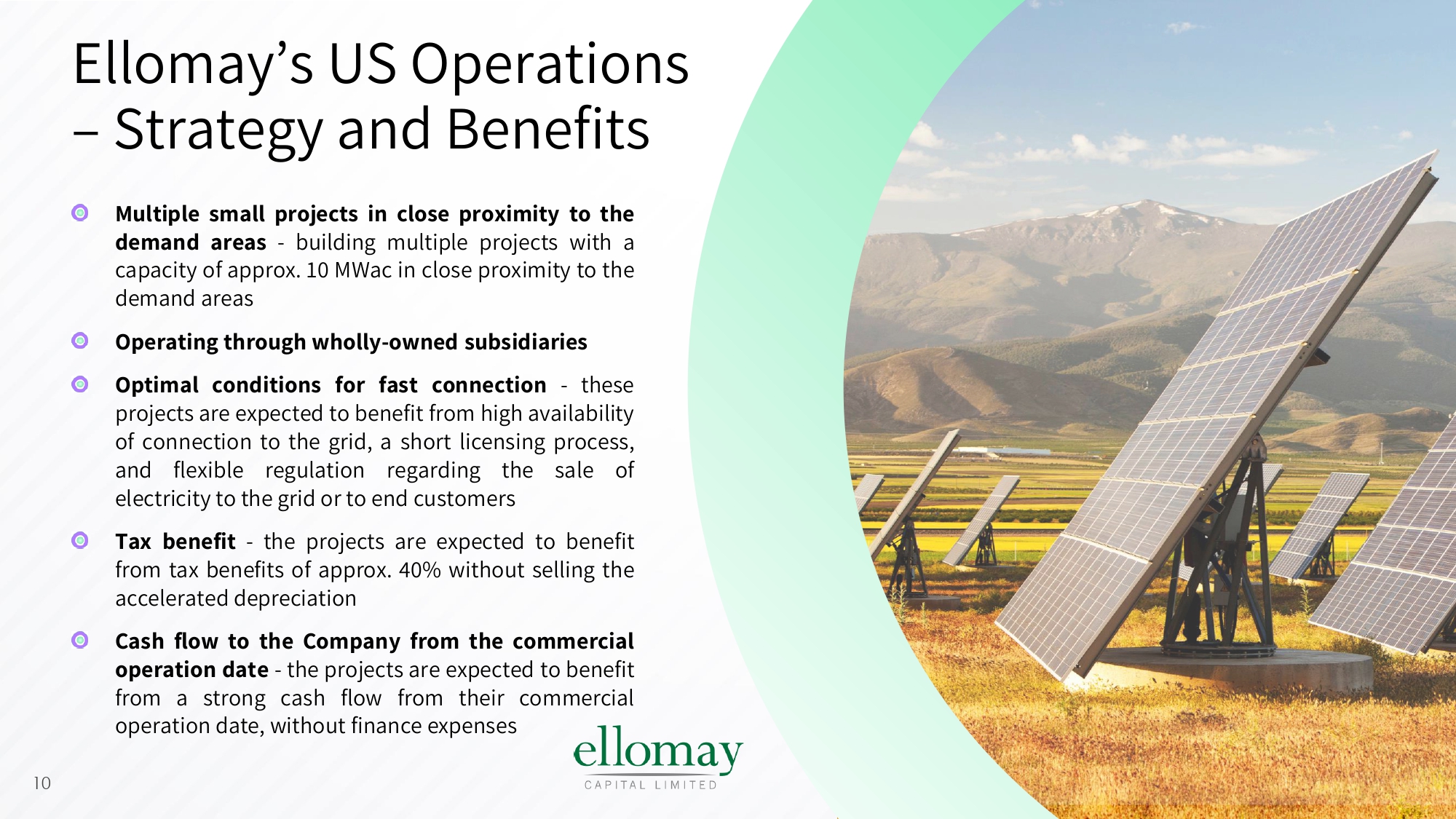 Solar Operations in the Dallas Metropolitan Area Under the Distributed Generation Regulation Expected net investment €M Expected proceeds from sale of the ITCs 2 €M Expected cost €M Expected annual EBITDA* 1 €M Expected annual revenues €M Capacity MW / MWh Expected date of connection to the grid % of ownership Project 9.8 5.1 14.9 1.0 1.3 13.44 Connected 100% Fairfield 10.1 5.4 15.5 1.0 1.4 13.92 Connected 100% Malakoff 9.4 4.3 13.7 0.6 0.9 11.10 Q3 2025 100% Mexia 8.5 3.7 12.2 0.6 0.8 10.50 Q3 2025 100% Talco 14.0 6.8 20.8 1.5 2.3 PV 14, BESS 31 Q2 2026 100% Hillsboro 51.8 25.3 77.1 4.8 6.7 63.0 + storage Total 49 MW Connected / Pre - connection + 40 MW Under advanced planning 9 1. For a full year of operation 2. The Company signed an agreement for the sale of the tax benefits in the first four projects for a total of approx. USD 19 million * EBITDA is a non - IFRS measure. The Company is unable to provide a reconciliation between the EBITDA and the net income / loss on a forward - looking basis without unreasonable efforts, since items that affect this financial measure, which is non - IFRS, is not under the Company’s control and/or may not be reasonably predicted. See Slide 2