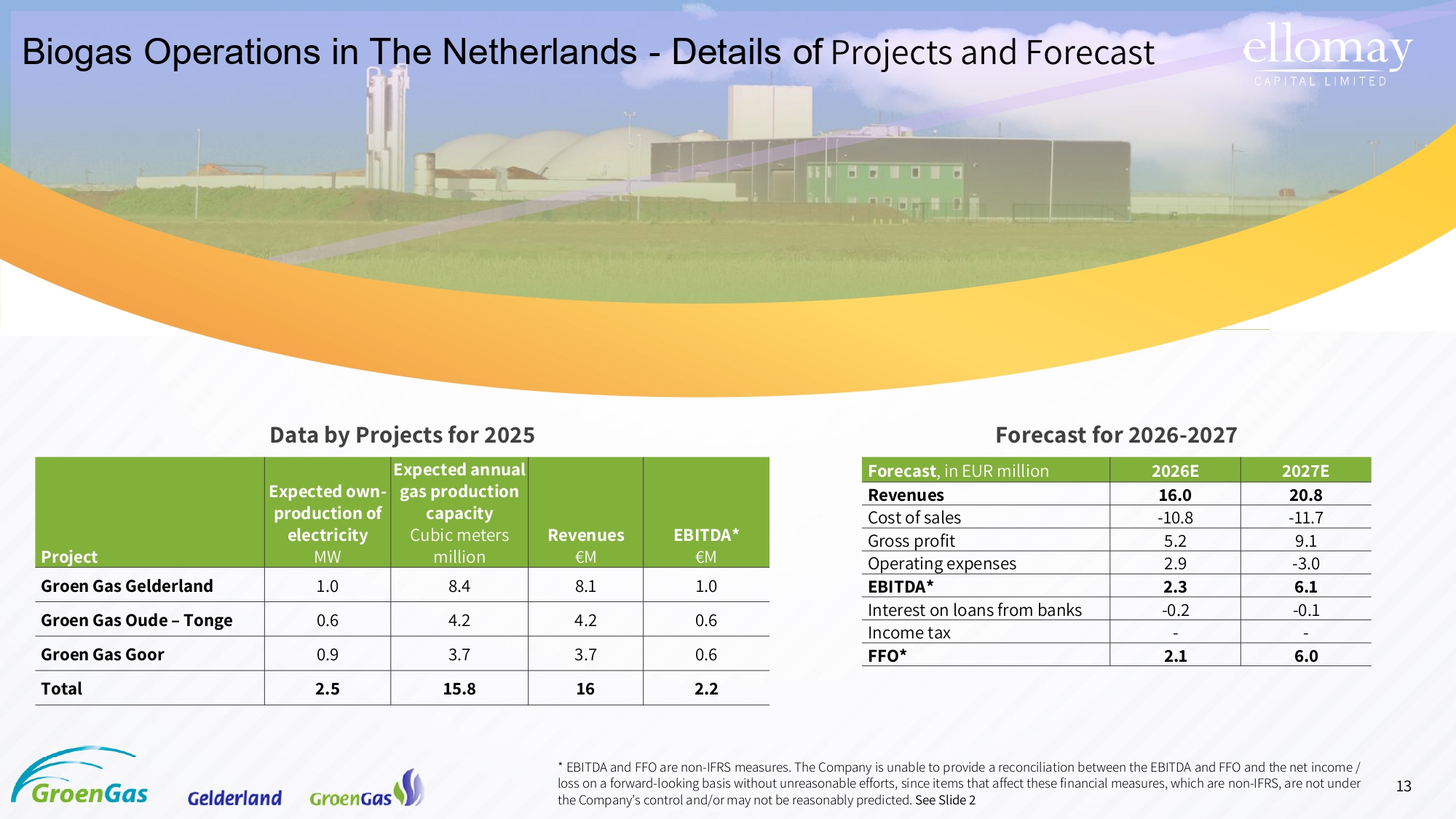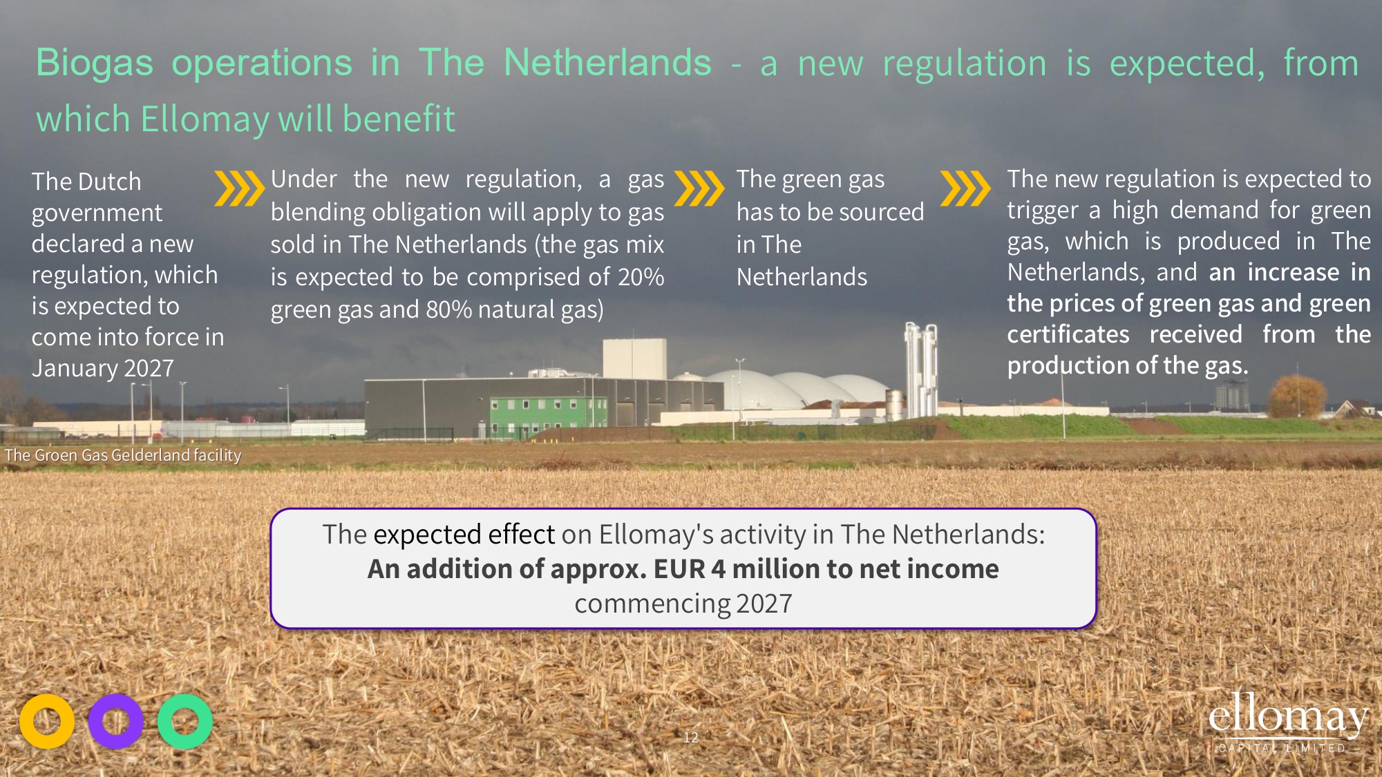 Biogas operations in The Netherlands - a new regulation is expected, from which Ellomay will benefit The Dutch government declared a new regulation, which is expected to come into force in January 2027 Under the new regulation, a gas blending obligation will apply to gas sold in The Netherlands (the gas mix is expected to be comprised of 20 % green gas and 80 % natural gas) The green gas has to be sourced in The Netherlands The new regulation is expected to trigger a high demand for green gas, which is produced in The Netherlands, and an increase in the prices of green gas and green certificates received from the production of the gas . The Groen Gas Gelderland facility The expected effect on Ellomay's activity in The Netherlands: An addition of approx. EUR 4 million to net income commencing 2027 12