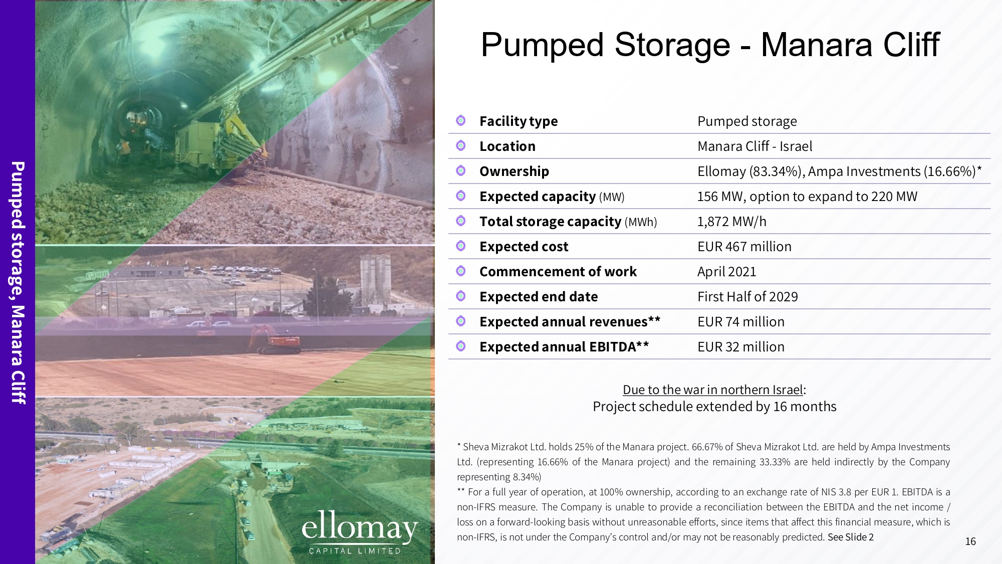 Pumped Storage - Manara Cliff Facility type Pumped storage Location Manara Cliff - Israel Ownership Ellomay (83.34%), Ampa Investments (16.66%)* Expected capacity (MW) 156 MW, option to expand to 220 MW Total storage capacity (MWh) 1,872 MW/h Expected cost EUR 467 million Commencement of work April 2021 Expected end date First Half of 2029 Expected annual revenues** EUR 74 million Pumped storage, Manara Cliff 16 Expected annual EBITDA** EUR 32 million Due to the war in northern Israel : Project schedule extended by 16 months * Sheva Mizrakot Ltd . holds 25 % of the Manara project . 66 . 67 % of Sheva Mizrakot Ltd . are held by Ampa Investments Ltd . (representing 16 . 66 % of the Manara project) and the remaining 33 . 33 % are held indirectly by the Company representing 8 . 34 % ) ** For a full year of operation, at 100 % ownership, according to an exchange rate of NIS 3 . 8 per EUR 1 . EBITDA is a non - IFRS measure . The Company is unable to provide a reconciliation between the EBITDA and the net income / loss on a forward - looking basis without unreasonable efforts, since items that affect this financial measure, which is non - IFRS, is not under the Company’s control and/or may not be reasonably predicted . See Slide 2