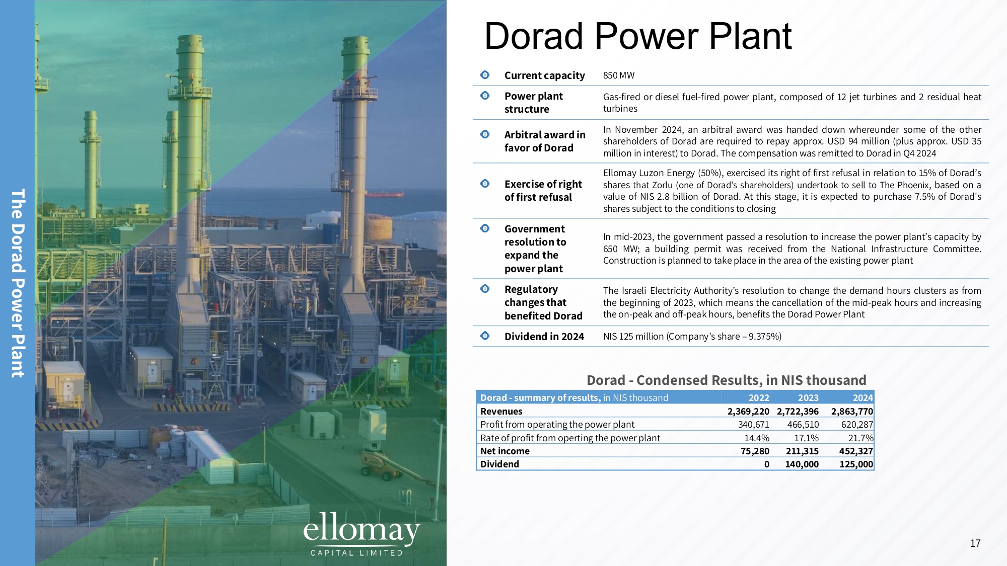 The Dorad Power Plant 17 Dorad Power Plant Current capacity 850 MW Power plant structure Gas - fired or diesel fuel - fired power plant, composed of 12 jet turbines and 2 residual heat turbines Arbitral award in favor of Dorad In November 2024 , an arbitral award was handed down whereunder some of the other shareholders of Dorad are required to repay approx . USD 94 million (plus approx . USD 35 million in interest) to Dorad . The compensation was remitted to Dorad in Q 4 2024 Exercise of right of first refusal Ellomay Luzon Energy ( 50 % ), exercised its right of first refusal in relation to 15 % of Dorad’s shares that Zorlu (one of Dorad’s shareholders) undertook to sell to The Phoenix , based on a value of NIS 2 . 8 billion of Dorad . At this stage, it is expected to purchase 7 . 5 % of Dorad's shares subject to the conditions to closing Government resolution to expand the power plant In mid - 2023 , the government passed a resolution to increase the power plant ’ s capacity by 650 MW ; a building permit was received from the National Infrastructure Committee . Construction is planned to take place in the area of the existing power plant Regulatory changes that benefited Dorad The Israeli Electricity Authority’s resolution to change the demand hours clusters as from the beginning of 2023 , which means the cancellation of the mid - peak hours and increasing the on - peak and off - peak hours, benefits the Dorad Power Plant Dividend in 2024 NIS 125 million (Company’s share – 9.375%) Dorad - Condensed Results, in NIS thousand 2024 2023 2022 Dorad - summary of results, in NIS thousand 2,863,770 2,722,396 2,369,220 Revenues 620,287 466,510 340,671 Profit from operating the power plant 21.7% 17.1% 14.4% Rate of profit from operting the power plant 452,327 211,315 75,280 Net income 125,000 140,000 0 Dividend