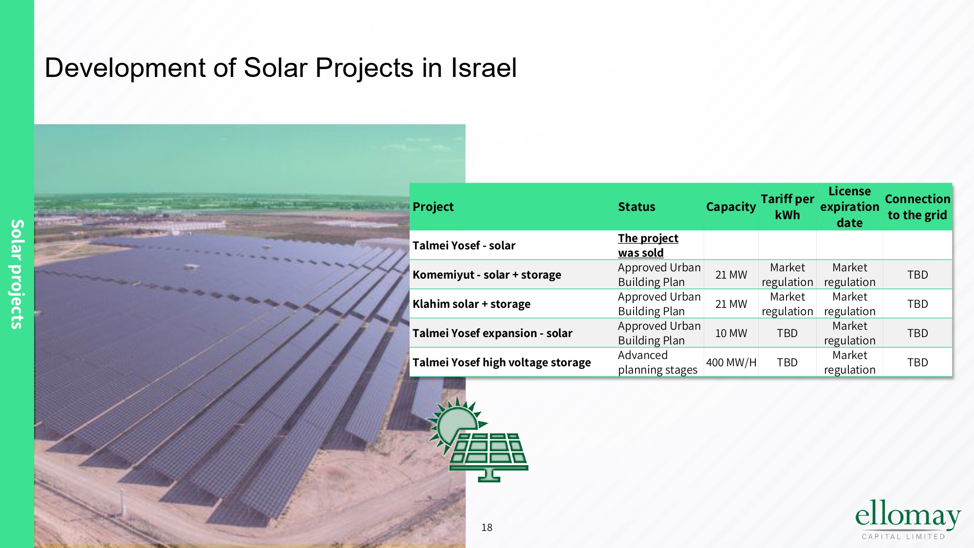 Development of Solar Projects in Israel Solar projects Project Status Capacity Tariff per kWh License date Connection expiration to the grid Talmei Yosef - solar The project was sold Komemiyut - solar + storage Approved Urban Building Plan 21 MW Market regulation Market regulation TBD Klahim solar + storage Approved Urban Building Plan 21 MW Market regulation Market regulation TBD Talmei Yosef expansion - solar Approved Urban Building Plan 10 MW TBD Market regulation TBD Talmei Yosef high voltage storage Advanced planning stages 400 MW/H TBD Market regulation TBD 18