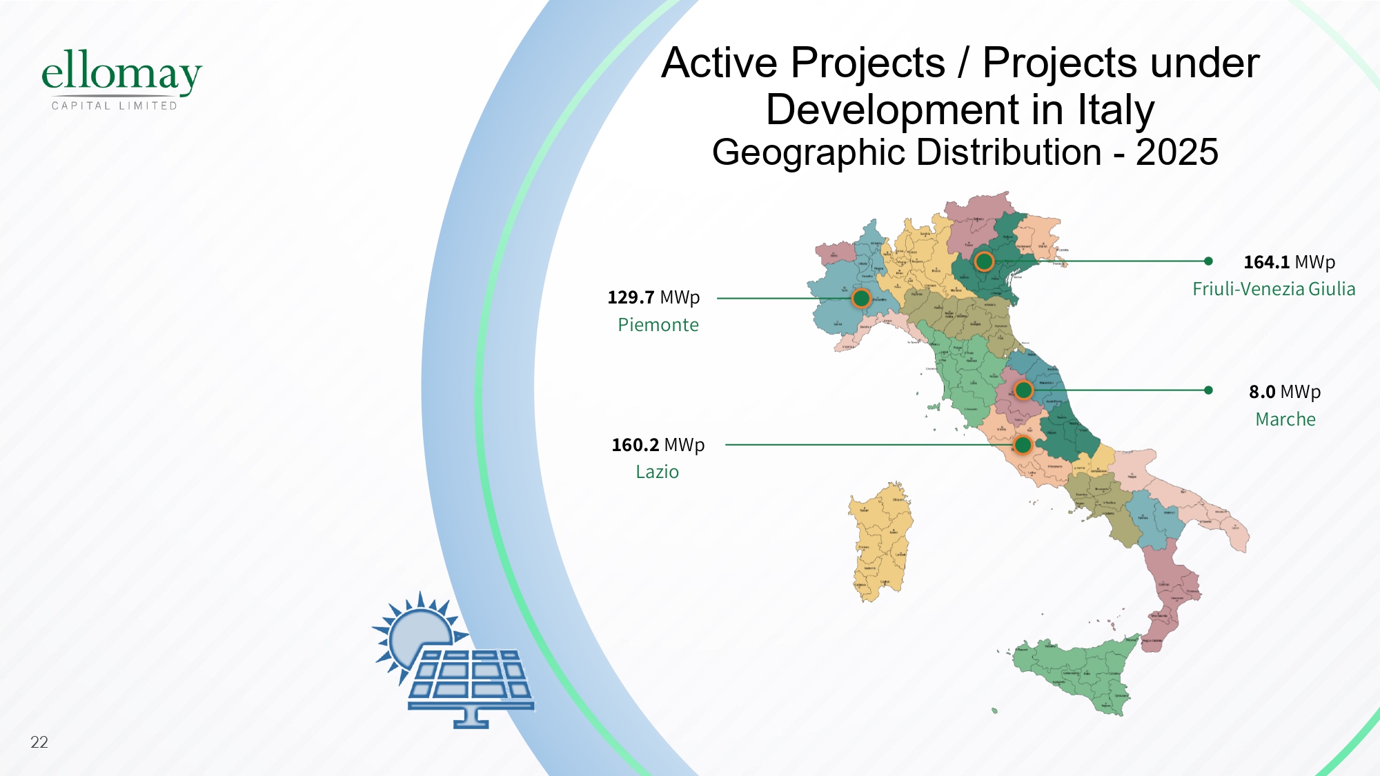 A ctive Projects / Projects under Development in Italy Geographic Distribution - 2025 164.1 MWp Friuli - Venezia Giulia 8.0 MWp Marche 129.7 MWp Piemonte 160.2 MWp Lazio 22