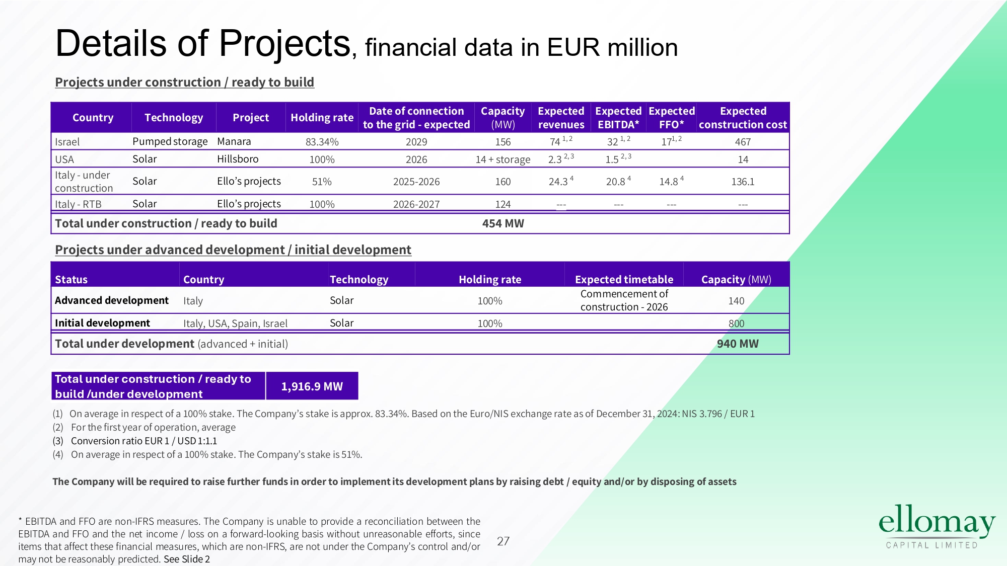 26 Details of Projects , financial data in EUR million Connected Projects – F orecast for 2025 Expected principal repayment Expected interest expenses Expected debt As of December 31, 2025 Expected FFO* Expected EBITDA* Expected revenues Capacity (MW) License Holding rate Project Technology Country 7.0 4.5 145.4 10.3 2 14.9 21.3 300 Indefinite 51% Talasol 1 Solar Spain 1.0 0.4 10.3 0.8 1.2 2.1 7.9 2041 100% Rodríguez 1&2, Seguisolar and La Rinconada Solar Spain 0.5 0.5 9.2 0.8 1.3 2 28 Indefinite 100% Ellomay Solar Solar Spain 4.3 5.1 6 38 Indefinite 51% Ellomay Solar Italy 1&2&10 3 Solar Italy 1.5 0.3 5.0 1.9 2.2 16 19 Indefinite 100% 3 facilities Biogas The Netherlands 7.0 4.0 43.0 14.0 20.0 74.0 80 5 2034 9.375% Dorad 4 Power plant Israel 3.2 3.2 4.4 50 Indefinite 100% 4 projects 6 Solar USA 17.0 9.7 212.9 35.3 47.9 125.8 522.9 Total connected (1) In respect of a 100% stake. Company’s share constitutes 51% (2) Excluding approx. EUR 2 million in interest on loans advanced by minority interests of Talasol (3) Forecasts per representative year. In respect of a 100% stake. Company’s share constitutes 51% (4) The data represent the Company’s share (9.375%) based on the Euro/NIS exchange rate as of December 31, 2024: NIS 3.796 / EUR 1. (5) Company’s share (Dorad’s capacity on a 100% basis - 850 MW) (6) Forecasts per representative year. * EBITDA and FFO are non - IFRS measures . The Company is unable to provide a reconciliation between the EBITDA and FFO and the net income / loss on a forward - looking basis without unreasonable efforts, since items that affect these financial measures, which are non - IFRS, are not under the Company’s control and/or may not be reasonably predicted . See Slide 2