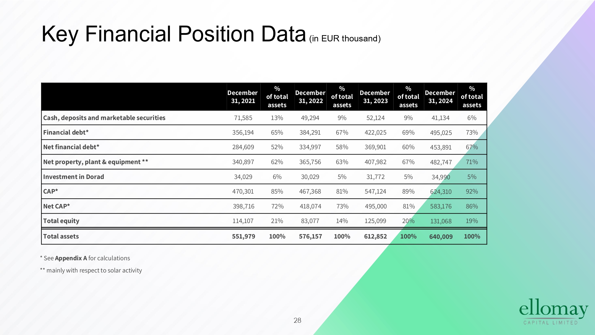 Key Financial Position Data (in EUR thousand) % of total assets December 31, 2024 % of total assets December 31, 2023 % of total assets December 31, 2022 % of total assets December 31, 2021 6% 41,134 9% 52,124 9% 49,294 13% 71,585 Cash, deposits and marketable securities 73% 495,025 69% 422,025 67% 384,291 65% 356,194 Financial debt* 67% 453,891 60% 369,901 58% 334,997 52% 284,609 Net financial debt* 71% 482,747 67% 407,982 63% 365,756 62% 340,897 Net property, plant & equipment ** 5% 34,990 5% 31,772 5% 30,029 6% 34,029 Investment in Dorad 92% 624,310 89% 547,124 81% 467,368 85% 470,301 CAP* 86% 583,176 81% 495,000 73% 418,074 72% 398,716 Net CAP* 19% 131,068 20% 125,099 14% 83,077 21% 114,107 Total equity 100% 640,009 100% 612,852 100% 576,157 100% 551,979 Total assets 28 * See Appendix A for calculations ** mainly with respect to solar activity