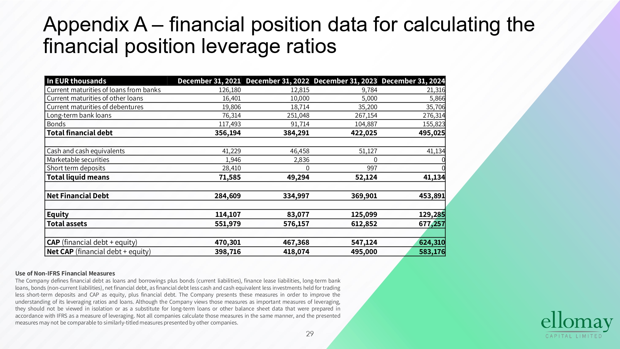 Appendix A – financial position data for calculating the financial position leverage ratios December 31, 2024 December 31, 2023 December 31, 2022 December 31, 2021 In EUR thousands 21,316 9,784 12,815 126,180 Current maturities of loans from banks 5,866 5,000 10,000 16,401 Current maturities of other loans 35,706 35,200 18,714 19,806 Current maturities of debentures 276,314 267,154 251,048 76,314 Long - term bank loans 155,823 104,887 91,714 117,493 Bonds 495,025 422,025 384,291 356,194 Total financial debt 41,134 51,127 46,458 41,229 Cash and cash equivalents 0 0 2,836 1,946 Marketable securities 0 997 0 28,410 Short term deposits 41,134 52,124 49,294 71,585 Total liquid means 453,891 369,901 334,997 284,609 Net Financial Debt 129,285 125,099 83,077 114,107 Equity 677,257 612,852 576,157 551,979 Total assets 624,310 547,124 467,368 470,301 CAP (financial debt + equity) 583,176 495,000 418,074 398,716 Net CAP (financial debt + equity) Use of Non - IFRS Financial Measures The Company defines financial debt as loans and borrowings plus bonds (current liabilities), finance lease liabilities, long - term bank loans, bonds (non - current liabilities), net financial debt, as financial debt less cash and cash equivalent less investments held for trading less short - term deposits and CAP as equity, plus financial debt . The Company presents these measures i n order to improve the understanding of its leveraging ratios and loans . Although the Company views those measures as important measures of leveraging, they should not be viewed i n isolation or as a substitute for long - term loans or other balance sheet data that were prepared in accordance with IFRS as a measure of leveraging . Not all companies calculate those measures i n the same manner, and the presented measures may not be comparable to similarly - titled measures presented by other companies . 29