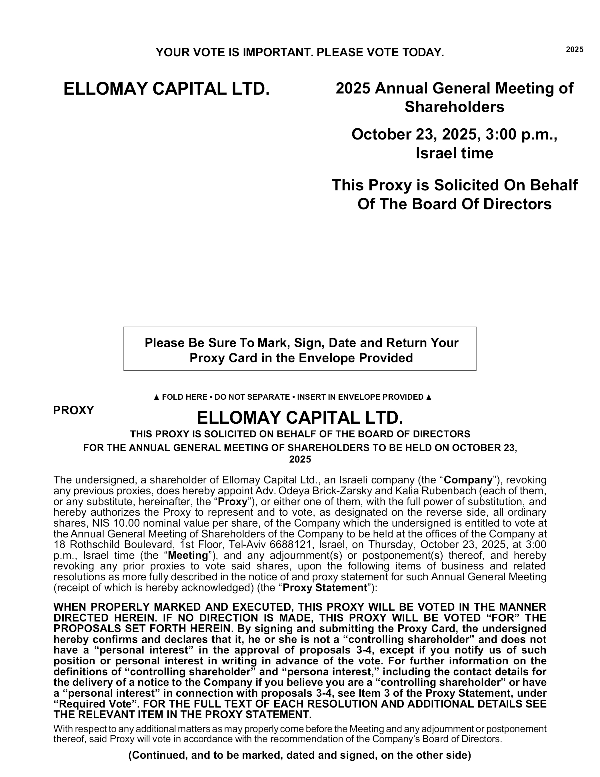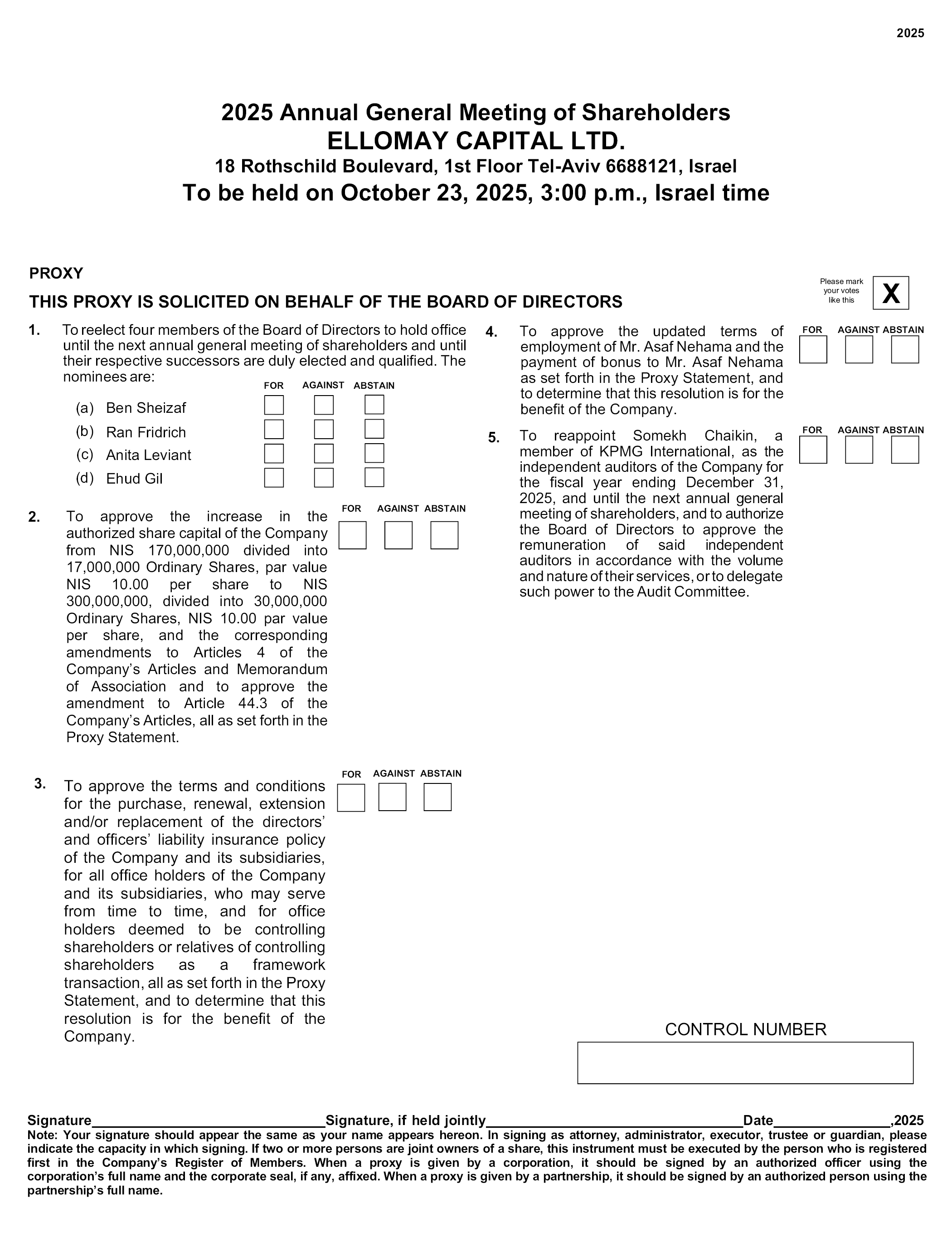 2025 Annual General Meeting of Shareholders ELLOMAY CAPITAL LTD. 18 Rothschild Boulevard, 1st Floor Tel-Aviv 6688121, Israel To be held on October 23, 2025, 3:00 p.m., Israel time PROXY 1. To reelect four members of the Board of Directors to hold office until the next annual general meeting of shareholders and until their respective successors are duly elected and qualified. The (a) Ben Sheizaf (b) Ran Fridrich (c) Anita Leviant (d) Ehud Gil 2. To approve the increase in the authorized share capital of the Company from NIS 170,000,000 divided into 17,000,000 Ordinary Shares, par value NIS 10.00 per share to NIS 300,000,000, divided into 30,000,000 Ordinary Shares, NIS 10.00 par value per share, and the corresponding amendments to Articles 4 of the Company’s Articles and Memorandum of Association and to approve the amendment to Article 44.3 of the Company’s Articles, all as set forth in the Proxy Statement. 3. To approve the terms and conditions for the purchase, renewal, extension and/or replacement of the directors’ and officers’ liability insurance policy of the Company and its subsidiaries, for all office holders of the Company and its subsidiaries, who may serve from time to time, and for office holders deemed to be controlling shareholders or relatives of controlling shareholders as a framework transaction, all as set forth in the Proxy Statement, and to determine that this resolution is for the benefit of the Company. 4. To reappoint Somekh Chaikin, a member of KPMG International, as the independent auditors of the Company for the fiscal year ending December 31, 2025, and until the next annual general meeting of shareholders, and to authorize the Board of Directors to approve the remuneration of said independent auditors in accordance with the volume and nature of their services, or to delegate such power to the Audit Committee. To approve the updated terms of employment of Mr. Asaf Nehama and the payment of bonus to Mr. Asaf Nehama as set forth in the Proxy Statement, and to determine that this resolution is for the benefit of the Company. 5. To reappoint Somekh Chaikin, a member of KPMG International, as the independent auditors of the Company for the fiscal year ending December 31, 2025, and until the next annual general meeting of shareholders, and to authorize the Board of Directors to approve the remuneration of said independent auditors in accordance with the volume and nature of their services, or to delegate such power to the Audit Committee. CONTROL NUMBER FOR AGAINST ABSTAIN Signature Signature, if held jointly Date ,2025 Note: Your signature should appear the same as your name appears hereon. In signing as attorney, administrator, executor, trustee or guardian, please indicate the capacity in which signing. If two or more persons are joint owners of a share, this instrument must be executed by the person who is regis- tered first in the Company’s Register of Members. When a proxy is given by a corporation, it should be signed by an authorized officer using the corpo- ration’s full name and the corporate seal, if any, affixed. When a proxy is given by a partnership, it should be signed by an authorized person using the partnership’s full name.