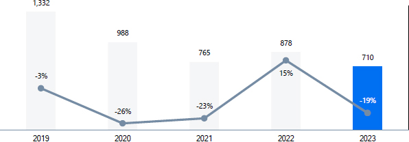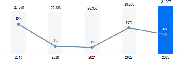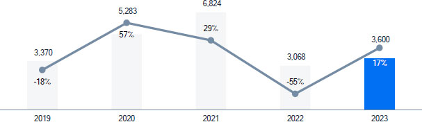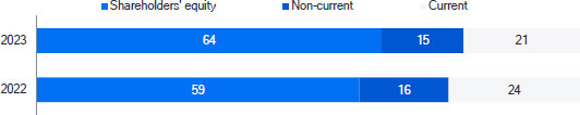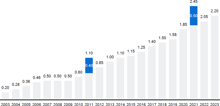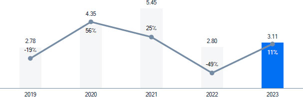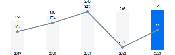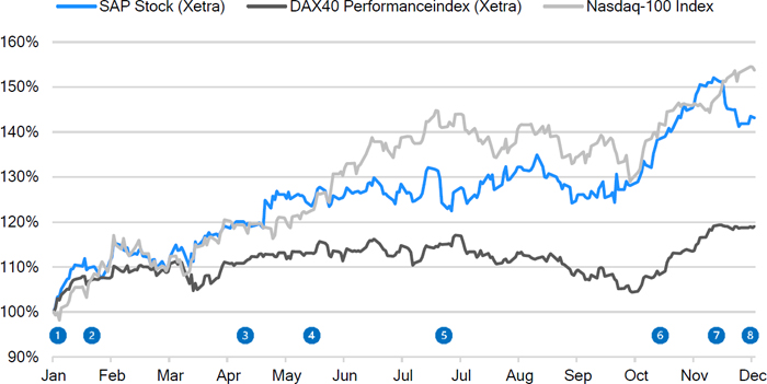 Driven by the Company’s excellent results and an overall positive market mood, particularly for tech companies, SAP’s stock soared in 2023. Towards the end of the year that also marked the 25th anniversary of our U.S. stock market listing, SAP stock reached a new all-time high at €148.18 per share. The share price increased 43.2% in total over the course of 2023 – more than double the development of the DAX, which gained 19.1%. The Nasdaq-100 appreciated by 54.9% in the same time frame. SAP also regained its position as the most valuable company among the DAX 40 in February 2023, and ended the year with a market capitalization of €171 billion on December 31, 2023.